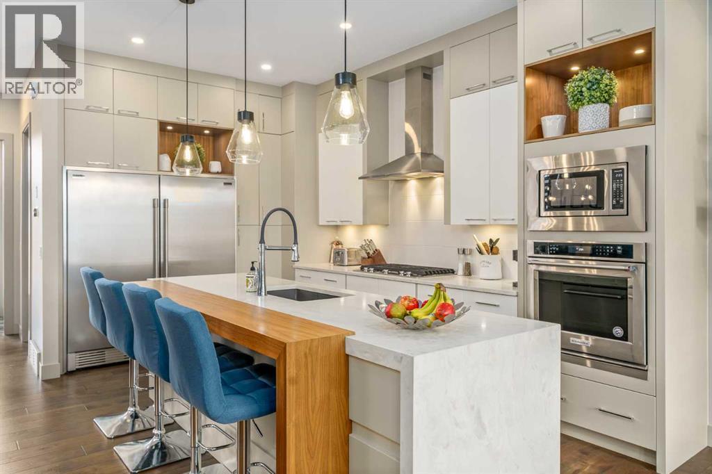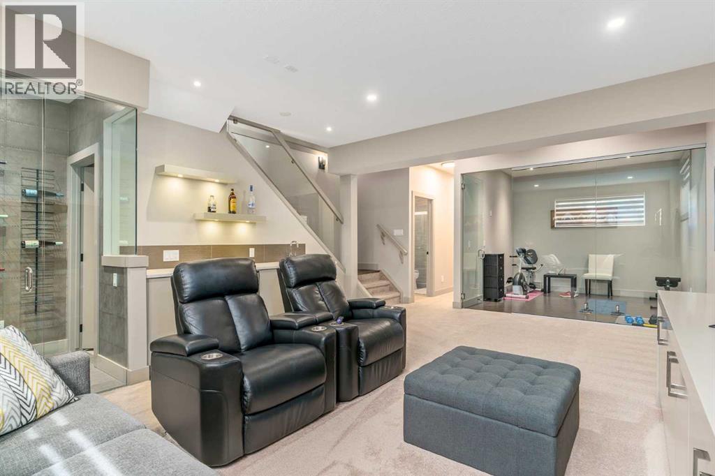 Pride of ownership is evident throughout this meticulously maintained, modern infill, located in one of Calgary’s most desirable inner-city communities. The thoughtfully designed floor plan sets this home apart, with the living room situated at the front of the house and a spacious dining area off the kitchen. A dedicated home office, half bath and a full mudroom with built-in seating and storage complete the main floor layout. The main floor impresses with wide plank distressed hardwood and 10 ft Level 5 painted ceilings and an expansive gas fireplace. The open-concept kitchen features a 10 ft island with thick quartz countertops, a waterfall edge and wood detailing. The high end KitchenAid appliance package includes a massive double wide fridge/freezer, built-in oven and microwave, 5-burner gas cooktop, and dishwasher. Custom soft close cabinetry extends to the ceiling, offering abundant storage solutions. Throughout the home you’ll find designer touches including a glass wall and glass stair railings on all three levels. Solid core 8 ft interior doors on the main and upper level add a sense of quiet luxury and improved soundproofing. A built-in Vacuflo system with a kitchen kick pan adds everyday convenience.The upper level offers three generously sized bedrooms, a convenient laundry room, and a bright bonus room at the front of the home. The luxurious primary suite includes a spacious walk-in closet and a spa-inspired en-suite featuring a soaker tub and an oversized shower with rain head.The fully finished basement features a glass-enclosed home gym & wine room, a wet bar with wine fridge, a home theatre space, a guest bedroom, and a full bathroom with heated floors. Enjoy outdoor living in the spacious backyard, featuring a large patio perfect for entertaining. A gas bbq hookup makes outdoor cooking a breeze while the low maintenance yard offers just the right amount of green space for kids, pets or a garden. The double detached garage is insulated and drywalled.Enjoy easy access to the Westbrook CTrain station, grocery stores, restaurants, public library, public pool, schools, parks, and the Shaganappi Point Golf Course. Outdoor enthusiasts will appreciate the nearby Shaganappi Community Association park, which features a skating rink, tennis courts and an off-leash dog park. Don't miss your chance to own this exceptional property, book your showing today! (id:6769