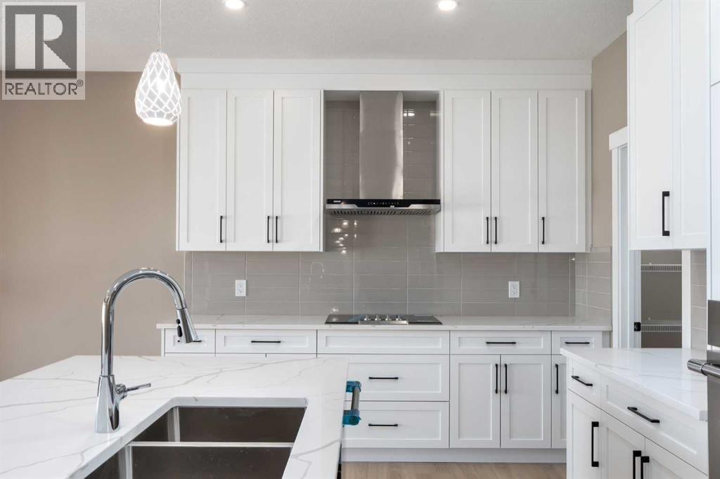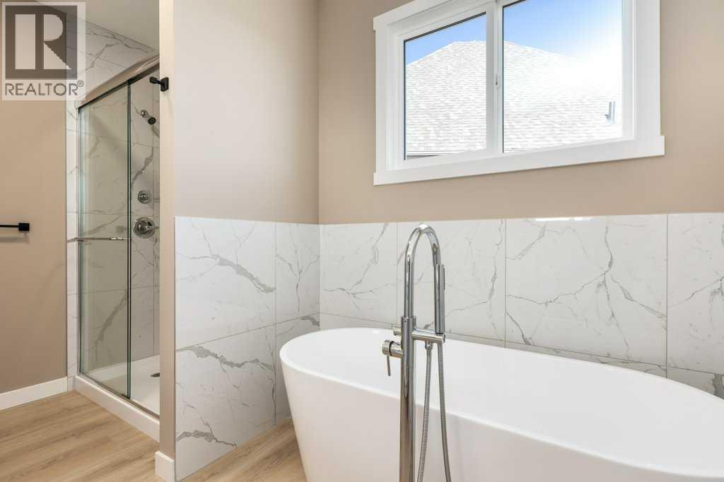 This is a brand new triple garage bungalow with a fully finished walkout basement. It is 1608 sq ft in a great area close to a beautiful waterway and park, and has premium finishes throughout. The main floor is a modern open plan with a wide entry hall, 9’ ceilings, high quality flooring, and a 25’ deck. The kitchen includes cabinets to the ceiling, quartz counters, under-mount sink, select tiles, and a large walk-in pantry. Also on the main floor is the spacious and open living / dining room, the primary bedroom, a laundry room, and a second bedroom or office. Deluxe appointments in the master suite include built in cabinetry in the walk-in closet, a double vanity, a freestanding soaker tub and a 6' shower. The lower level has three more spacious bedrooms and a very big family room with a built-in wet bar, a full bathroom and patio doors to a shady covered patio. All rooms in this home have lots of natural light, and there are many extras including a 8’ island in the kitchen, two fireplaces, and a Hardie board exterior. (id:6769
