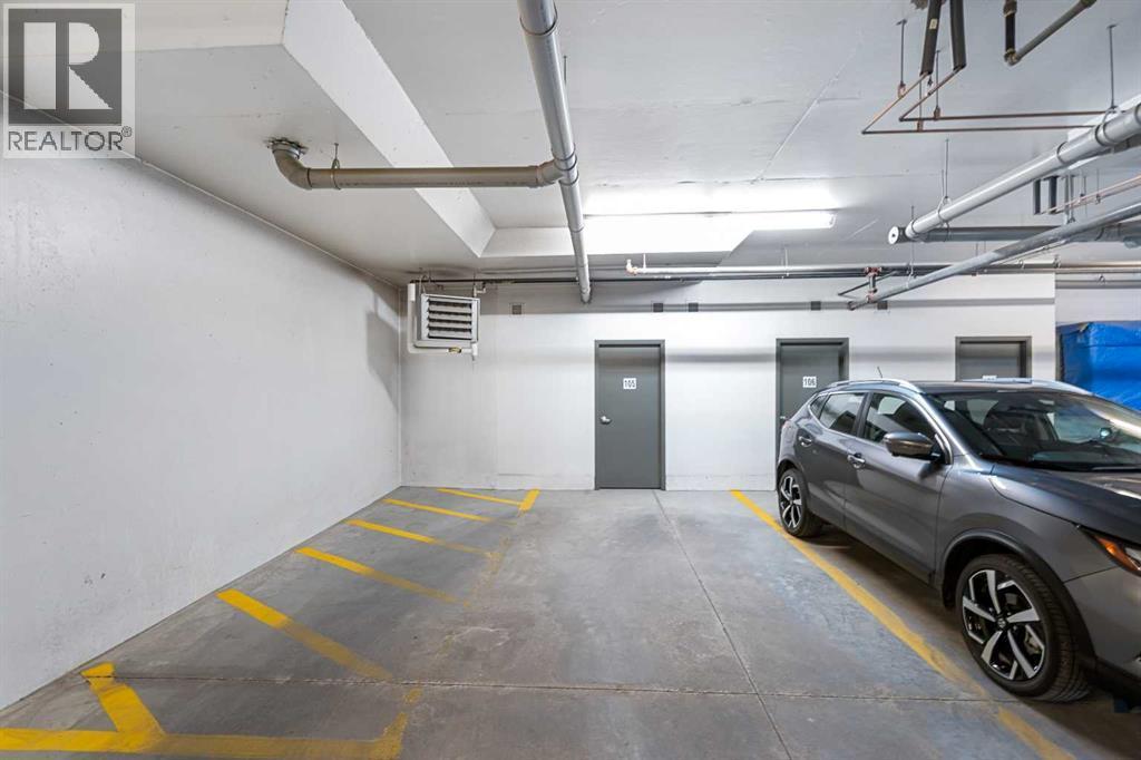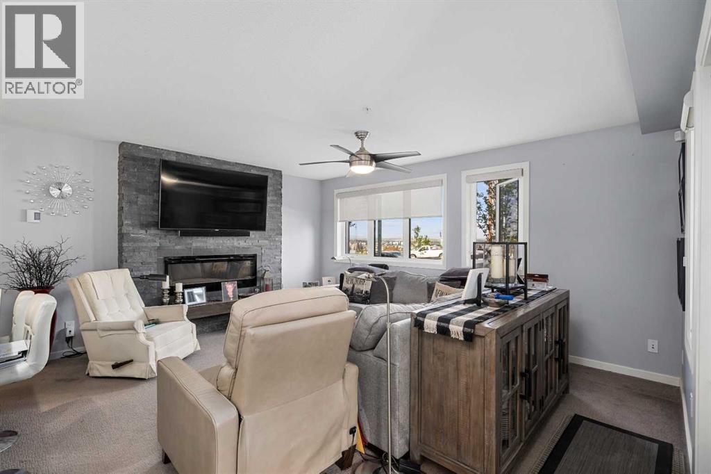 This beautifully maintained former show suite offers a rare 1,148 square feet of upgraded living space in a bright, corner layout with windows on two sides. Featuring 2 bedrooms, 2 full bathrooms, a den, a dining area, a large island with an eating bar, and in-suite laundry, this unit is both spacious and functional.Upgrades include tile flooring in the entryway, kitchen, and bathrooms, quartz countertops, top-of-the-line stainless steel appliances, a stylish backsplash, a custom window blind package, a full-wall fireplace treatment with a mantle, and central air conditioning for year-round comfort.A standout feature is the ability to enter your unit directly from the private balcony, with your second parking stall conveniently located just steps away from the patio door. The property also includes an oversized underground parking stall and a private, generously sized storage room measuring 4'8" wide, 8'5" deep, and 9'2" high.**Why Kincora?** Kincora is a peaceful, family-friendly community in Calgary’s northwest, offering scenic walking trails, green spaces, and convenient access to major routes like Stoney Trail. With nearby shopping and dining options at Creekside Shopping Centre and Sage Hill Crossing, it’s a perfect blend of tranquility and convenience. (id:6769