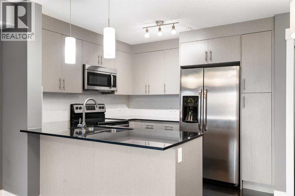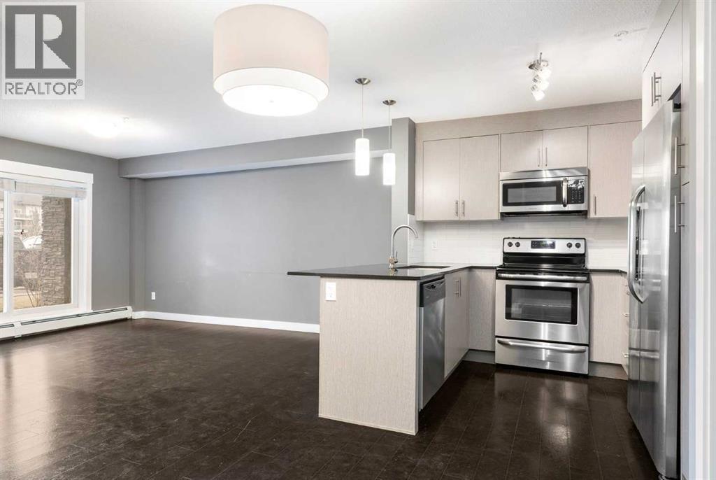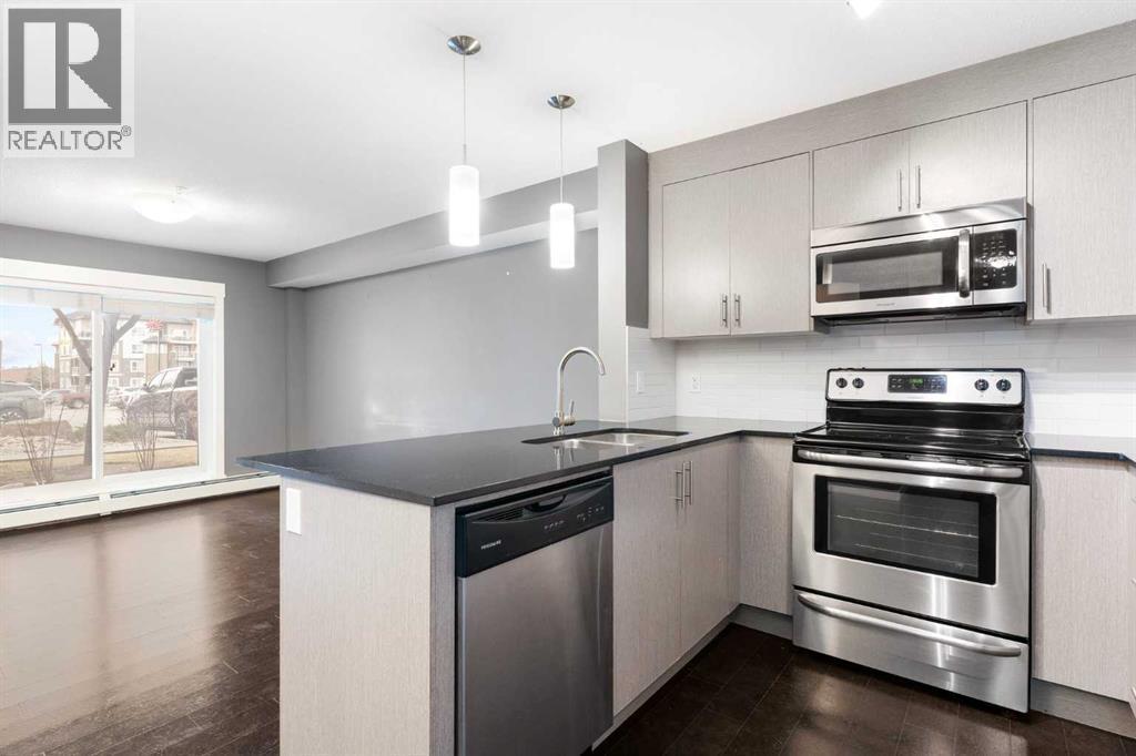 Check out this amazing two-bedroom, two-bathroom condo located on the ground floor. The unit is spacious, with an open-concept design. The kitchen has sleek black granite countertops, stainless steel appliances, and a large central island that is perfect for both cooking and entertaining. The large open living space has warm cork flooring that leads you to a patio with beautiful landscaping and a gas BBQ hook up. The massive primary bedroom has his and her closets and a four-piece bathroom. The second bedroom is a good size and close to the main bathroom. Every room is wired with fiber internet for shaw or telus. This unit also has a titled above-ground parking stall that is super convenient. Located across from the complex are Catholic and Public schools. There are also shops, bus stops, and playgrounds within walking distance. Come and view this amazing home in the beautiful community of Skyview Ranch. (id:6769