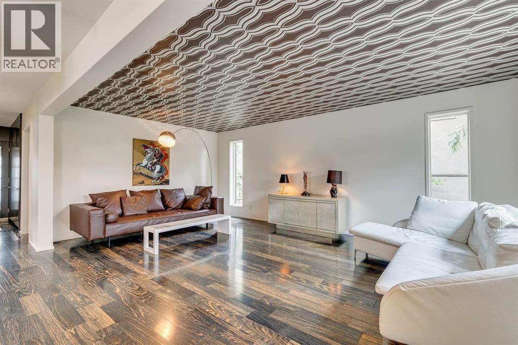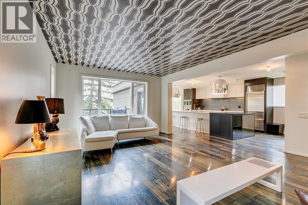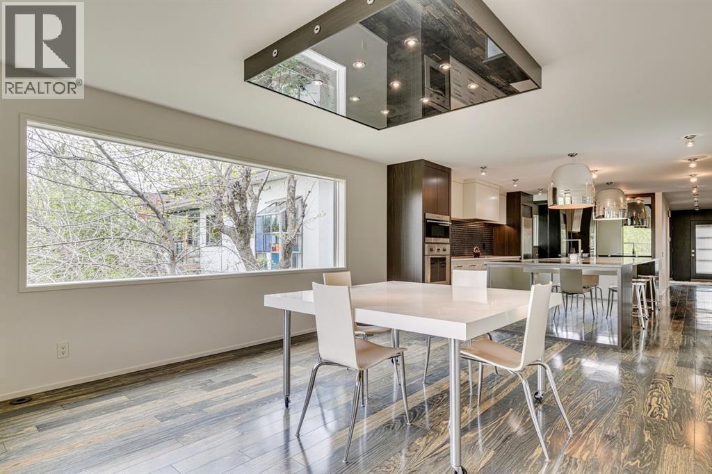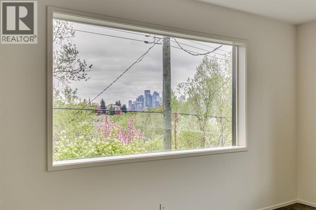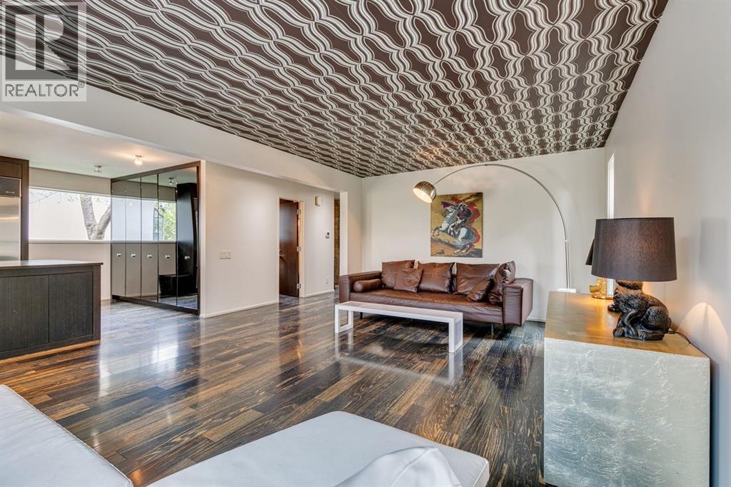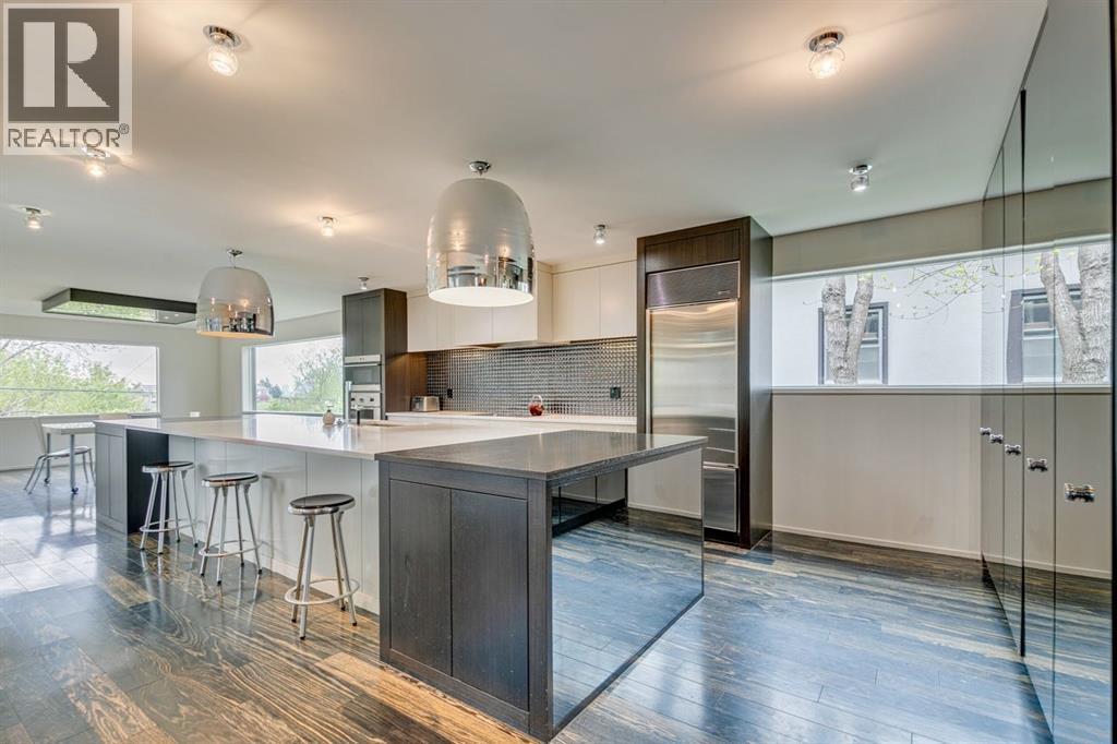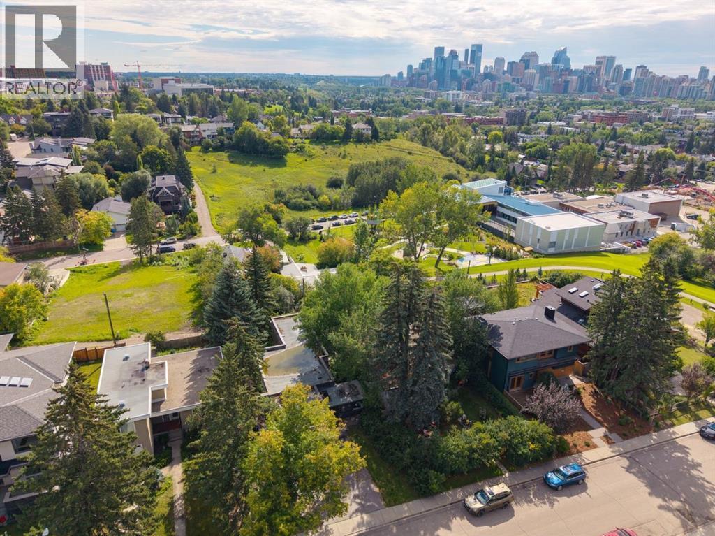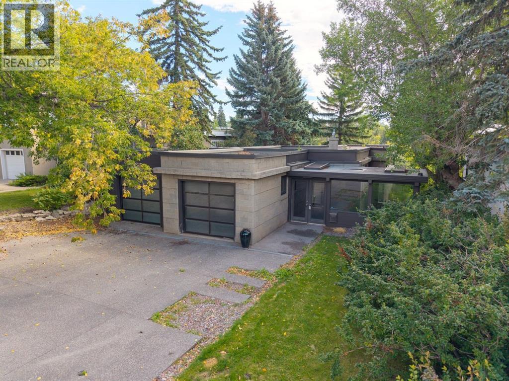A masterful modern renovation infused with the timeless elegance of 1950s design. Perched on a coveted ridge lot in prestigious Briar Hill, this exceptional hillside walk-out captivates from the moment you arrive. A lush canopy of mature trees and sculpted landscaping welcomes you, setting the tone for what lies beyond. Step into an expansive sunroom bathed in natural light, with soaring skylights and walls of glass that blur the line between indoors and nature. It's the perfect sanctuary to unwind—whether you're sipping a fine wine or indulging in a favourite novel, enveloped in serene beauty. Step into a grand foyer featuring sculptural concrete wall elements and a sleek glass-railed staircase that set the tone for sophisticated living. The front den offers a quiet retreat, while the expansive living room seamlessly flows toward the rear deck, perfectly framed by mature evergreens that provide unparalleled privacy. Crafted for both style and function, the kitchen and dining areas are an entertainer’s dream. The kitchen exudes contemporary glamour with pristine white cabinetry, a mirrored pantry and backsplash, and mid-century lighting. An oversized eat-up island anchors the space, offering abundant storage, while a suite of top-tier appliances, including a Viking wall oven, Miele microwave and dishwasher, a Sub-Zero refrigerator, and a Gaggenau cooktop complete the look. The adjoining dining room is truly impressive in scale and design, offering sweeping views of the Downtown skyline, a stunning backdrop for unforgettable gatherings. Descending to the lower level, you're greeted by rich hardwood floors and subtle stair lighting that create an inviting ambiance. This level is thoughtfully designed as a private retreat, with dedicated spaces for work and rest. The sophisticated home office is enclosed with smoked glass doors and enhanced by custom built-in cabinetry, while a striking feature wall conceals cleverly integrated storage. Three generously sized bedrooms are tucked away on this level, along with a beautifully appointed full bathroom. The primary suite is set apart for ultimate seclusion, enveloped by expansive windows that frame the surrounding landscape. Indulge in a lavish ensuite featuring a deep soaker tub, a sleek glass enclosed shower, and a fully customized walk-in closet—crafted for both luxury and functionality. For the gardening enthusiast, the secluded rear and side yards offer a canvas to create your own private outdoor sanctuary; lush, serene, and tailored to your vision. Thoughtfully integrated into the design, an expansive under deck storage area provides a secure and discreet solution for all your seasonal essentials, ensuring both elegance and practicality are maintained. This Homs is truly in an unbeatable location ideally situated within walking distance to multiple recreational facilities, public transit, the downtown core, Kensington, SAIT, schools, and both the Foothills and The Alberta Children's Hospital. (id:6769