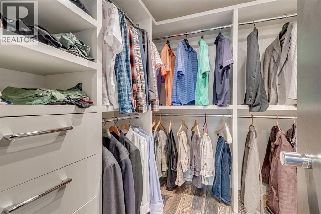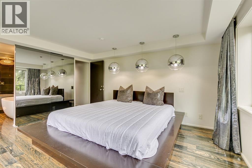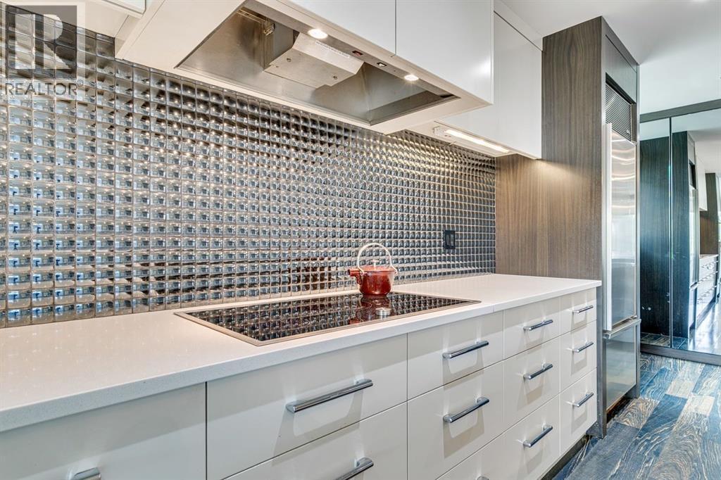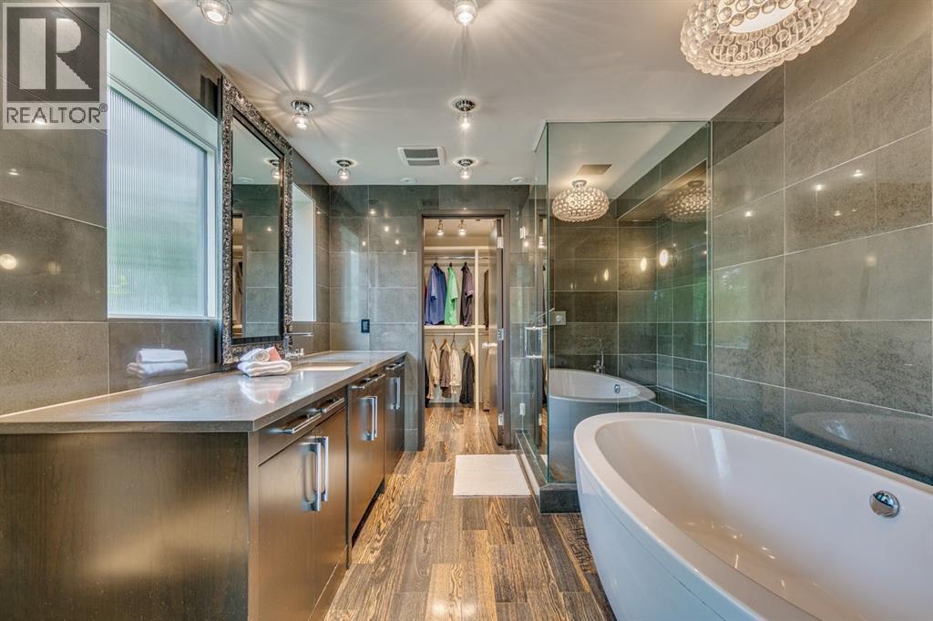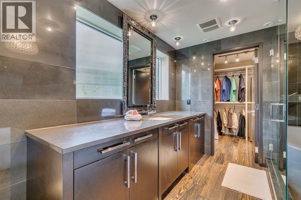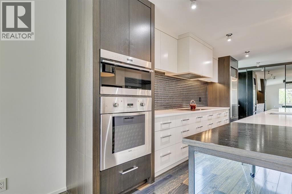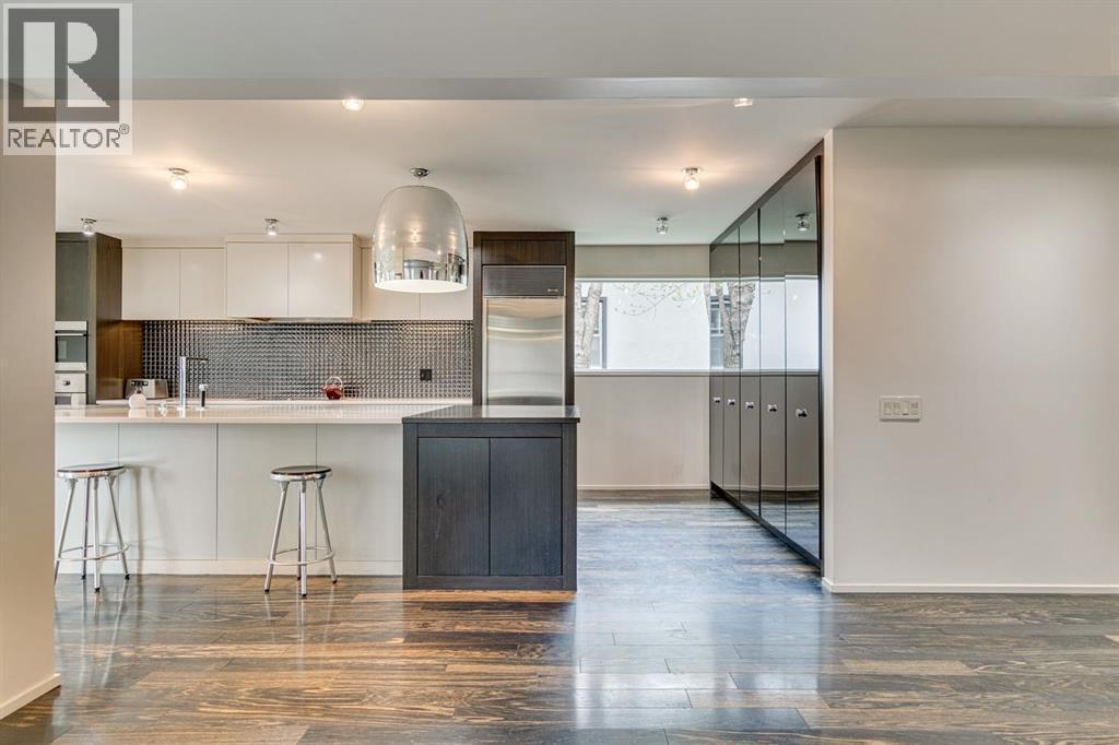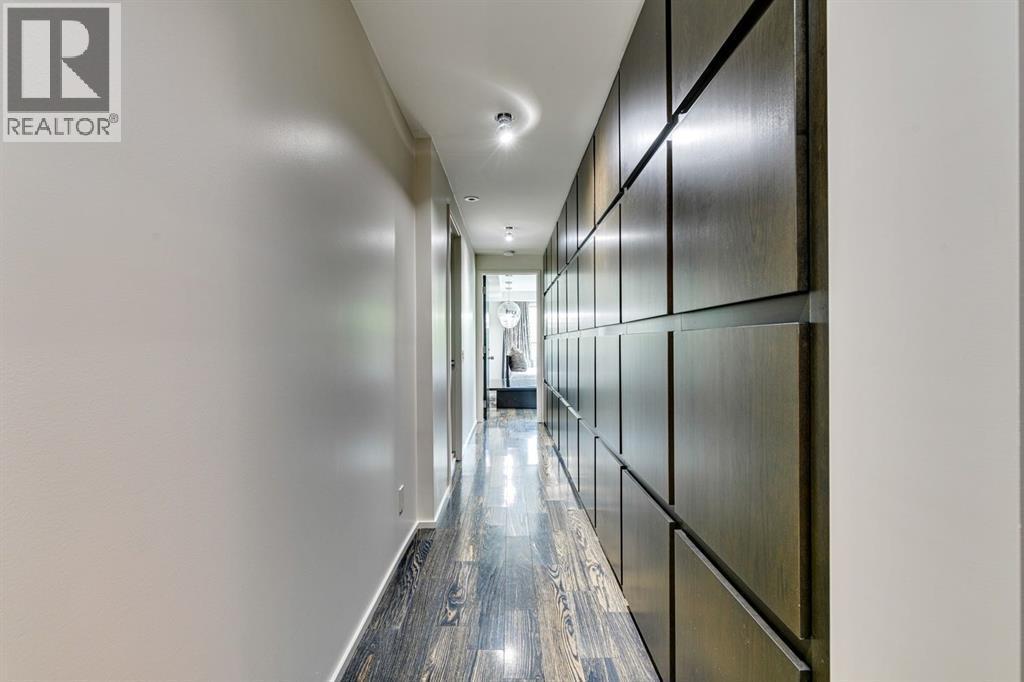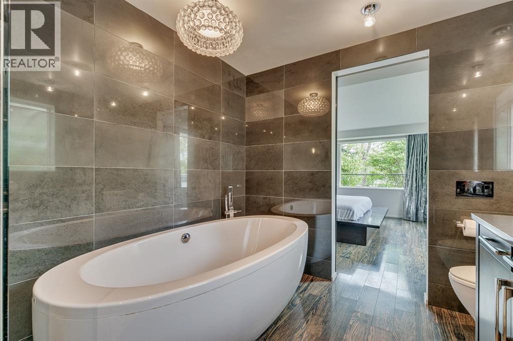 A masterful modern renovation infused with the timeless elegance of 1950s design. Perched on a coveted ridge lot in prestigious Briar Hill, this exceptional hillside walk-out captivates from the moment you arrive. A lush canopy of mature trees and sculpted landscaping welcomes you, setting the tone for what lies beyond. Step into an expansive sunroom bathed in natural light, with soaring skylights and walls of glass that blur the line between indoors and nature. It's the perfect sanctuary to unwind—whether you're sipping a fine wine or indulging in a favourite novel, enveloped in serene beauty. Step into a grand foyer featuring sculptural concrete wall elements and a sleek glass-railed staircase that set the tone for sophisticated living. The front den offers a quiet retreat, while the expansive living room seamlessly flows toward the rear deck, perfectly framed by mature evergreens that provide unparalleled privacy. Crafted for both style and function, the kitchen and dining areas are an entertainer’s dream. The kitchen exudes contemporary glamour with pristine white cabinetry, a mirrored pantry and backsplash, and mid-century lighting. An oversized eat-up island anchors the space, offering abundant storage, while a suite of top-tier appliances, including a Viking wall oven, Miele microwave and dishwasher, a Sub-Zero refrigerator, and a Gaggenau cooktop complete the look. The adjoining dining room is truly impressive in scale and design, offering sweeping views of the Downtown skyline, a stunning backdrop for unforgettable gatherings. Descending to the lower level, you're greeted by rich hardwood floors and subtle stair lighting that create an inviting ambiance. This level is thoughtfully designed as a private retreat, with dedicated spaces for work and rest. The sophisticated home office is enclosed with smoked glass doors and enhanced by custom built-in cabinetry, while a striking feature wall conceals cleverly integrated storage. Three generously sized bedrooms are tucked away on this level, along with a beautifully appointed full bathroom. The primary suite is set apart for ultimate seclusion, enveloped by expansive windows that frame the surrounding landscape. Indulge in a lavish ensuite featuring a deep soaker tub, a sleek glass enclosed shower, and a fully customized walk-in closet—crafted for both luxury and functionality. For the gardening enthusiast, the secluded rear and side yards offer a canvas to create your own private outdoor sanctuary; lush, serene, and tailored to your vision. Thoughtfully integrated into the design, an expansive under deck storage area provides a secure and discreet solution for all your seasonal essentials, ensuring both elegance and practicality are maintained. This Homs is truly in an unbeatable location ideally situated within walking distance to multiple recreational facilities, public transit, the downtown core, Kensington, SAIT, schools, and both the Foothills and The Alberta Children's Hospital. (id:6769