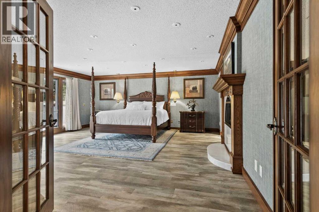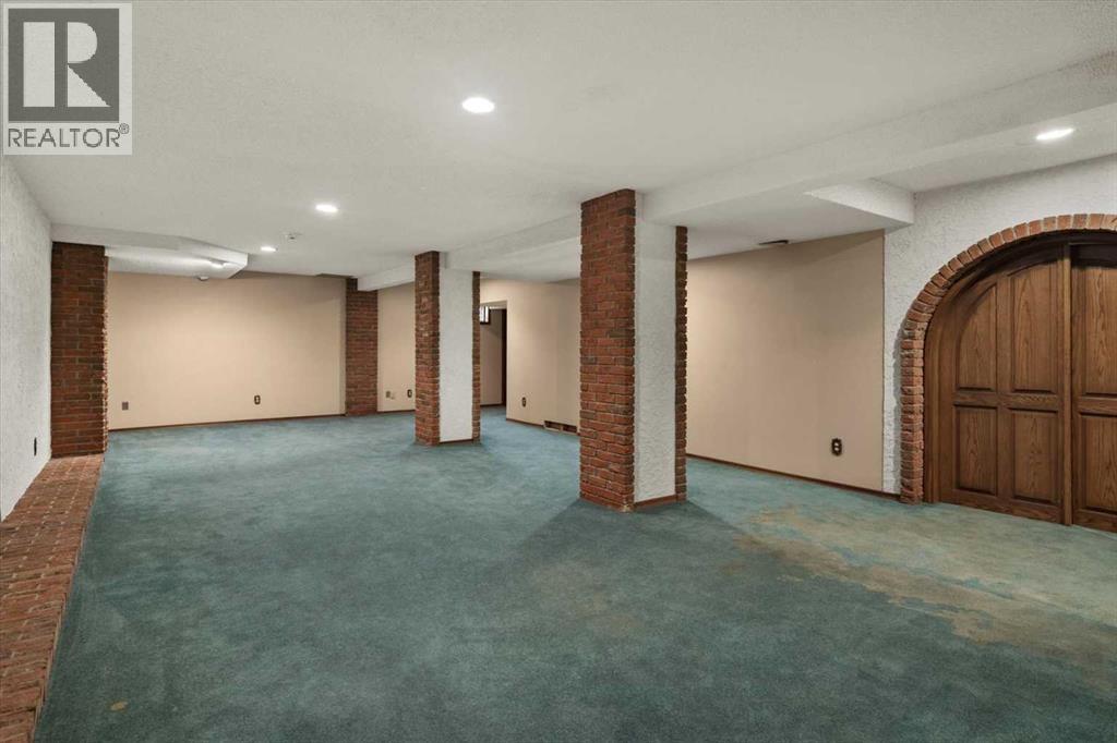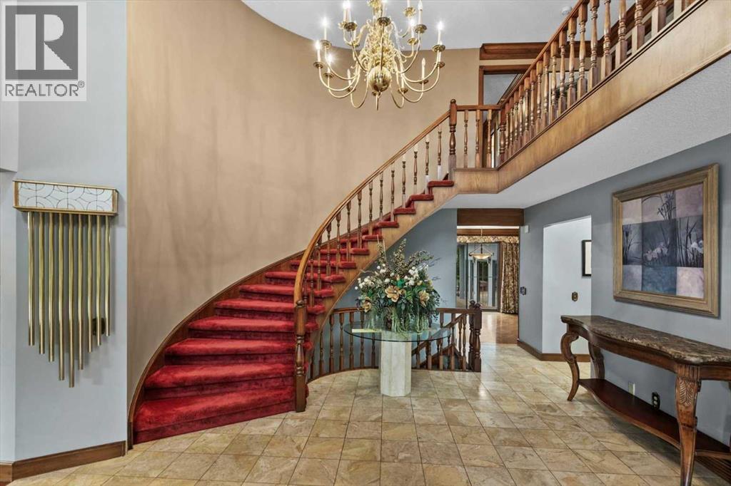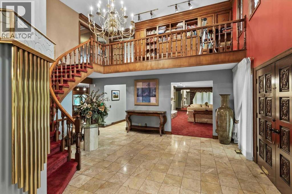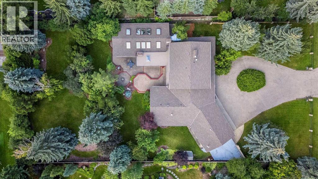 Extremely rare opportunity to own one full Acre of land, a truly unique estate property nestled in a lush park like setting, private grounds in one of Southwest Calgary’s most coveted communities- Pump Hill. Surrounded by mature trees and located directly across from a tranquil green space, this sprawling family home offers 5 spacious bedrooms, with over 9,000 (pool area included) square feet of living space awaiting your dream renovation.From the moment you step inside, the grand two-storey foyer with its sweeping curved staircase sets the tone for the home's timeless charm and generous proportions. The main floor features expansive formal living and dining rooms, a chef-inspired kitchen with professional-grade gas range, and an informal dining nook overlooking the gardens. A warm and inviting family room is finished with rich wood paneling and a striking corner stone fireplace—perfect for gathering with family or hosting guests.The indoor swimming pool complex includes a hot tub, sauna, and a dedicated fitness area—all housed in a bright, skylit pavilion that brings the outdoors in, year-round. Currently decommissioned, the indoor pool complex could be returned to its former glory or re-envisioned as a golf simulator, sport court, artists studio, collectable car display or hobby room.Three spacious bedrooms, each with its own ensuite, are thoughtfully located on the main level. Upstairs, a private primary retreat offers a peaceful escape, complete with a sunny balcony and large ensuite featuring a stylish freestanding soaker tub and a large walk-in shower. A fifth bedroom with powder room and a handsome library overlooking the foyer complete the upper level.The lower level is a nod to retro glamour, boasting a groovy naugahyde bar and lounge, games room with pool table, expansive recreation room with brick archway and wrought iron accents, a large media room and a wine cellar.Outside, the beautifully landscaped backyard is a true extension of the home, with m ultiple levels of paver stone patios for lounging and dining, a built-in fireplace, lower-level gas fire pit with seating, and gardens of established perennials, lush lawns and mature trees. This spacious yard could easily accommodate a hockey rink, basket ball, pickle ball or tennis courts.The circular front drive welcomes guests in style at the double carved-wood front entry doors, that lead to an attached 4-car heated garage with plenty of room for vehicles and all your gear. Beside the garage there’s an RV pad or the perfect place to store your sailboat.Ideally located near great shopping, dining, and amenities, this exceptional estate is also just minutes from the Glenmore Park and Reservoir, Glenmore Sailing Club, and Calgary’s extensive pathway system. With easy access to downtown and major roadways, this is inner-city estate living at its finest—rarely available and truly unforgettable. (id:6769