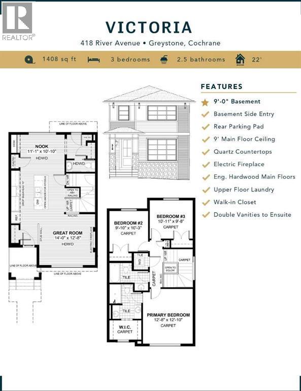 NEW PRICE! IMMEDIATE POSSESSION. BRAND NEW HOME by Douglas Homes, Master Builder in central Greystone, short walking distance to parks, the Bow River, major shopping & interconnected pathway system. Featuring the Victoria with separate side entry on an R-MX zoned home site for POTENTIAL future lower level suite. NOTE: a secondary suite would be subject to approval and permitting by the city/municipality. This gorgeous 3 bedroom, 2 & 1/2 half bath home offers over 1400 sq ft of living space. This home is located on River Avenue which provides immediate access to the interconnective pathway system, perfect for those looking for a outdoor lifestyle. Loads of Designer & upgraded features in this beautiful, open floor plan. The main floor greets you with 8' front door, soaring 9' ceilings, oversized windows, built-in niches & fireplace. Gleaming Hardwood floors flow through the kitchen, hall & nook adding a feeling of warmth & style. The Kitchen is completed with Quartz Countertops, two tone Kitchen Cabinets, 42" uppers with decorative enclosed bulkhead, plenty of drawers including Pots & Pan drawers, soft close doors & drawers, convenient tech space/desk & new stainless steel Kitchen appliance package. Upstairs you'll find a generous Primary Bedroom with Ensuite - Quartz Counters with separate, twin sink vanities, 5' shower with Designer tiled walls, private water closet all completed with ceramic tile flooring & large walk-in closet. The 2nd floor is completed by two good size additional bedrooms, main bath tub/shower combination with tiled walls, Quartz countertop, undermounted sink & ceramic tile flooring. You will love the convenience of 2nd Floor Laundry completed with ceramic floor tile. This is a very popular plan, great for young families, investors or the down sizers. Spacious, Beautiful and Elegant! The perfect place for your perfect home. Call today! Interior photos are from prior build & are reflective of fit, finish & included features. Note: Interior photos are for illustration purposes only. Actual interior colors/finishes, & upgrades may be different than shown & the Seller is under no obligation to provide them as such.Come to the Show Home first located at 500 River Avenue. Showings only during Show Home hours & days. THIS HOME IS UNDER CONSTRUCTION (id:6769