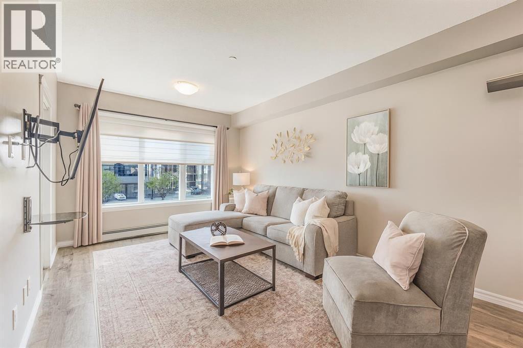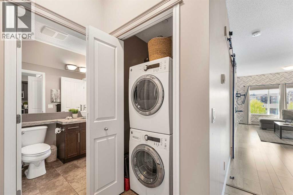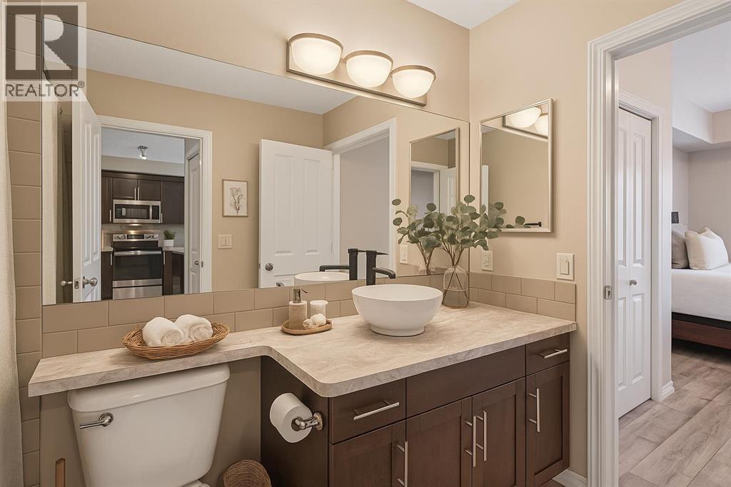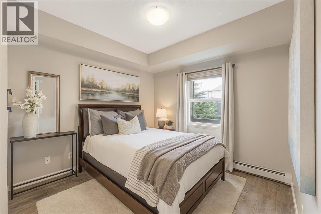 Welcome to The Courtyards in Kings Heights. This one bedroom suite is a must see and offers two parking stalls. The home has been tastefully updated over the years with kitchen and bathroom sinks and faucets (2021), high end laminate barnwood flooring, a stylish barn door, full height kitchen cabinets, backsplash, and ceramic tile in the entry (2021). Window coverings and a Phantom screen door to the balcony were also added in 2021. More recent upgrades in 2025 include a new shower head, a bidet, and a sunshade on the balcony. A storage cage is also included. This suite combines thoughtful details, ample storage, and the convenience of two parking stalls. Located close to Deerfoot, Yankee Valley Boulevard, shopping just across the street, and surrounded by beautiful walking paths, this home offers both comfort and convenience. (id:6769
