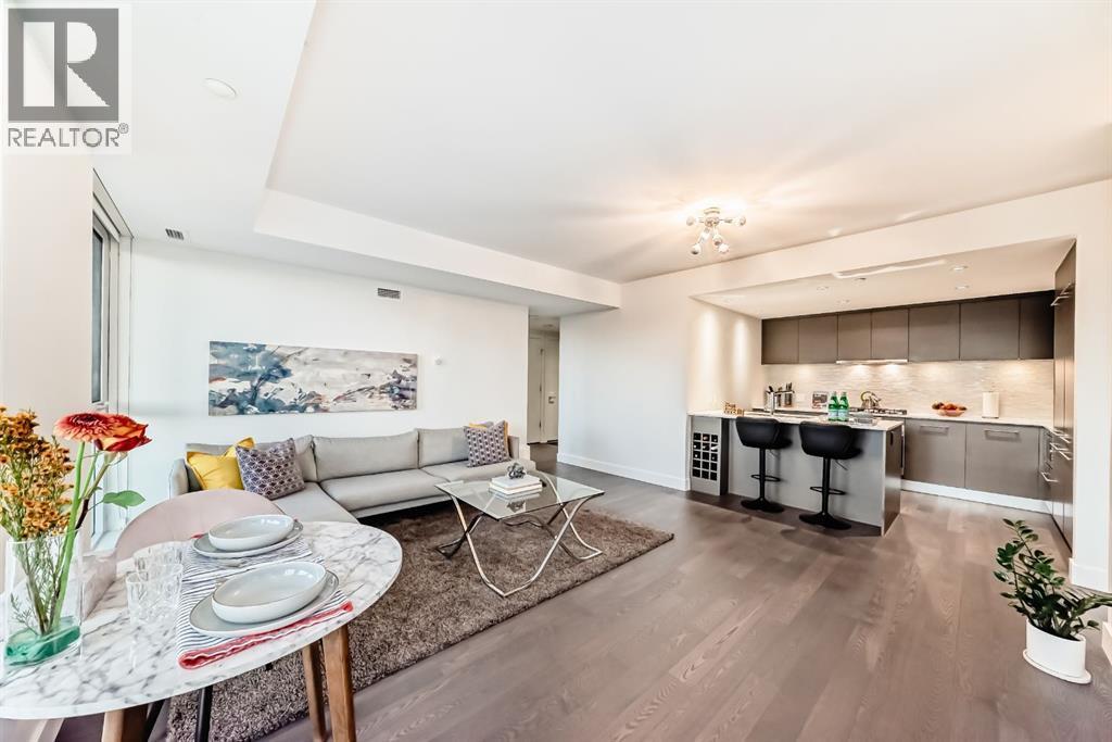 Welcome to this breathtaking 2-bedroom, 2-bathroom residence featuring an award-winning floor plan and unbeatable views from every corner. Step onto your west-facing balcony and take in stunning sunsets overlooking the Bow River and mountains.Inside, you’ll find upgraded engineered hardwood floors and a chef-inspired kitchen complete with a panelled fridge, built-in oven, microwave, and a massive island—perfect for entertaining. The spacious living room includes a cozy nook, while the primary suite offers a generous walk-in closet and a luxurious ensuite with double vanity, soaker tub, and standing shower. The secondary bedroom is ideal for kids, guests, or a home office, with the second bathroom upgraded to a full standing tiled shower.This quiet, non-smoking, pet-free unit is in immaculate condition and comes with in-suite laundry, a titled underground parking stall, and a titled storage unit.Building amenities include:24hr concierge & securityDog wash station & bike workshop in the parkade11 visitor parking stallsDaily professional maintenance & cleaningFitness centre and elegant lobbyMostly resident-owned units (no short-term/Airbnb rentals allowed)Located just a 3-minute walk to the Bow River pathways and 5 minutes to the Downtown West-Kerby C-Train station, you’ll enjoy quick access to downtown, dining, shopping, and parks.This is the perfect blend of luxury, lifestyle, and location. (id:6769