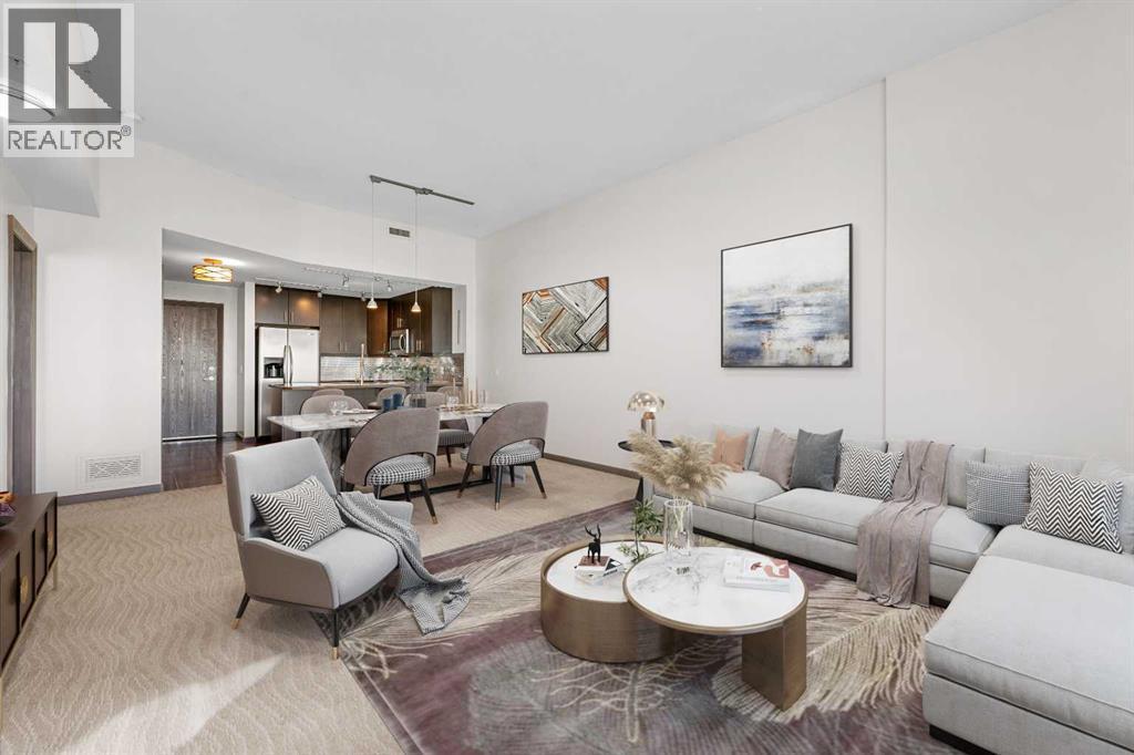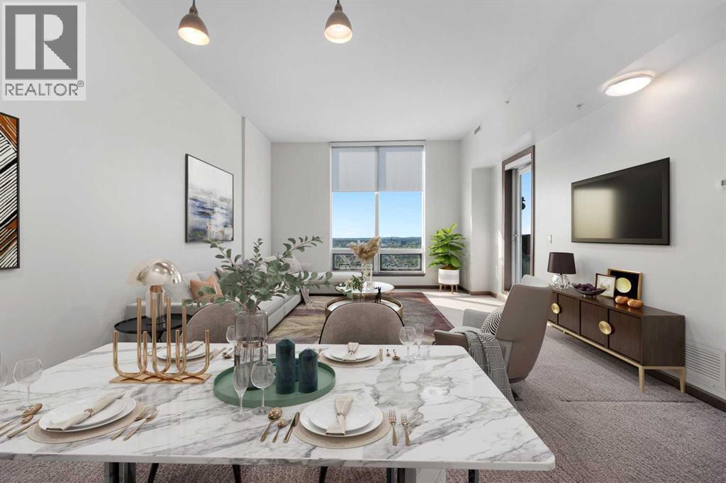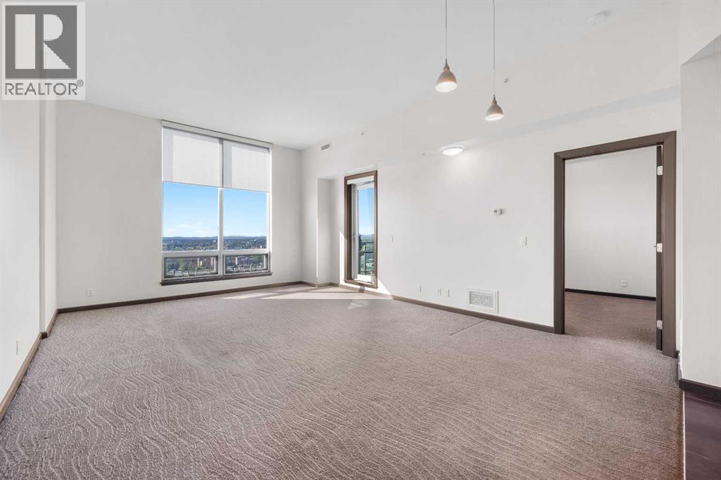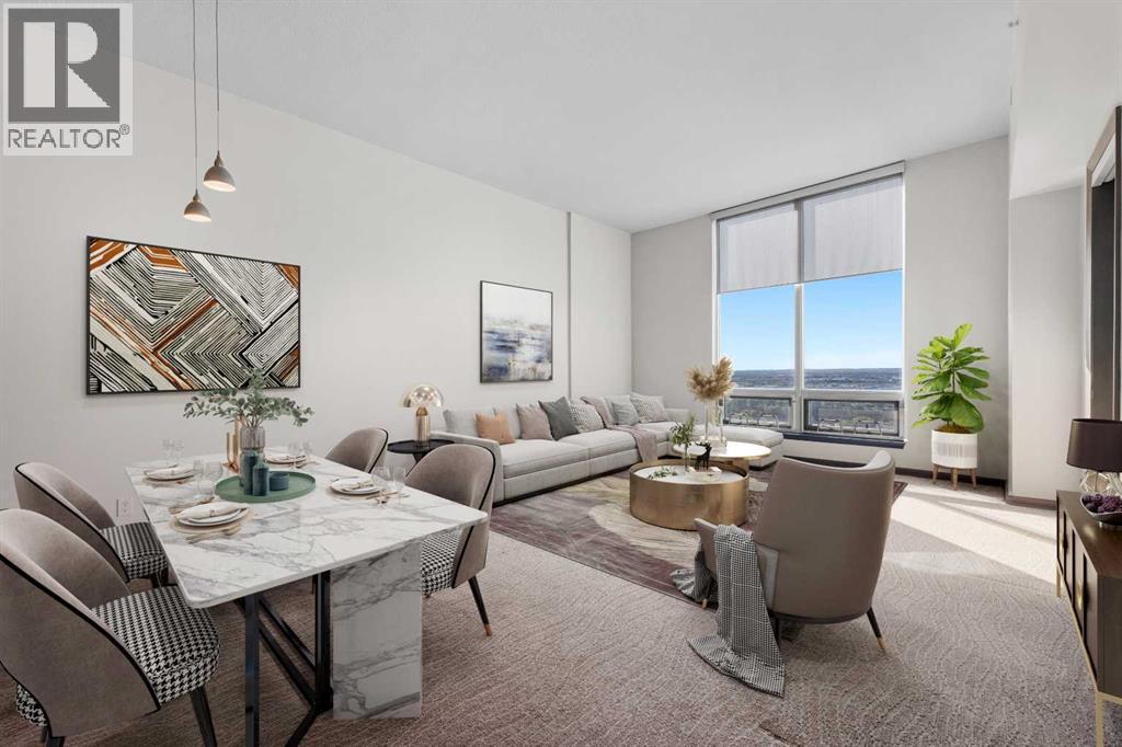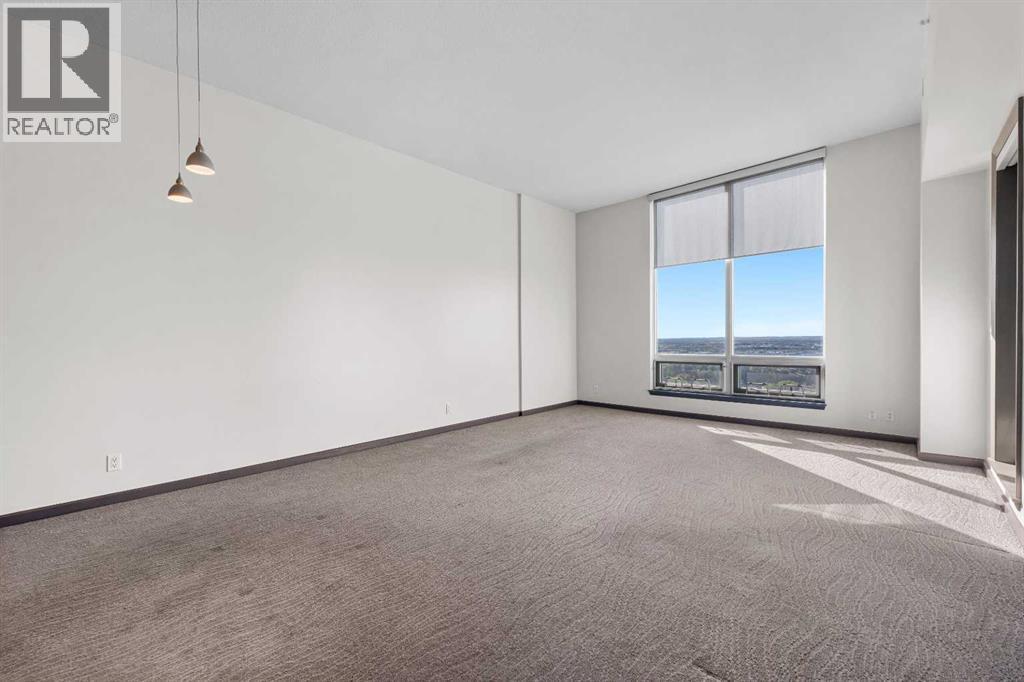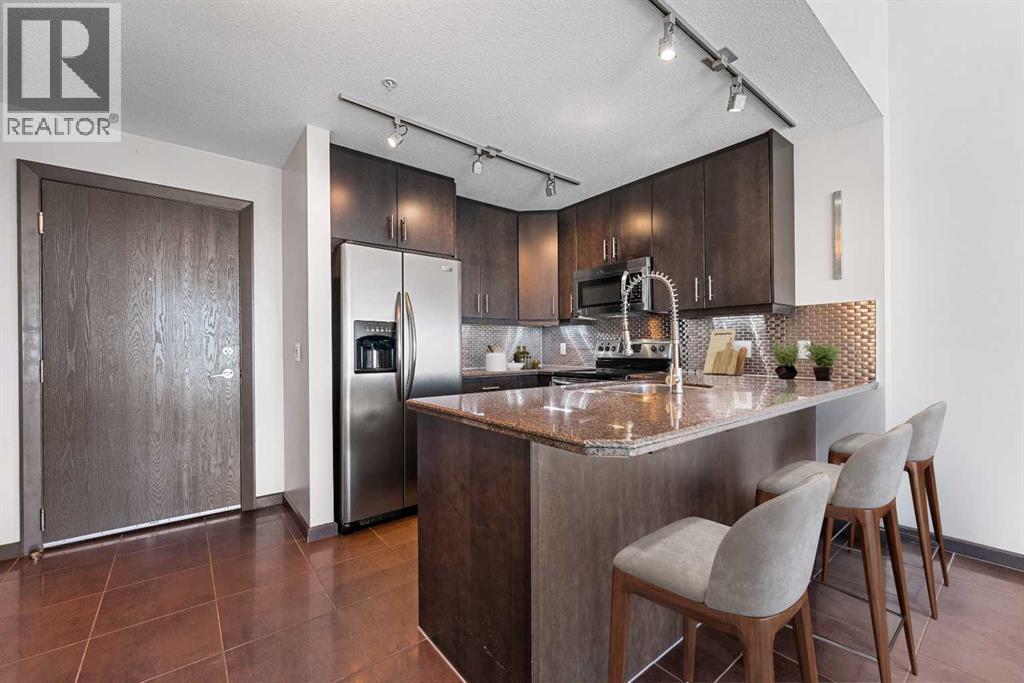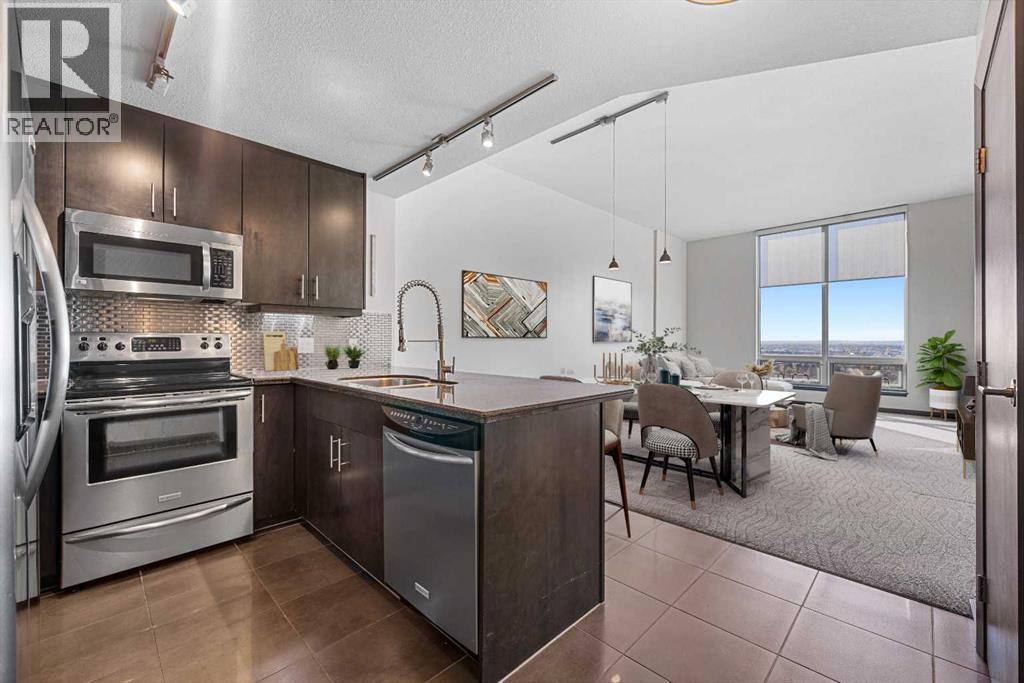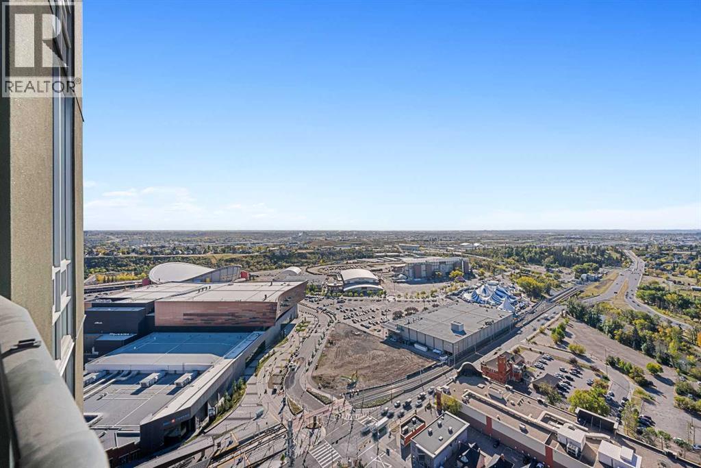 Perched high on the 32nd floor, this stunning south-facing unit offers breathtaking panoramic views of the Rocky Mountains and Stampede Grounds through floor-to-ceiling windows. With soaring 10 ft ceilings, the space feels bright, open, and luxurious. The kitchen boasts granite countertops, stainless steel appliances, and a stylish backsplash; a perfect place for creating delicious meals for yourself and guests. A massive living room makes the most of the incredible views with floor to ceiling south facing windows giving you a magnificent space to curl up with a good book and gaze at our wonderful city. The spacious bedroom features a walk-through closet leading into the bathroom; a great place to rest your soul after a day of fun and adventure. To further support your carefree lifestyle this home also includes air conditioning, titled underground parking and a storage locker for your convenience. The building offers resort-style amenities including concierge service, a large fitness center, hot tub, steam room, theater, and party room. This condo is the idyllic home for you with stunning views, luxurious space and amazing amenities all within your own building. (id:6769