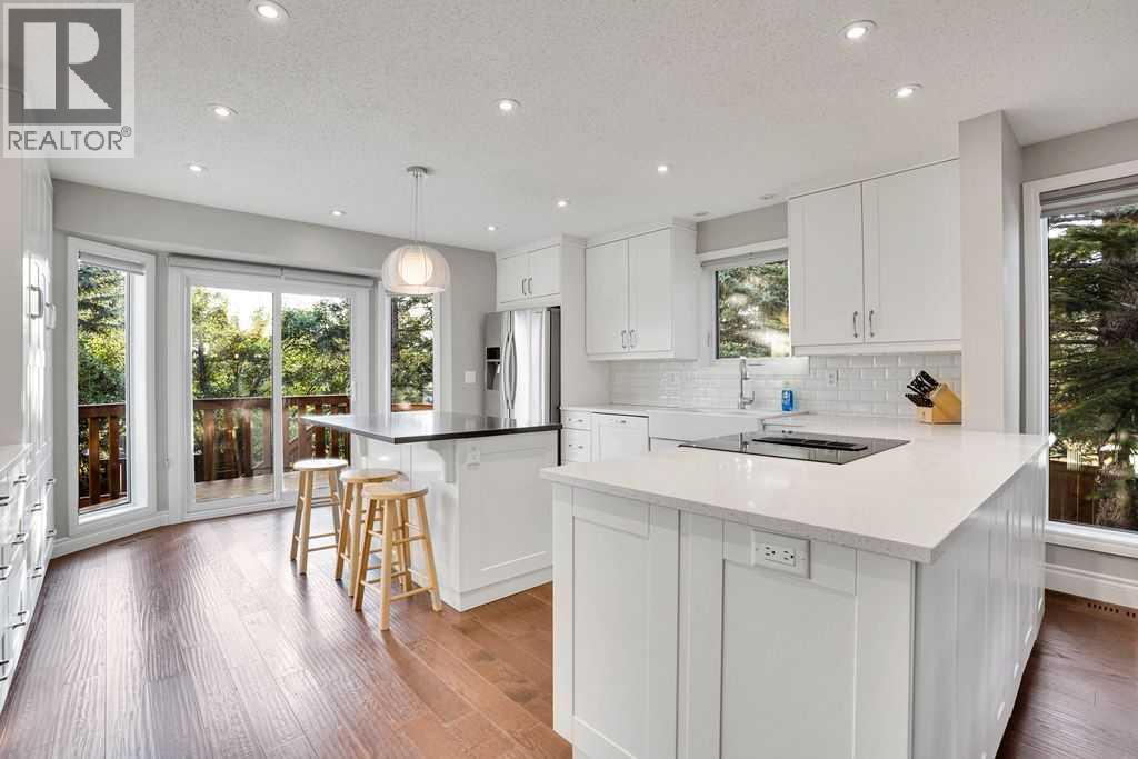 Welcome to this beautifully updated home tucked away on a quiet cul-de-sac in the heart of Woodbine. Sitting on a large southwest-facing pie lot, the property offers incredible privacy with mature trees, a firepit, and a two-tier deck complete with a gas BBQ line—perfect for entertaining and family gatherings. Inside, you’ll love the vaulted ceilings and open design that highlight the renovated kitchen with quartz countertops, built-in cabinetry, and updated appliances. The main living areas flow seamlessly into a formal dining room, living room, and a cozy family room with a gas fireplace and built-in accents that opens to the backyard. Upstairs features a spacious primary retreat with a spa-like ensuite, two additional bedrooms, and another fully updated bathroom. The main floor includes a convenient den/office and mudroom entry from the garage, while the finished basement offers a large rec room, an additional bedroom, and plenty of flexible living space. With modern updates throughout, and walking distance to schools, playgrounds, Fish Creek Park, and nearby shopping, this home is truly move-in ready and a must-see. (id:6769