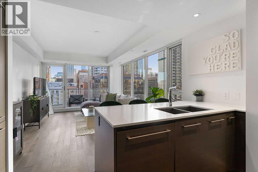 Live in the heart of Calgary’s West End in this 12th-floor one-bedroom condo at Avenue. Bright and modern, it features floor-to-ceiling windows, hardwood floors, and an open layout. The kitchen impresses with quartz counters, sleek cabinetry, gas cooktop, stainless steel appliances, and a central island with seating. The living area extends to a private balcony with skyline views, ideal for relaxing or entertaining. The bedroom includes a walk-in closet, while the 4-piece bath and in-suite laundry add everyday convenience. Titled underground parking and storage are included. Building amenities feature concierge service, a fitness center, and bike storage. Steps to the Bow River pathways, Prince’s Island Park, the LRT free zone, and Kensington’s shops and dining, this condo offers the perfect mix of comfort, convenience, and downtown lifestyle—an excellent choice for first-time buyers, downsizers, or investors. (id:6769