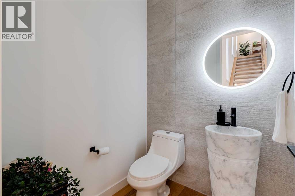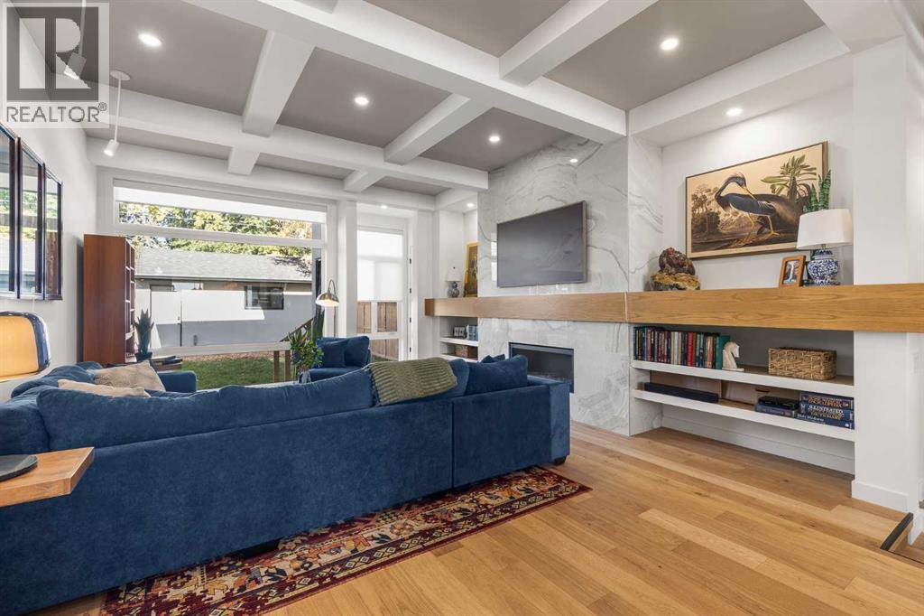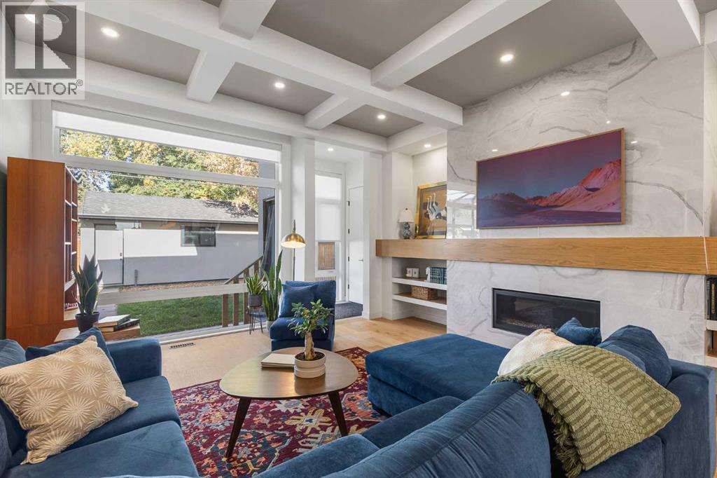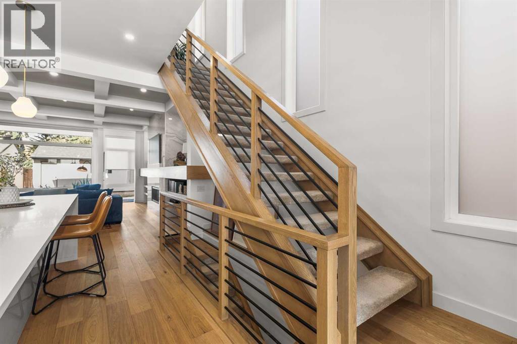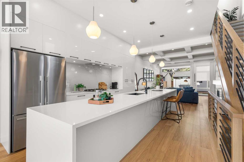 Located in the highly sought-after community of West Hillhurst, this exceptional two-storey home offers over 3,100 square feet of developed living area that blends refined luxury with timeless European-inspired design. Custom-built by Deanmark in 2023, every detail reflects superior craftsmanship and quality materials. With four bedrooms and three and a half bathrooms, this residence delivers both sophistication and functionality for modern family living.The inviting foyer sets the tone with tile flooring and a built-in bench, while wide-plank engineered hardwood extends seamlessly throughout the rest of the main level. Ten-foot ceilings and eight-foot solid core doors enhance the sense of height and elegance, while large windows fill the home with natural light. The open-concept layout connects the kitchen, dining, and living areas, creating an ideal setting for everyday living and entertaining alike. The kitchen is a showpiece, featuring sleek white cabinetry, quartz countertops, a massive waterfall island with seating, and premium Fisher & Paykel stainless steel appliances, including a gas cooktop. Ample storage and workspace make it as functional as it is beautiful. The adjacent dining area easily accommodates family gatherings, while the living room exudes warmth with its linear gas fireplace, tile surround, custom built-in display shelves, and coffered ceiling. A stylish two-piece powder room with a stone pedestal sink finishes the main floor. Upstairs, nine-foot ceilings and thoughtful design create a calm retreat. The primary suite is a luxurious escape, featuring soft carpeting, a spacious walk-in closet with custom shelving, and a spa-like ensuite with heated tile floors, dual sinks, a soaker tub, and an oversized shower. Two additional bedrooms, a four-piece bathroom, and a convenient laundry room round out the upper level. The fully developed basement features 9’4” ceilings, oversized windows, and a bright, open layout. A large recreation room with a sle ek wet bar, complete with sink, beverage fridge, and wine display, creates an inviting space for entertaining. A guest bedroom, three-piece bathroom with steam shower, and dedicated storage add functionality. Outside, the backyard offers a concrete patio and grass area leading to a double detached garage with alley access. Hunter Douglas blinds and central air conditioning add year-round comfort. West Hillhurst is one of Calgary’s most desirable inner-city neighbourhoods, known for its blend of family-friendly charm and urban accessibility. You’re within walking distance to the vibrant shops, cafés, and restaurants of Kensington, offering an unmatched lifestyle. Families will appreciate being just a 15-minute walk from both Queen Elizabeth Schools. Nearby parks and the Bow River pathways provide endless opportunities to enjoy the outdoors, while commuting is effortless with easy access to major roadways and transit. Check out the 3D tour for a closer look! (id:6769