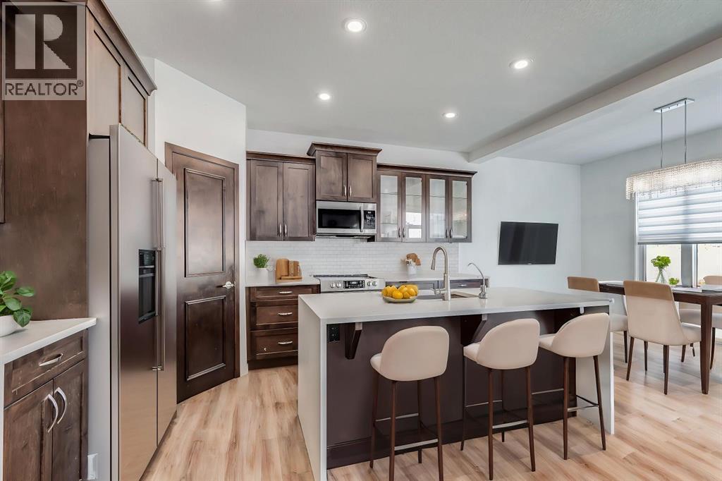 Welcome to your dream home in Auburn Bay — a fully finished, Cedarglen-built two-storey offering over 3,000 sq ft of impeccably curated living space across all three levels. Perfectly situated across from a sprawling green space and Lakeshore School in one of Calgary’s most beloved lake communities, this home masterfully blends luxury, functionality, and timeless design.Step inside to a bright, open-concept main floor where luxury vinyl plank flooring runs wall-to-wall — no carpet in sight. The chef-inspired kitchen is the heart of the home, featuring a dramatic white quartz waterfall island, full stainless steel appliance package, rich espresso cabinetry, tiled backsplash, and a corner pantry. The adjacent dining area and inviting great room, anchored by a stone-wrapped gas fireplace, offer the ideal setting for entertaining or everyday family living. A private main floor den, built-in mudroom lockers, and a stylish 2-piece bath complete the level.Upstairs, the nearly 200 sq ft primary suite is a true retreat, complete with a spa-like 5-piece ensuite and walk-in closet. Two additional bedrooms offer custom built-in closets, while a spacious 518 sq ft bonus room—complete with sliding barn doors and a private balcony—offers flexible space for a fourth bedroom, playroom, or home office. A full 4-piece bath and upper-level laundry room add thoughtful convenience.The professionally finished basement adds even more versatility, featuring spray foam insulation, upgraded subfloor, a large rec room with pot lights and wet bar (with built-in bar fridge), a stylish 4-piece bathroom with dual sinks and rainfall shower, and electrical and framing prepped for a future fourth bedroom.Outside, enjoy a private and beautifully landscaped backyard with mature cherry blossom trees, a custom pergola with roll-down privacy shades, and a gas line for your BBQ — perfect for warm summer evenings. The oversized double garage is insulated and painted, rounding out this exceptional pa ckage.Located in a premier 4-season lake community, enjoy exclusive access to paddleboarding, kayaking, swimming, skating, tennis courts, and the Auburn House facility. Minutes to schools, shopping, South Health Campus, and with a new public middle school coming soon just steps away — this is a rare opportunity not to be missed.A luxurious home. A vibrant lifestyle. Welcome to Auburn Bay. (id:6769