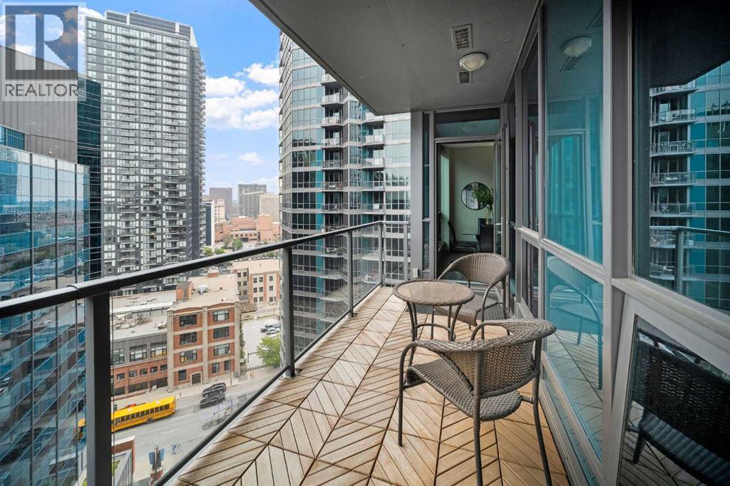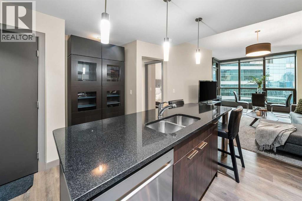SLEEK 2 BED, 2 BATH, TURNKEY CONDO IN THE HEART OF CALGARY! Imagine living above Sunterra Market with fresh groceries, ready-to-go meals, and your morning coffee just an elevator ride away. This is the Beltline, Calgary’s most vibrant inner-city community where everything happens. Walk to the Saddledome for concerts or Flames games, experience the buzz of Stampede Park, shop and dine along 17th Avenue, or head out to the river pathways for a change of pace. Living the life in the Beltline means your days are connected, your evenings are lively, and your weekends are filled with endless options. At Keynote 1 you are not just buying a condo, you are putting yourself in the center of Calgary’s energy where work, play, and lifestyle all come together. This 15th floor residence offers nearly 900 sqft of chic and functional living with two bedrooms and two full bathrooms. Floor-to-ceiling windows flood the open-concept space and the dining area flows seamlessly onto your spacious balcony finished with interlocking wood tiles that add warmth and style to your private outdoor retreat. Inside, the kitchen is designed to impress with granite countertops, stainless steel appliances, and a custom-style shelving unit that extends your pantry or provides a showcase for glassware, plus a convenient breakfast bar perfect for pre-game cocktails with friends or a post-concert Skip order. Recently updated luxury vinyl plank flooring enhances the modern feel, while in-suite laundry deliver convenience. Unlike most condos, this property comes with not one but two storage lockers, a rare and valuable feature for condo living, along with a titled, secure, heated underground parking stall. BONUS: All the furniture, cookware/glassware, small appliances, cutlery, TV, dining room set can stay. Keynote residents enjoy premium amenities including two fitness facilities, one dedicated to weights and the other to cardio, a stylish owner’s lounge with table games and gathering spaces, and a landsc aped courtyard with outdoor BBQs, water feature wall, and room to celebrate with family and friends. Hosting guests is effortless with access to two fully furnished suites available at an affordable nightly rate. Whether you are seeking your own urban retreat or a smart investment in Calgary’s most undeniable location, this home delivers lifestyle, convenience, and exceptional value all in one. (id:6769