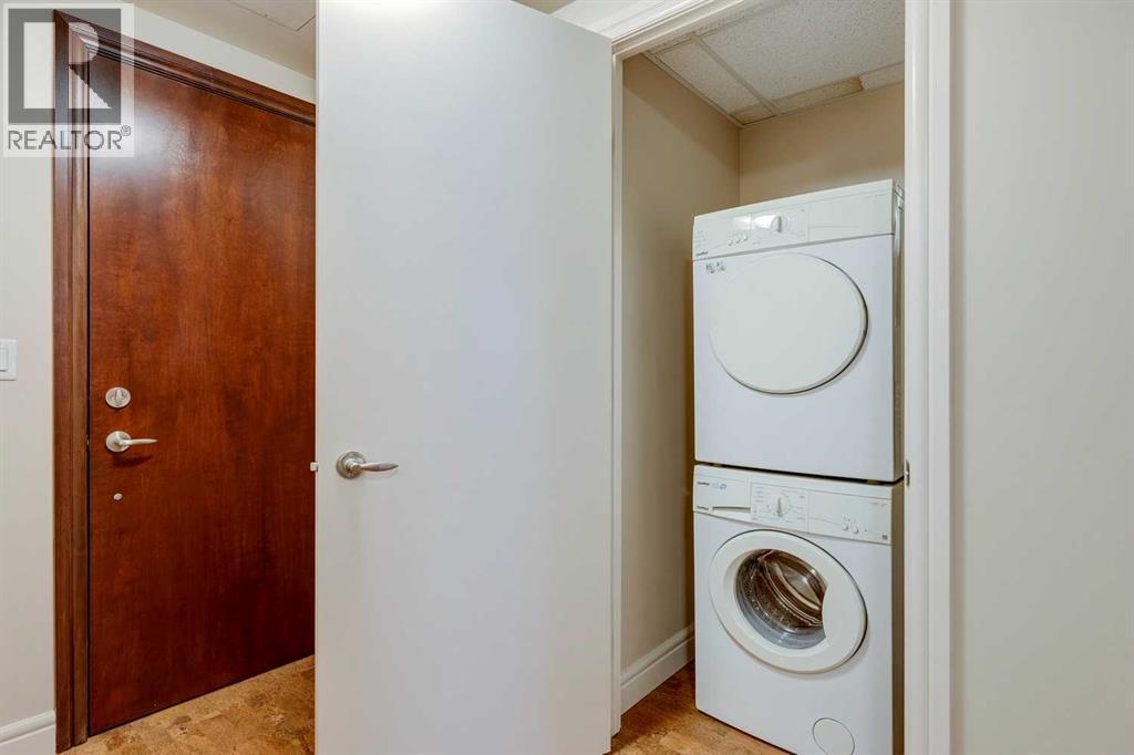 Why not take a look? This larger 1 bedroom unit will keep you safe & sound downtown in a prestigious building with concierge services and amenities. This unit offers a spacious entry featuring a double closet for outerwear, cushioning cork flooring with superior thermal & acoustic insulation, and a private DEN to write your next book or relax before heading out into the vibrant city. The full kitchen has a timeless design including a sophisticated glass panel cabinet to highlight special glassware, storage pantry, undermount lighting as well as recessed electrical outlets. ALL appliances are still like new having been rarely used – as well as washer/dryer. [Owners did not live here fulltime but used the space for stop-overs in Calgary. They appreciated the security in this ideal location just steps away from shopping and within walking distance to sports & Stampede] Inviting living room is open concept & full balcony spans across the living room and bedroom with glimpses of the sky north & south. The bedroom is almost 12’x12’ with deep double closets & full of natural light. A traditional 4-pce bathroom has plenty of space and this unit also offers multiple storage closets as well as EXTRA separate storage in the parking garage. You will appreciate Central A/C & 3 elevators within the building as well as thoughtfully designed stairwells. Titled parking is included & pets are welcome with approval. (id:6769