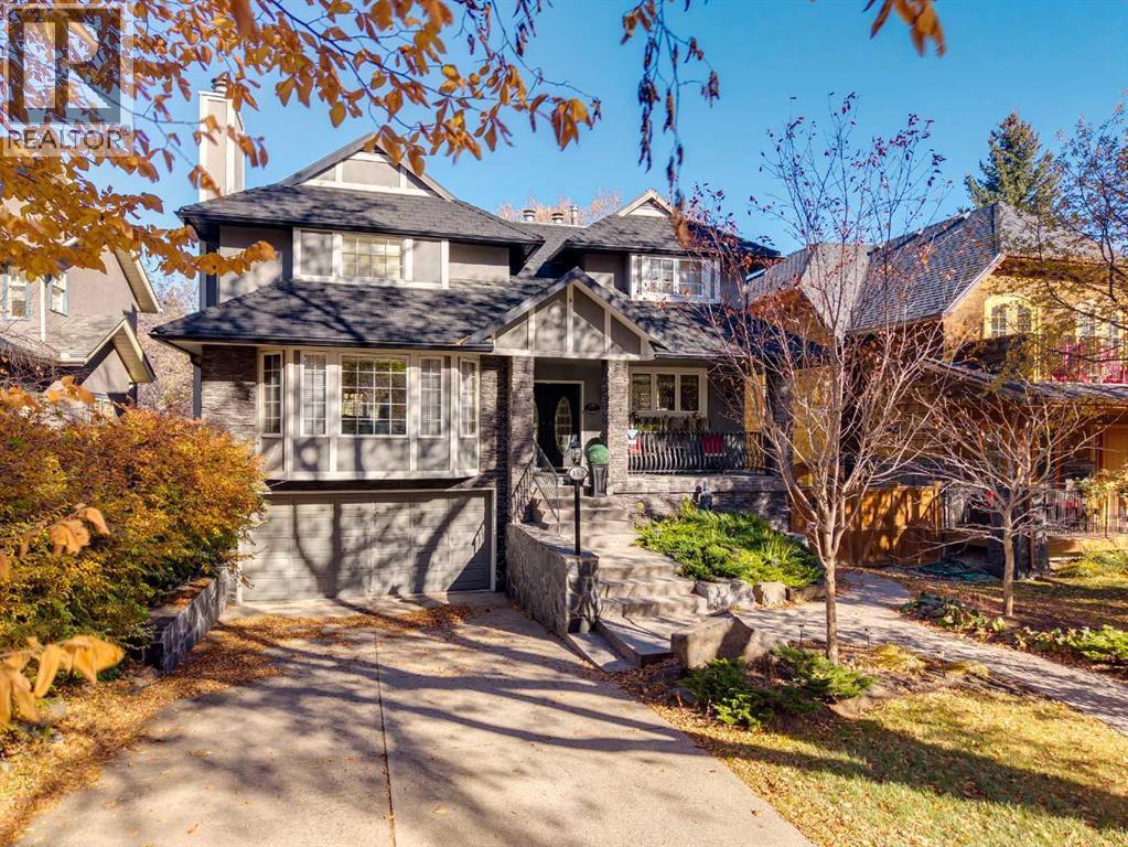Welcome home to the affluent neighbourhood of Upper Mount Royal! Located on a beautiful tree lined street, this updated and well maintained 5-bedroom home offers over 4,000 sq ft of finished living space, situated on a 50' x 170' south facing private treed lot. The entry way of this home has high vaulted ceilings to the 2nd storey with large skylights providing natural light throughout. The main level has been perfectly designed for entertaining with the large front living room with wood burning fireplace and large formal dining room off the main foyer. The kitchen is well appointed with ceiling height cabinets, granite counter tops, gas stovetop and large island with breakfast bar. The breakfast nook overlooks the sunken family room with its woodburning fireplace and wet bar with access to the large back deck There is a cozy built in bay window bench overlooking the backyard. On the upper level is 5 bedrooms and a 5-pc bath. The primary bedroom offers a walk-in closet and 5pc ensuite with jetted tub and walk-in shower. 2 linen closets insure enough storage for a large family. The walk-out basement provides a great space for a home office/business with a rec room, office with built-in bookcases and a 2pc bath. Also on this level is the interior garage access, mudroom with storage and laundry - perfect for busy sport/outdoor families. Enjoy outdoor living on the S facing front deck off, on the back deck open looking over to the large backyard and from the nice sized covered walk-out patio. An ideal location for families and professionals. Minutes to the Marda Loop Community Association with outdoor pool, tennis courts and large park. Walking distance to the shoppes and restaurants of 17th Ave SW & Marda Loop, multiple parks and the Elbow River Pathway . Quick Access to the Glencoe Club, Downtown, University of Calgary and Mount Royal University. Close to all amenities, private, public and catholic schools. (id:6769