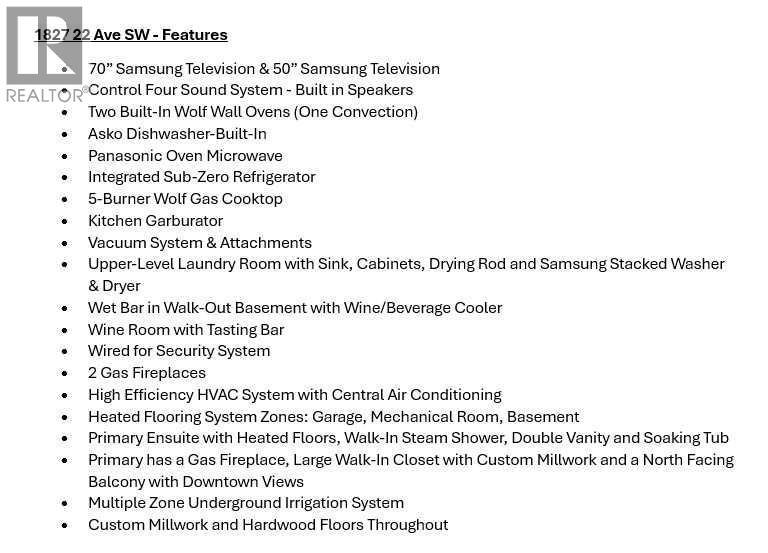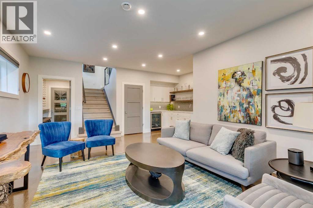 Welcome to an inner-city English garden living - with 2,847 sq ft of luxury situated in the vibrant community of Bankview. Offering 5 bedrooms throughout, this semi-detached walk-out home is perfect as an executive and/or family home. Built by luxury builder Grandscape Homes with superior finishes and completed by interior designer Denise Panagakos, this stunning home blends contemporary design with comfortable living finishes. The S & W facing main level has 10 ft ceilings, a two-storey front foyer and floor to ceiling windows, flooding the home with natural light. The gourmet kitchen has a large island with breakfast bar, pantry plus amazing storage. Top end appliances include a 5 burner Wolf Cooktop, dual Wolf wall ovens (one convection) and an integrated Sub-Zero fridge. The open living/dining area with gas fireplace leads to a south facing balcony through large sliding doors. On the 2nd floor, French doors lead to the private primary suite that occupies the entire level. Complete with a gas fireplace, a large walk-in closet, and a north facing balcony with downtown views. The 5-pc ensuite has a soaking tub, double vanity, a large steam-shower, and heated flooring. The 3rd level has 2 large bedrooms, both with walk-in closets. This floor also includes a 5-pc bathroom and a laundry room with sink and storage. On the 4th level is a very large loft bedroom/suite with downtown views and a 4-pc bathroom - perfect as a bedroom, office space or living area. The fully finished walk-out level has heated polished concrete floors, a 5th bedroom or office, and a 3-pc bathroom with an oversized walk-in shower. This level is the perfect entertaining area with a wet bar and wine room off the sitting area and walk-out covered patio. The sunny south facing back yard is professionally landscaped with plenty of shrubs and trees creating a private and quiet oasis. Backing directly onto a city park the home's multiple outdoor living spaces will bring the outside in, either from the main living area balcony, or the large lower patio. Throughout the entire home you will find custom millwork cabinets providing ample storage. This clean air home has high efficiency heating/ventilation and includes central air conditioning. The double attached finished garage also has heated floors. Its minutes to downtown and walking distance to the shops, restaurants and amenities of either 17th Avenue or Marda Loop - also close to Mount Royal, Downtown Core, University of Calgary, Foothills Hospital Campus, SAIT & Kensington. Experience both quiet park and vibrant inner city living & book a showing with your realtor today! (id:6769