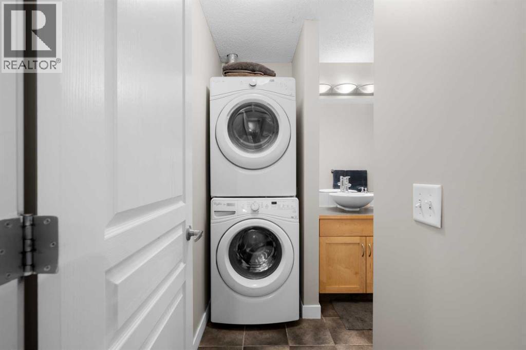 Welcome to this inviting 1-bedroom, 1-bathroom main floor condo perfectly located in the highly sought-after community of Aspen Woods. This thoughtfully designed unit combines comfort, functionality, and tranquility — all within minutes of urban convenience.Step inside to discover 9-foot ceilings and an open-concept layout that feels bright and spacious. The kitchen offers abundant cabinetry, a peninsula island with breakfast bar, and plenty of prep space — ideal for everyday living or entertaining. The adjoining living and dining area features laminate flooring and large sliding patio doors that open to your private patio overlooking lush green space and mature trees, creating a peaceful, park-like retreat.The large bedroom enjoys views of the trees, while the 4-piece bathroom includes tile flooring and a full-sized washer and dryer for ultimate convenience. A spacious front storage closet offers incredible versatility — perfect for seasonal gear, or even a cozy den area.Additional highlights include heated titled underground parking, ample outdoor visitor parking, and a quiet, well-maintained building in one of Calgary’s most desirable west-end neighbourhoods.Enjoy close proximity to Aspen Landing Shopping Centre, top-rated schools, Westside Recreation Centre, Aspen Woods Lake and walking paths the LRT, and quick access to 17th Avenue SW, Sarcee Trail, and Stoney Trail — making commuting and errands effortless. (id:6769