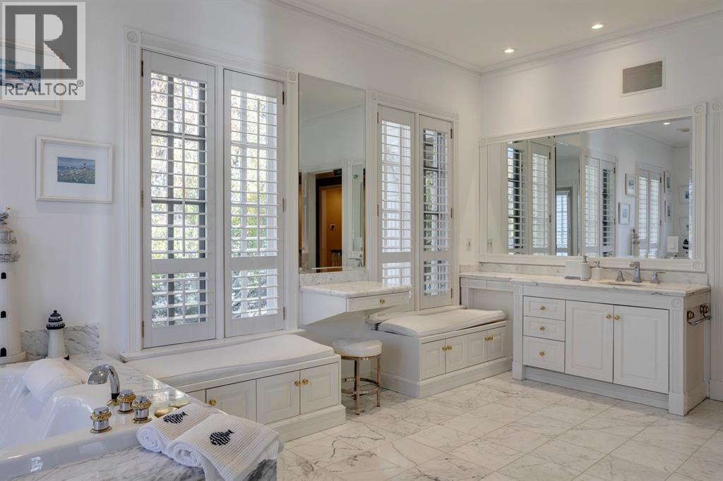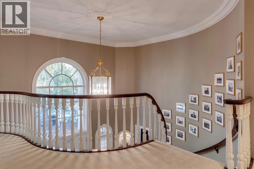 Timeless in design and uncompromising in craftsmanship, this bespoke neoclassical estate ranks among the city's most distinguished residences. Nestled in a fully treed, meticulously landscaped setting ensuring complete privacy, it delivers an unforgettable first impression. The brick façade features columns, concrete balustrades, and wrought-iron gates to assert its stately presence. A gated, heated driveway leads to a triple garage and an exceptional underground parkade accommodating eight more vehicles, complete with car wash and workshop. Inside, a dramatic curved staircase anchors the grand foyer, introducing the artistry throughout. The main floor excels in entertaining, ideal for galas, business dinners, or family celebrations with generous gathering spaces, a cloak room, two elegant powder rooms, expansive corridors, and multiple French doors opening to terraces and gardens. A refined formal living room with limestone-trimmed fireplace, display cabinet and graceful chandelier has ample room for a grand piano. The spacious dining room with fireplace and butler’s pantry is ready for formal dining. An inviting library boasts wood bookcases and a lounge for quiet reflection. The family room provides multiple sitting areas, a wet bar, and access to the south-facing circular sunroom overlooking the private grounds. Adjacent is a classic kitchen with commercial-grade appliances including a six-burner cooktop, double wall ovens, and warming drawers. A casual dining area suits morning coffee or weeknight meals while the walk-in pantry contains an extra freezer and water dispenser. Upstairs, the primary suite is a private sanctuary with a serene sitting room and fireplace, plus doors out to the south-facing rooftop patio and multiple walk-in closets. A marble clad ensuite indulges with dual vanities, multi-head shower, and generous tub. The second and third bedrooms each have ensuites, while the third-floor guest suite/office features balcony views of the reservoir and mountains, plus a three-piece bath. Downstairs, the lower level focuses on leisure: a home theatre with tiered seating, a snack bar with candy display, a Tuscan-inspired wine cellar with barrel-vaulted ceiling and wrought-iron gates, gym/recreation room, and steam room. Private staff quarters include a secondary kitchen, fifth bedroom/hobby room, laundry with double washer/dryers, and separate entry. Located in a prestigious, tightly held enclave backing protected parkland, this property ensures privacy and security. Created for the connoisseur of living well, this home seamlessly blends spaces for health, leisure and passion. Every detail, from the classical proportions to the enduring materials reflects a home crafted for how discerning families truly live: entertaining beautifully, living comfortably, and enjoying privacy without compromise. A residence that embodies grace, strength and refined living, an iconic estate in every sense. (id:6769