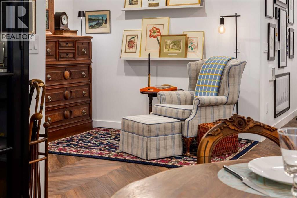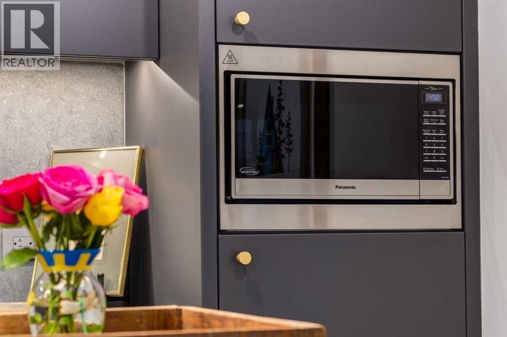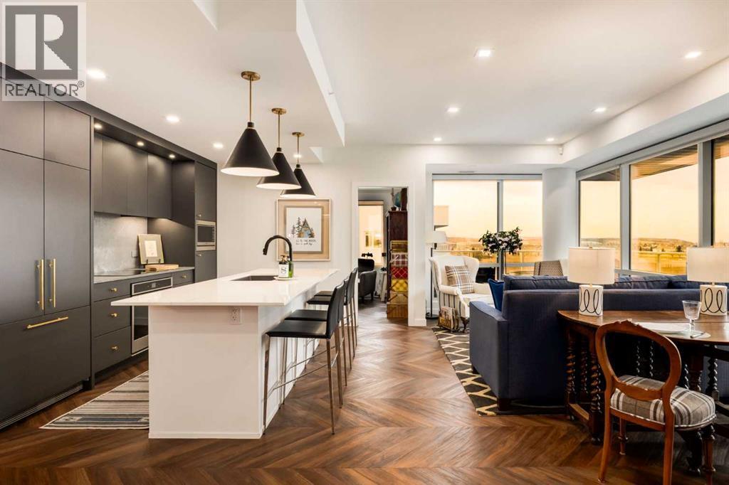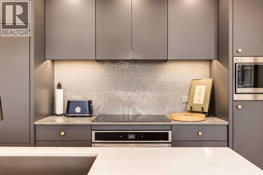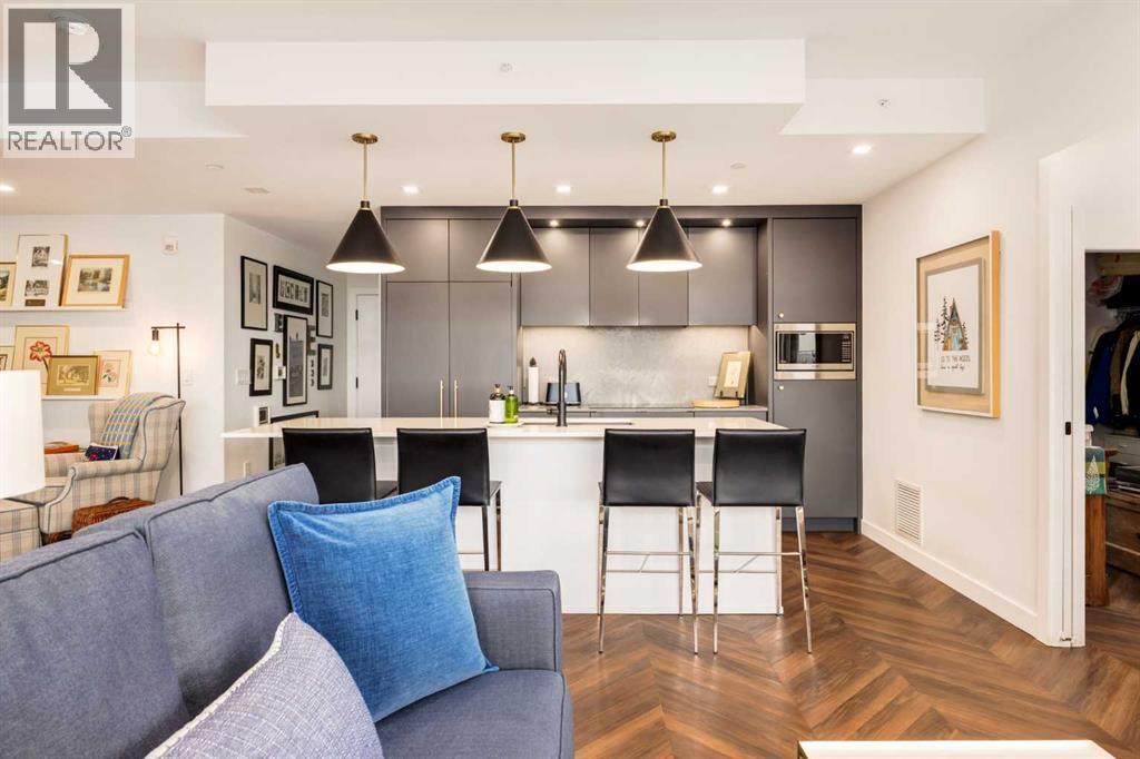 Experience elevated urban living in this warm and inviting two-bedroom residence offering over 1,100 square feet of thoughtfully designed interior space and a wraparound terrace perfect for everyday outdoor living and relaxed entertaining. Blending a cozy Ralph Lauren–inspired aesthetic with modern finishes, this home features chevron-patterned flooring, designer lighting, and flat-painted ceilings that create a timeless atmosphere throughout. The chef-inspired kitchen is the heart of the home, showcasing matte grey slate cabinetry with soft-close hardware, brushed-gold accents, quartz countertops, and a matching backsplash. Premium appliances include a Frigidaire induction cooktop, Elica hood fan, Fisher & Paykel integrated fridge and freezer, and Whirlpool oven, complemented by a deep grey Blanco sink, elegant black pendant lighting, and a spacious walk-in pantry. The open living room and dining areas are bathed in natural light from expansive windows that frame stunning mountain views, while a charming reading/coffee nook offers the perfect spot to unwind or start your day. The versatile second bedroom can easily serve as a guest room, home office, or creative space, complete with a walk-in closet and a stylish four-piece bathroom. The primary suite feels calm and comforting, with warm neutral tones, a walk-in closet, and a spa-like ensuite featuring dual vanities, quartz countertops, and a glass-enclosed shower. Additional features include a new Electrolux washer and dryer, generous linen storage, one titled underground parking stall, and two large storage units. The wraparound terrace enhances daily living with ample space for outdoor lounging and garden greenery, creating a private retreat in the heart of the city. Residents enjoy access to premium amenities including a rooftop patio, private owner’s lounge, secure underground visitor parking, bike storage, EV charging stations, and concierge services. Ideally located in Calgary’s West District, you are surrou nded by parks, walking paths, boutique shops, cafés, and dining options. Book your private viewing today! (id:6769
