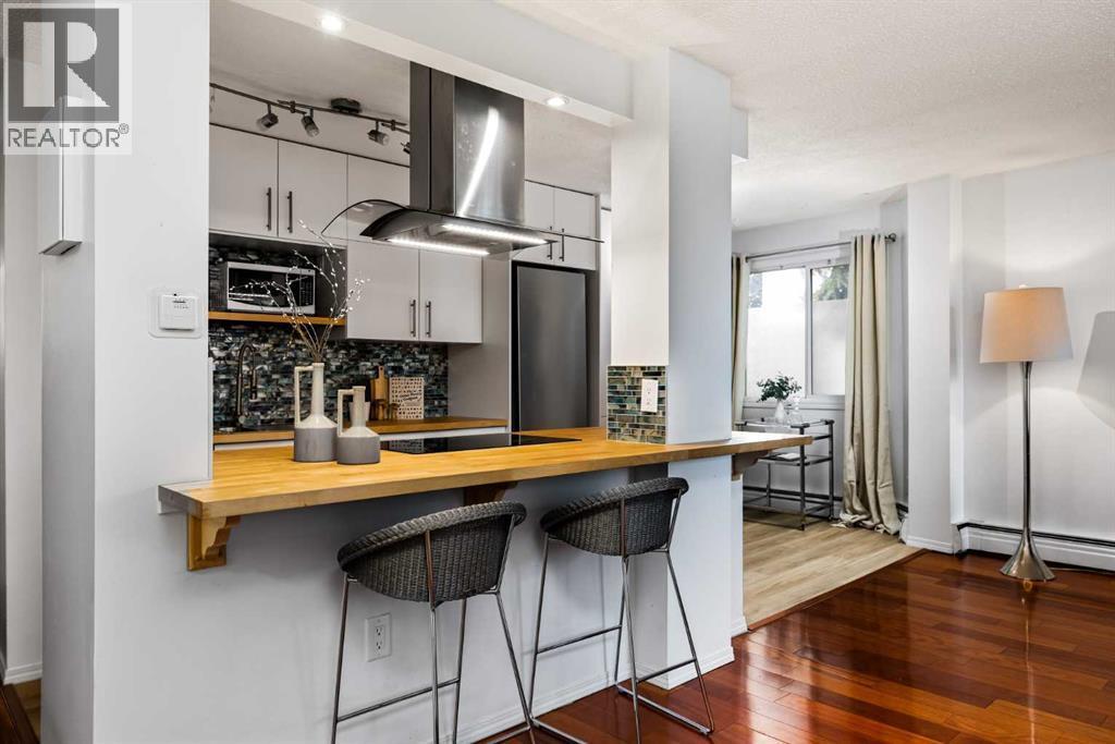 Beautifully updated 2-bedroom end unit in a quiet, well-managed 18+ building backing directly onto the river valley. This bright first-floor home offers windows on three exterior walls for excellent natural light, highlighted by rich hardwood flooring and an open-concept living and dining area that leads to a private covered balcony—perfectly tucked among mature trees for year-round privacy. The modern kitchen features butcher-block counters, white cabinetry, stainless steel appliances, and a stylish breakfast bar. Both bedrooms are generously sized, complemented by an updated 4-piece bathroom and convenient in-suite laundry. Additional perks include a dedicated parking stall, in-suite storage, extra common storage, and secure bike storage. Ideally located on a peaceful crescent within walking distance to Westbrook Mall, the LRT, parks, pathways, and all the amenities of Spruce Cliff—offering a rare combination of privacy, convenience, and inner-city value. (id:6769