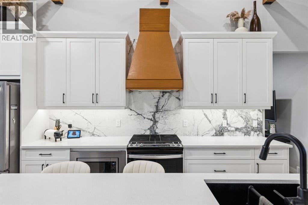 Welcome to this beautifully crafted bungalow that perfectly balances style, comfort, and functionality! Designed with an inviting OPEN-CONCEPT layout, the main floor showcases soaring VAULTED CEILINGS that create a bright and spacious atmosphere. The impressive kitchen features QUARTZ COUNTERTOPS, a statement FEATURE HOOD FAN, updated TILE BACKSPLASH, and plenty of cabinetry—ideal for both entertaining and everyday living. The adjoining living room centers around an ELECTRIC FIREPLACE with a striking FEATURE WALL, adding warmth and modern flair.A stylish MAIN FLOOR OFFICE with a BARN DOOR and custom attachment provides the perfect work-from-home setup. The upgraded LAUNDRY ROOM offers added convenience with COUNTERSPACE, SHELVING, and CABINETRY, complemented by UPGRADED TILE. The elegant HALF BATH is thoughtfully finished with a SLATTED ACCENT WALL, QUARTZ COUNTERS, and UPGRADED FIXTURES.The PRIMARY BEDROOM is a true retreat, featuring a generous WALK-IN CLOSET and a spa-inspired ENSUITE complete with DUAL SINKS and a fully TILED SHOWER.Downstairs, the FULLY FINISHED BASEMENT expands your living space with a cozy FAMILY ROOM featuring a FEATURE WALL and DRY BAR, plus TWO ADDITIONAL BEDROOMS and a MODERN 4-PIECE BATHROOM—perfect for guests or family.Step outside to your WEST-FACING BACKYARD OASIS, highlighted by a TWO-TIERED DECK with PRIVACY WALL, a PERGOLA WITH ROOF, BUILT-IN BENCH, and beautiful LANDSCAPING with florals and a PAVING STONE PATHWAY—all while enjoying scenic views of Cochrane.Located in one of Cochrane’s most desirable communities, this home offers high-end finishes, thoughtful design, and incredible outdoor living—truly a must-see! (id:6769