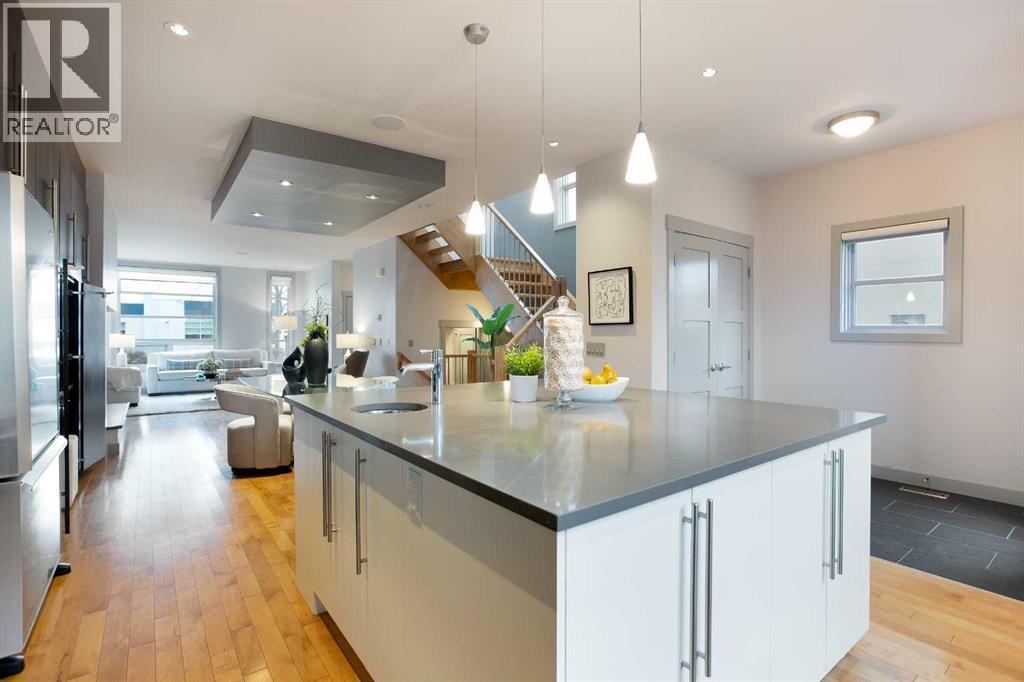 YOUR NEW HOME is an immaculate 4 bedroom contemporary home in desirable Parkdale, located across the street from Westmount Charter. The modern exterior boasts fully insulated acrylic stucco, cedar wood detailing, the aluminum-clad windows provide maximum efficiency. Inside you'll discover over 2,400 sq ft of fully developed living space, maple hardwood floors, stunning, custom open tread solid maple staircase, home audio throughout, and a wide open concept main floor. The front living room with southeast exposed sunlight from the large picture window, is a gorgeous place to enjoy. It is warmed by a cozy gas fireplace, surrounded by built ins. The central dining room leads to the magnificent kitchen where you'll find a wall of storage, including a very convenient office area that can be discretely closed off, quartz counters, espresso cabinets, and high end Thermador gas cooktop, wall-oven, an expansive center island with prep sink and a wine fridge. The gorgeous stairs lead up to vaulted ceilings with 2 skylights, a convenient laundry room, full bath and three generous bedrooms. The tranquil master retreat can host a king size bed and offers a large walk-in closet with custom built-ins and a luxurious 5pc ensuite with his/her sinks, jetted soaker tub, and glass enclosed shower. Downstairs showcases plush carpet, a flex room that can ideally be used as a workspace or library, fourth bedroom and full bath. The private fully-wired media room creates a fantastic space for a man-cave or family movie nights. The West backyard showcases a large stone patio, mature trees, and a double detached garage. Located within minutes to the Bow River pathway system, Foothills Hospital, walk to lots of restaurants, a fast commute to downtown, fast access to Stoney and the highway to the mountains. This outstanding property is ready for you to be home for Christmas! Notable updates: new roof 2024, new central air conditioner 2024. (id:6769