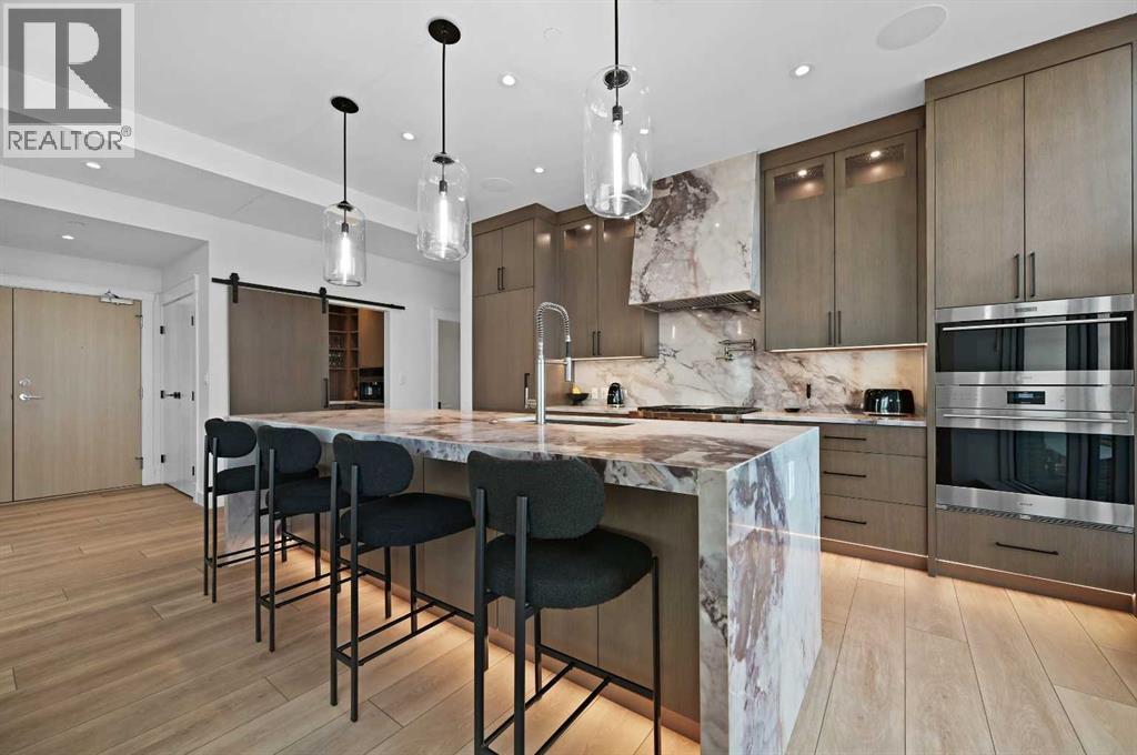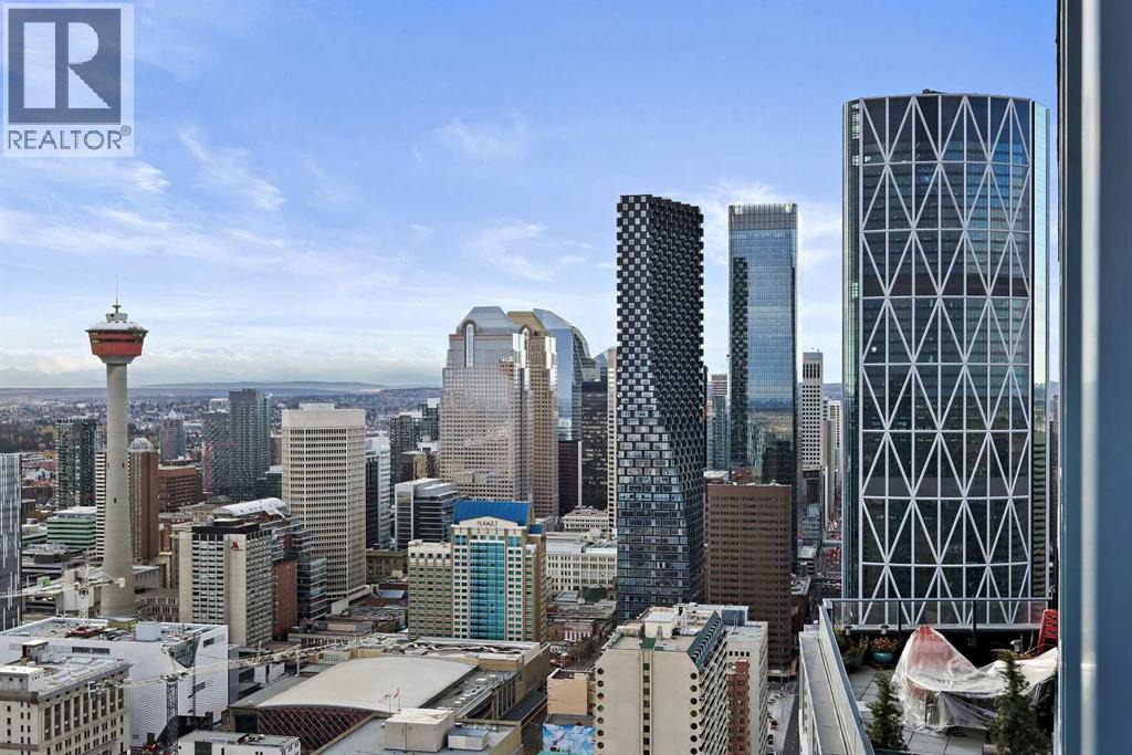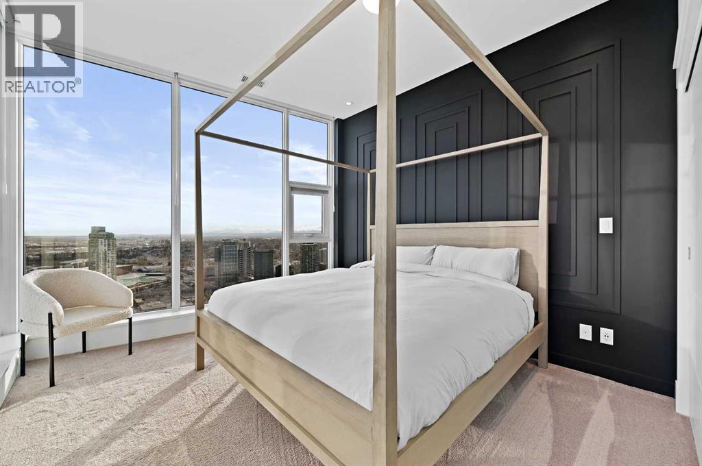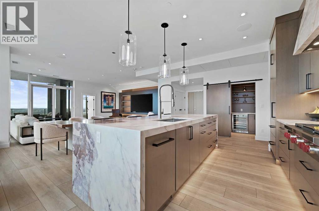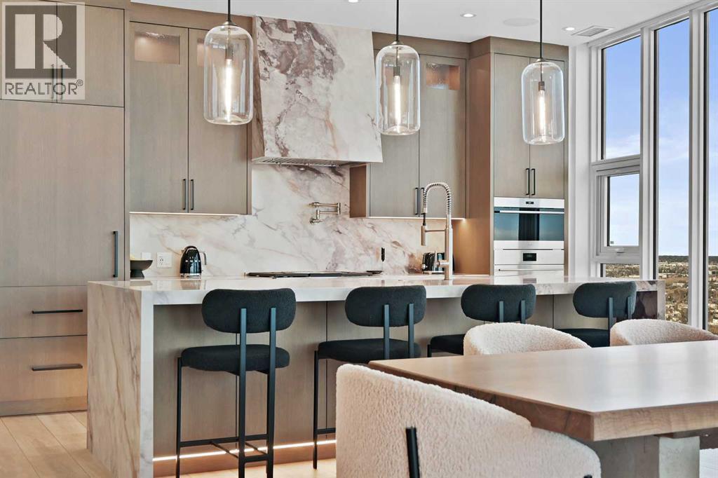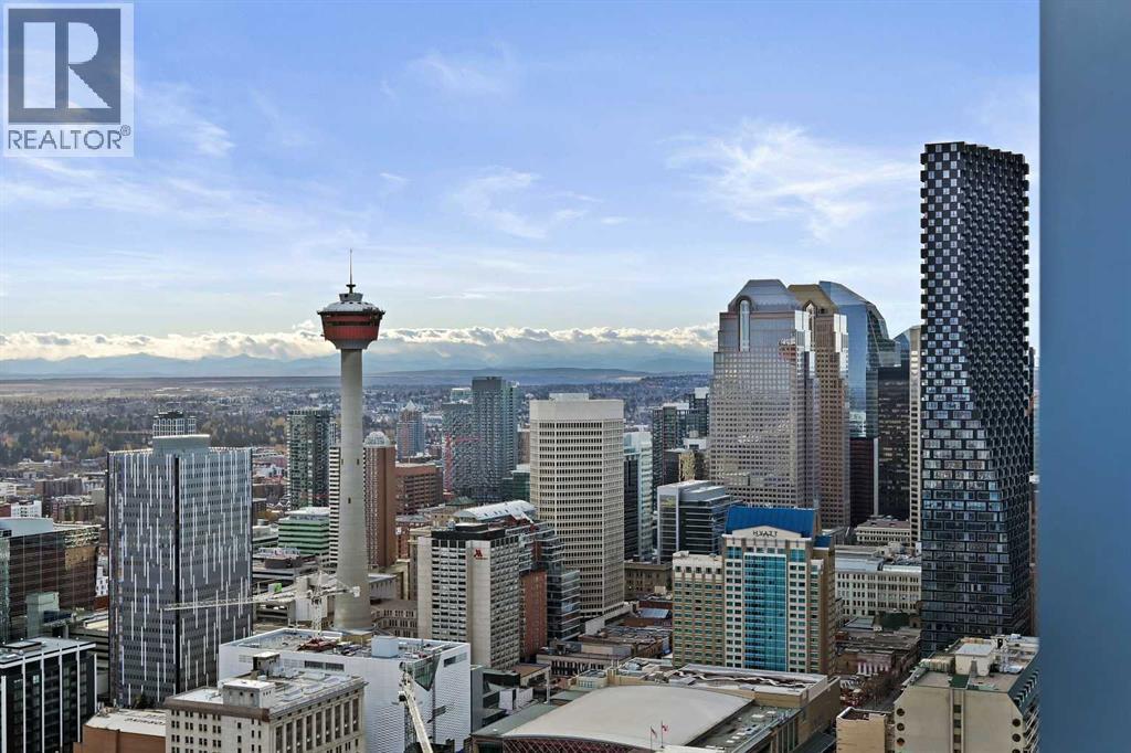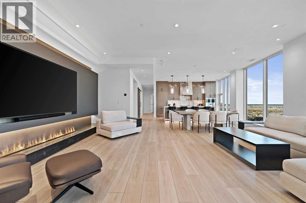 Perched high above the city on the 41st floor of The Arris West, this extraordinary 3-bedroom, 2-bathroom penthouse redefines modern luxury with over $400,000 in bespoke upgrades, world-class amenities, and cinematic, unobstructed views stretching from the majestic Rocky Mountains to the sparkling Bow River and the glowing lights of the Calgary Tower & Saddledome. This is more than a home—it's an elevated lifestyle experience.From the moment you step inside, the grandeur is unmistakable. Floor-to-ceiling windows wrap the expansive open-concept living area, immersing you in panoramic vistas that shift beautifully from sunrise to sunset. Wide 12" oak plank flooring, a Lutron wireless lighting system, integrated Sonos audio, smart thermostats, and power blinds set a refined tone of modern comfort and control.The culinary experience here is nothing short of exceptional. The chef-inspired kitchen showcases quartz waterfall countertops, upgraded fixtures including a premium kitchen faucet and pot filler, and a lineup of elite appliances: 36" Sub-Zero fridge/freezer, Wolf gas cooktop, wall oven and built-in microwave. A rare butler’s pantry—appointed with custom cabinetry, a wine fridge, and an additional built-in Miele coffee machine—elevates both function and sophistication. Host with ease around the oversized island or unwind beside the mesmerizing 80" water-vapour steam fireplace, with a 100" living-room TV creating a true theatre-like atmosphere.All bedrooms are generous in scale, enhanced with custom built-in closets, while the primary suite impresses with its spa-like ensuite featuring double sinks, vanity storage, and an oversized glass-enclosed shower. A well-designed foyer with front closets and full in-suite laundry completes the practical luxuries within.This penthouse also includes an exceedingly rare oversized heated underground double garage with EV charger, plus a large private storage room—a prized convenience in downtown living.Residents enjoy a ccess to Club Arris, a jaw-dropping 25,000 sq. ft. amenity haven featuring a four-season indoor pool, hot tub, dry and steam saunas, an unrivaled fitness centre (spin, weight, yoga, and TRX zones), a lush indoor/outdoor dog park, video-conference rooms, elegant lounges, a party room, and spectacular outdoor terraces with fire pits, barbecues, and even outdoor chess. All of this rests above the new urban-format Real Canadian Superstore—everyday convenience at your doorstep.Sophisticated, smart, and spectacular, this penthouse at The Arris West is a rare offering for those who demand the finest in luxury, lifestyle, and limitless views. Welcome to the pinnacle of urban living! (id:6769