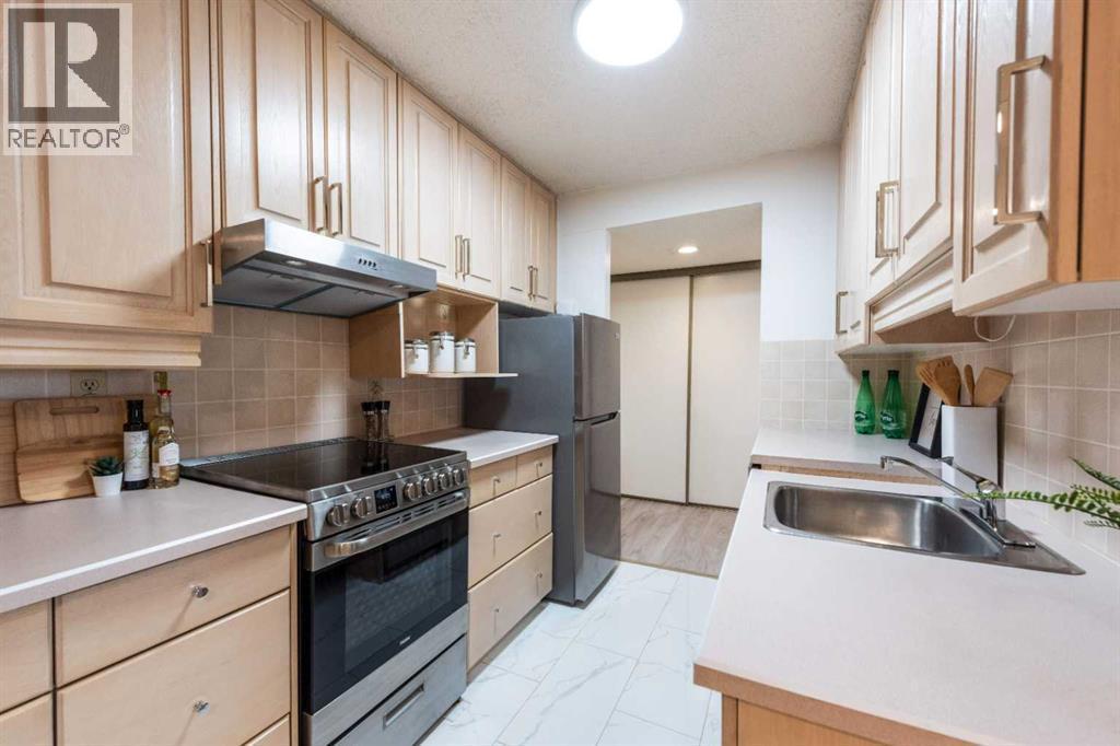 Prime WEST facing 2 bedroom renovated suite with UNDERGROUND parking and IN-SUITE LAUNDRY, in desirable Haysboro – you’re going to love all this quiet, concrete, well managed 18+ adult building has to offer. The suite’s been designed for comfort and convenience and is beautifully renovated and updated, offering nearly 900 SF and showcasing a HUGE west facing balcony. The updated eat-in kitchen showcases gorgeous marble tile flooring, ample cabinets, pull out drawers and storage, stainless steel appliances & ceiling fan. Vinyl plank flooring is featured throughout the main living areas and bedrooms. The spacious living room and dining room is bright and sunny, with a large patio door that leads to the west facing balcony. Primary bedroom easily accommodates king-sized furniture. Renovated and stylish 4 pc bath offers a soaker tub and designer fixtures. Second bedroom offers great flex space and insuite laundry & storage room complete the suite. Condo fees include all utilities—electricity, heat, water, sewer, parking and access to building facilities. The convenience of underground parking is yours, plus the building offers owners amazing amenities & features. The exercise room and outdoor terrace are on the same floor as the suite, there is a main floor social room for family & social gatherings with a large TV, kitchenette, coffee station, puzzle tables, shuffleboard & library. On-site concierge (available 4 hours a day, 5 days a week), bike & tire storage and extra shared laundry is available on each floor. Take advantage of this great location - Walking distance to the LRT station & close to shopping, restaurants, & easy access to major traffic arteries. Book your viewing today! (id:6769