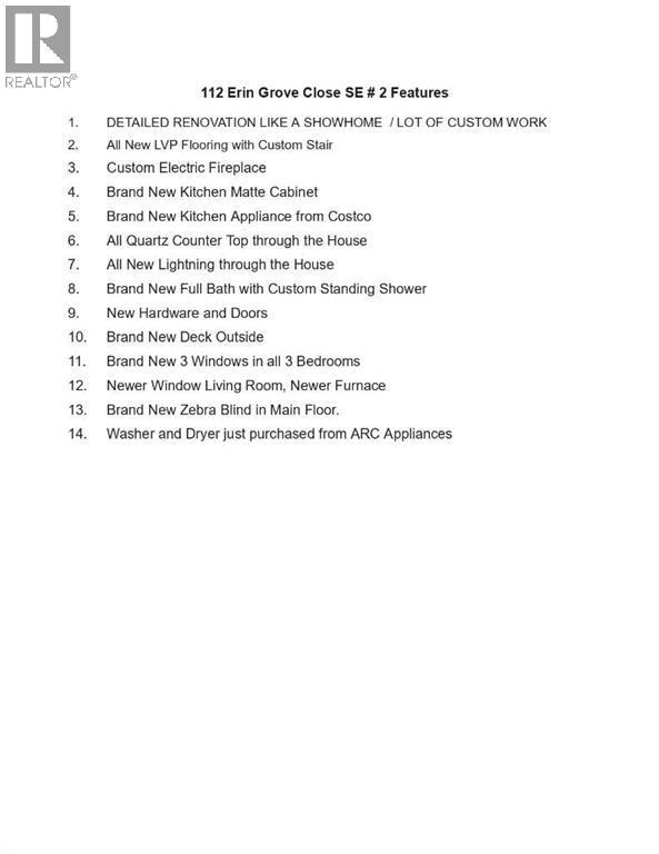 PRICE TO SELL | DETAILED RENOVATION LIKE A SHOWHOME | LOT OF CUSTOM WORK | All New LVP Flooring | Custom Electric Fireplace | Brand New Kitchen Matte Cabinet | Brand New Kitchen Appliance from Costco | All Quarzt Counter Top through the house | Custom Standing Shower | New Hardware and Doors | Brand New Deck | Brand New 3 Windows in all 3 Bedrooms | Newer Window Living Room | Newer Furnace | Brand New Zebra Blind in Main Floor. Welcome to #2, 112 Erin Grove Close SE, a 3 bedroom 1.5 bath two-storey townhome nestled in the heart of Calgary’s Erin Woods community. This home has been fully renovated from top to bottom with premium materials, exceptional craftmanship, functional and style. Luxury vinyl plank floor throughout the house, brand new bedroom windows, brand new kitchen cabinets brand new appliances and bathroom amenities, new deck. Back lane is accessible with one assigned parking slot, and lots of parking right in front of the house. On entering the main foyer, you will find a bright living room, with large windows and a stylish fireplace providing a cozy and modern feel. Kitchen has been fully renovated with quartz counter top, with a large windows overlooking the deck and backyard. Upstairs boasts 3 good sized bedrooms and a full bathroom with modern lights and standing shower. The basement is spacious and not finished, awaiting your personal touch. Located in the tranquil Erin Woods neighborhood, this home is just minutes from schools, parks, shopping, and offers easy access to Deerfoot and Stoney Trail, making commuting a breeze. The area is known for its quiet streets and abundance of green spaces—ideal for families and outdoor enthusiasts. Affordable and move-in ready, this house is a gem and can't be missed. Book your showing today before it's gone. (id:6769