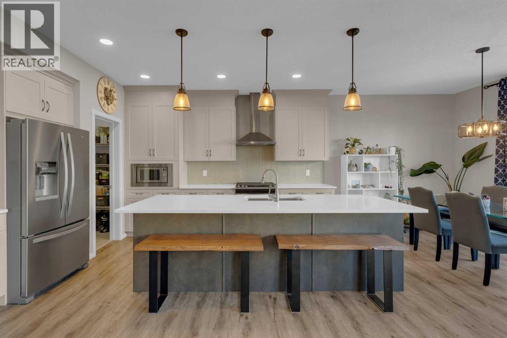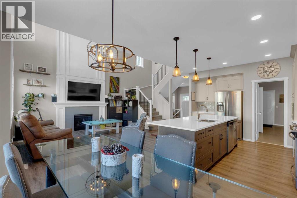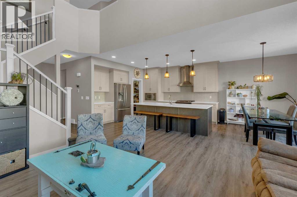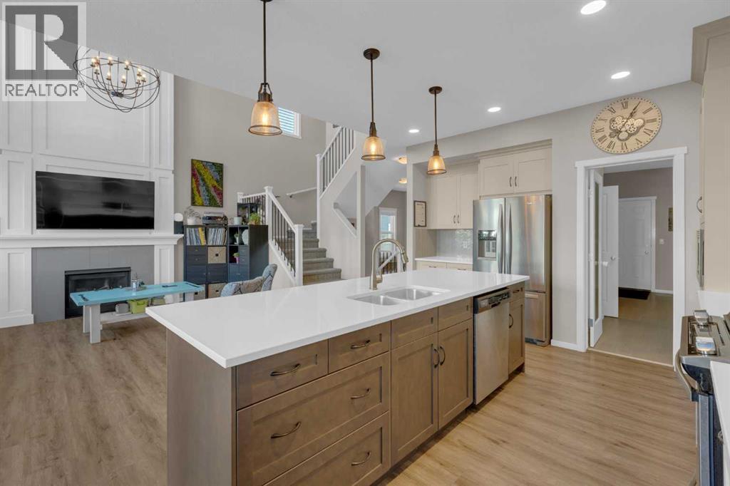Beautifully maintained and upgraded home in the desirable community of Kings Heights in south Airdrie. This stunning air-conditioned property offers an exceptional layout and premium finishes throughout, in a fantastic location with quick and easy access to the highway. Step into the impressive main floor featuring soaring cathedral ceilings and a dramatic floor-to-ceiling fireplace in the bright and open living room. A convenient main-floor office located just off the front entrance provides the perfect workspace for remote professionals or quiet study. The chef-inspired kitchen showcases gorgeous quartz countertops, a 9’ island, stainless steel appliances including a gas stove, and a walk-through pantry leading to the spacious mudroom off the garage. A generous dining area opens onto the oversized deck with gas BBQ line, perfect for entertaining. A convenient 2-piece powder room completes this level. The open staircase leads to the upper level where you’ll find a spacious primary bedroom complete with a luxurious 5-piece ensuite featuring a soaker tub, stand-alone shower, quartz counters with double sinks, and a private walk-through closet that connects directly to the laundry room. A large bonus room with vaulted ceiling, two additional bedrooms, and a 4-piece bathroom complete the upper floor. The walkout basement offers endless possibilities with bathroom rough-in and direct access to the ground-level patio and fully fenced yard. The oversized garage includes 220 power, an 8’ door, and abundant storage space. Additional features include: vinyl plank flooring on the main level, carpet upstairs, tile in bathrooms and mudroom, soft close cupboards and drawers throughout, permanent exterior lighting and excellent curb appeal! Located just a short walk to Heloise Lorimer School (K-5), parks, pathways, shopping, and more. A truly exceptional home in a prime family-friendly location—don’t miss this one! (id:6769