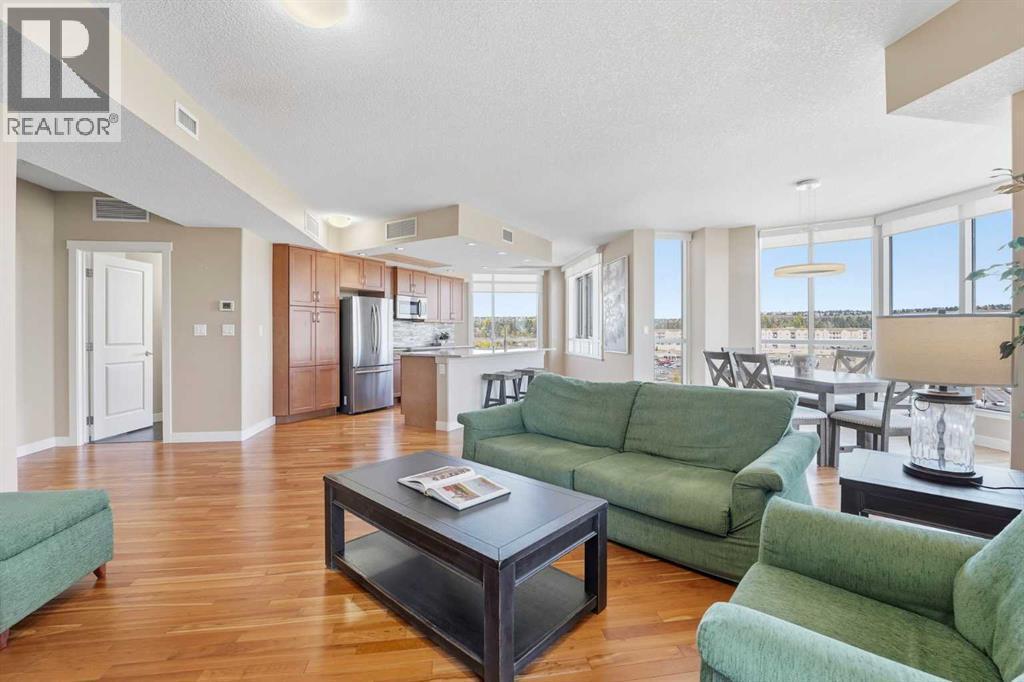 *OPEN HOUSE: SUNDAY DEC 14TH, 10AM-12PM* A rare opportunity to own a luxury residence at The Groves of Varsity—one of Calgary’s most distinguished steel and CONCRETE condominium buildings. This 10TH-FLOOR unit offers unobstructed DOWNTOWN VIEWS, soaring 10-FOOT CEILINGS, and elevated finishings throughout. Step inside to discover EXPANSIVE WINDOWS that fill the home with natural light, and HARDWOOD flooring that flows seamlessly through the open layout. The modern kitchen is both functional and refined, featuring QUARTZ countertops, ample cabinetry, a large CENTRAL ISLAND, and premium stainless-steel appliances—perfect for everyday living or entertaining. The living and dining area opens to a spacious private balcony, ideal for morning coffee or evening sunsets over the city skyline. The primary suite offers generous proportions, a WALK-IN CLOSET, and a well-appointed ensuite bathroom. The second bedroom is full-sized and enjoys DOWNTOWN views right from your window, providing an inviting space for yourself, family or guests. A separate den adds versatility—perfect for a home office, hobby area, or additional storage. This home includes AIR CONDITIONING, TWO TITLED UNDERGROUND PARKING STALLS—SIDE BY SIDE—plus a dedicated STORAGE LOCKER. Comfort is ensured year-round with solid CONCRETE construction providing superior soundproofing and peace of mind. Residents enjoy access to exclusive rooftop amenities, including a fully equipped fitness centre, steam rooms, owners’ lounge, and a large terrace with BBQs—perfect for entertaining or relaxing in every season. The adjacent professional building adds everyday convenience with a pharmacy, medical and dental offices, and two coffee shops right next door. Located within walking distance of groceries, restaurants, shopping, banks, and the LRT, this is a rare opportunity to own a high-floor residence in one of Calgary’s most sought-after and well-managed communities—combining luxury, lifestyle, and location in one exceptional package. (id:6769