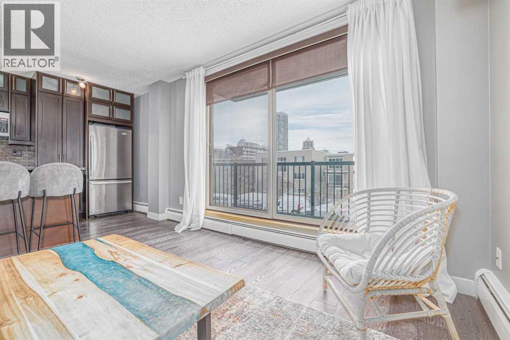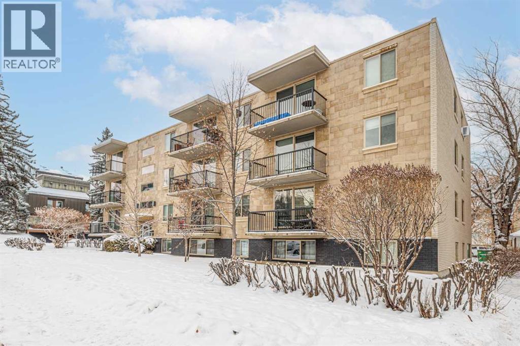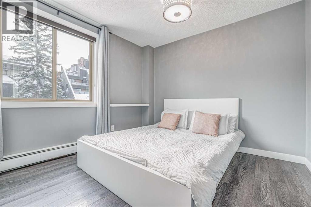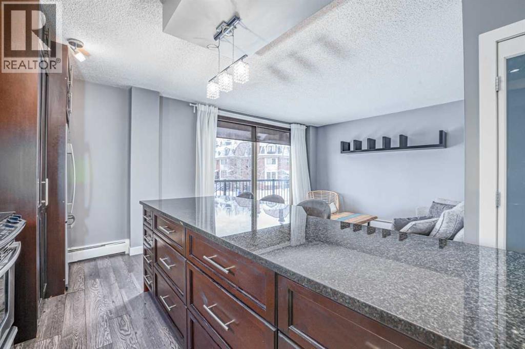 Beautifully updated and move-in ready, this stylish home in the James A Wolfe building pairs modern design with an exceptional Lower Mount Royal location. A $75,000 renovation a few years ago created a warm, contemporary interior where wide-plank flooring, designer lighting and a neutral colour palette establish a cohesive atmosphere. An open floor plan enhances daily living and entertaining, anchored by a chef’s kitchen appointed with granite countertops, upgraded Whirlpool appliances, full-height cabinetry and a generous centre island that encourages gathering and easy conversation. The adjacent living room offers space to relax, while a large patio slider opens to a covered balcony that extends the living area outdoors for summer barbeques, morning coffees and weekends unwinding with impressive downtown views. A spacious bedroom enjoys natural light and quiet comfort, matched by a stylish 4pc bathroom featuring modern finishes. Upgraded in-suite laundry with a Bosch washer and dryer adds additional convenience. Concrete building construction contributes to a peaceful environment along with the advantage of bike storage and the unit includes what may be the best extra-large end corner parking stall in the complex, offering ease and flexibility for larger vehicles. Reasonable condo fees support well-managed building operations. The setting places you steps from the energy of 17th Ave where boutique shops, cozy cafes, restaurants and pubs create a vibrant streetscape. Walk or bike to downtown, explore nearby pathways along the Bow River or reach MRU in minutes by car. This is an opportunity to enjoy a refined, urban lifestyle in one of Calgary’s most sought-after inner-city neighbourhoods! (id:6769