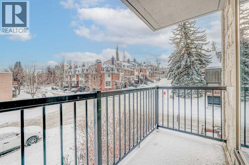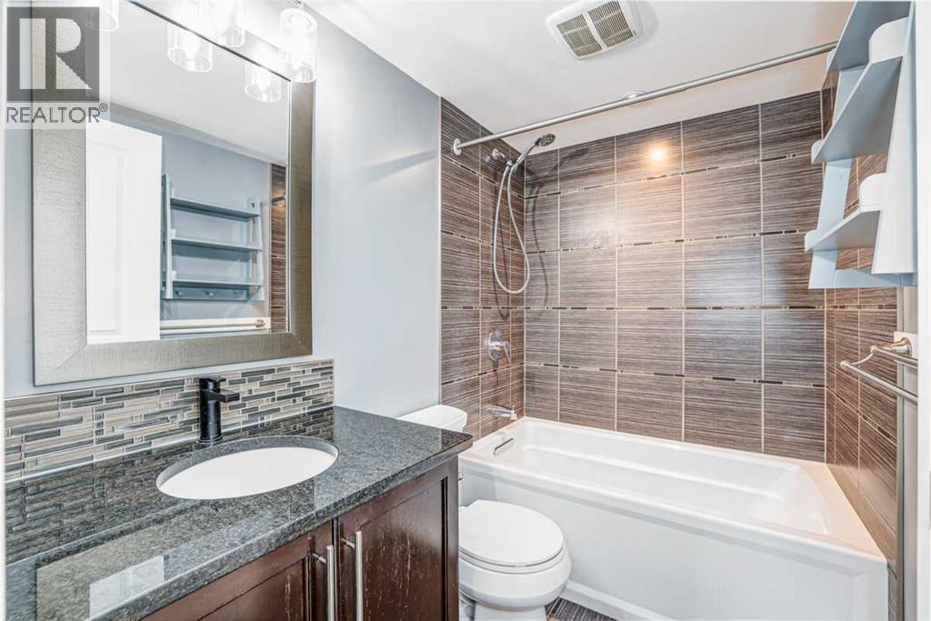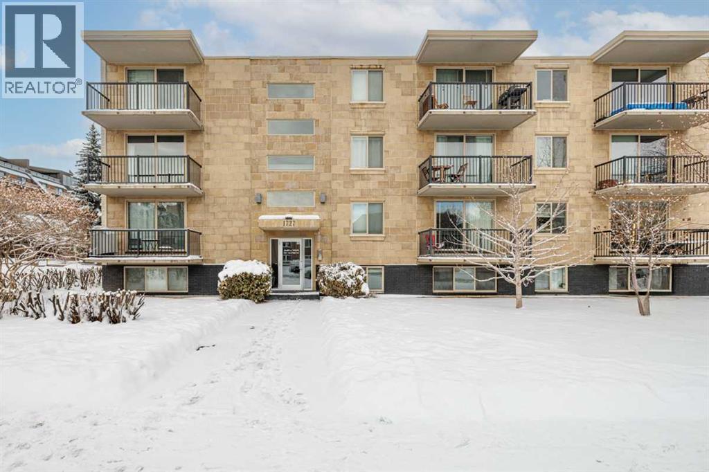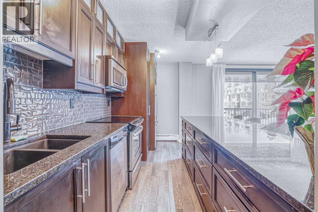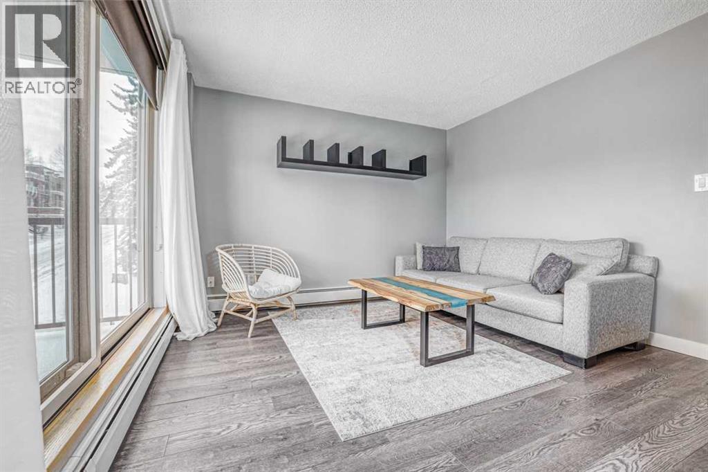 Beautifully updated and move-in ready, this stylish home in the James A Wolfe building pairs modern design with an exceptional Lower Mount Royal location. A $75,000 renovation a few years ago created a warm, contemporary interior where wide-plank flooring, designer lighting and a neutral colour palette establish a cohesive atmosphere. An open floor plan enhances daily living and entertaining, anchored by a chef’s kitchen appointed with granite countertops, upgraded Whirlpool appliances, full-height cabinetry and a generous centre island that encourages gathering and easy conversation. The adjacent living room offers space to relax, while a large patio slider opens to a covered balcony that extends the living area outdoors for summer barbeques, morning coffees and weekends unwinding with impressive downtown views. A spacious bedroom enjoys natural light and quiet comfort, matched by a stylish 4pc bathroom featuring modern finishes. Upgraded in-suite laundry with a Bosch washer and dryer adds additional convenience. Concrete building construction contributes to a peaceful environment along with the advantage of bike storage and the unit includes what may be the best extra-large end corner parking stall in the complex, offering ease and flexibility for larger vehicles. Reasonable condo fees support well-managed building operations. The setting places you steps from the energy of 17th Ave where boutique shops, cozy cafes, restaurants and pubs create a vibrant streetscape. Walk or bike to downtown, explore nearby pathways along the Bow River or reach MRU in minutes by car. This is an opportunity to enjoy a refined, urban lifestyle in one of Calgary’s most sought-after inner-city neighbourhoods! (id:6769