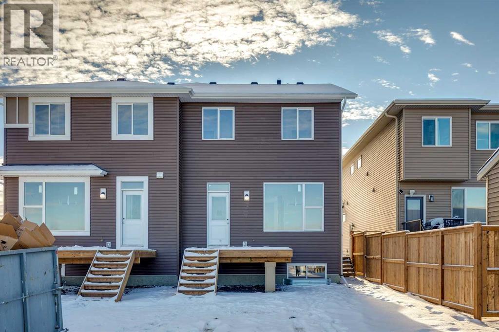 Welcome to this modern Morrison Homes 3-bedroom duplex in the sought-after community of Glacier Ridge. The main floor offers an inviting living area with an electric fireplace, knock-down ceilings, vinyl flooring, and a stylish kitchen complete with a central island, pantry, quartz countertops, a built-in microwave, and a fridge with a water line. A half bath on this level provides added convenience for guests. Upstairs features three generous bedrooms including the primary bedroom with its own 4-piece ensuite, plus a second 4-piece bathroom and a convenient laundry area. The basement includes a separate side entrance, a 9’ foundation, and rough-ins for a future suite (a secondary suite would be subject to approval and permitting by the city/municipality) offering excellent potential for added living space or income generation. Outside, you’ll find a deck with a built-in gas line for your BBQ, plus a gravel parking pad providing easy off-street parking. Glacier Ridge Village is expected to open in 2026 and will feature a skating ribbon, walking paths, basketball courts, an all-ages playground, spray park, tennis court, ice rink, patio spaces, firepit, and a toboggan hill. Inside, residents will enjoy a gymnasium, rentable rooms for programs and private events, banquet space, and welcoming seating and gathering areas. Located in one of Calgary’s newest and most desirable communities, this home blends modern comfort with exceptional future amenities. (id:6769