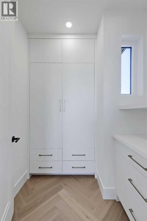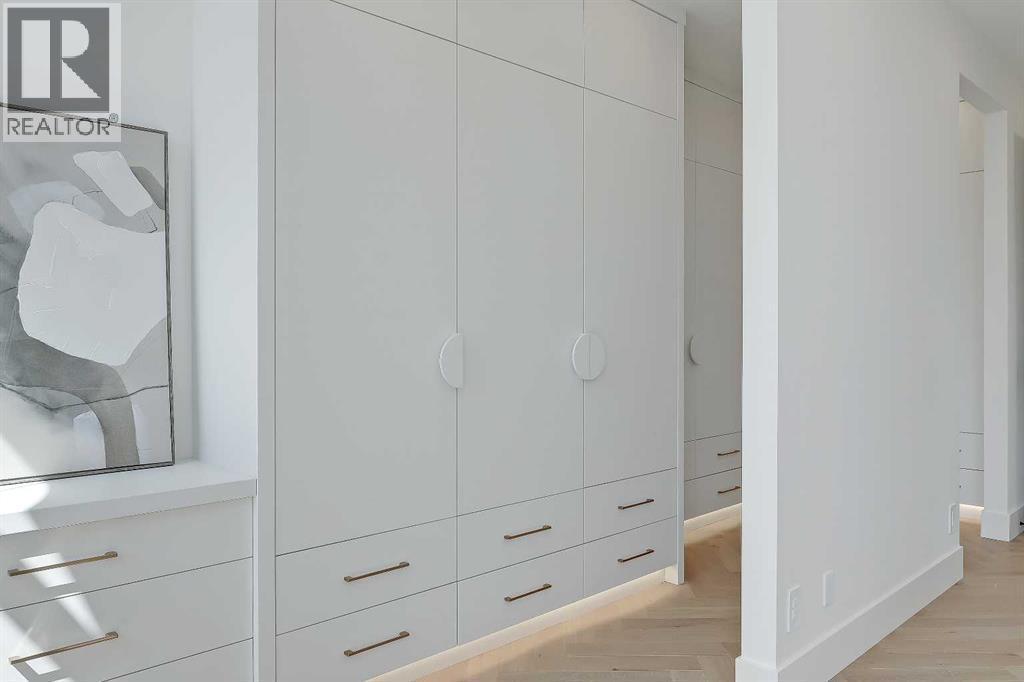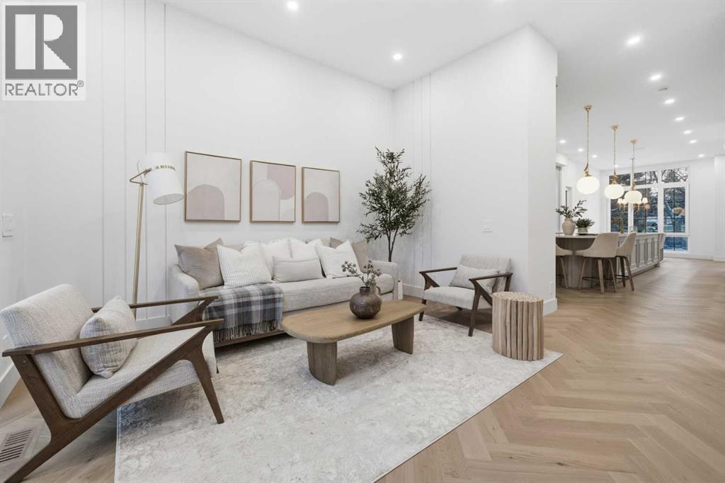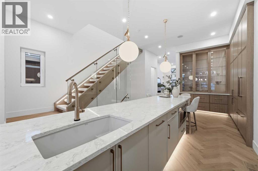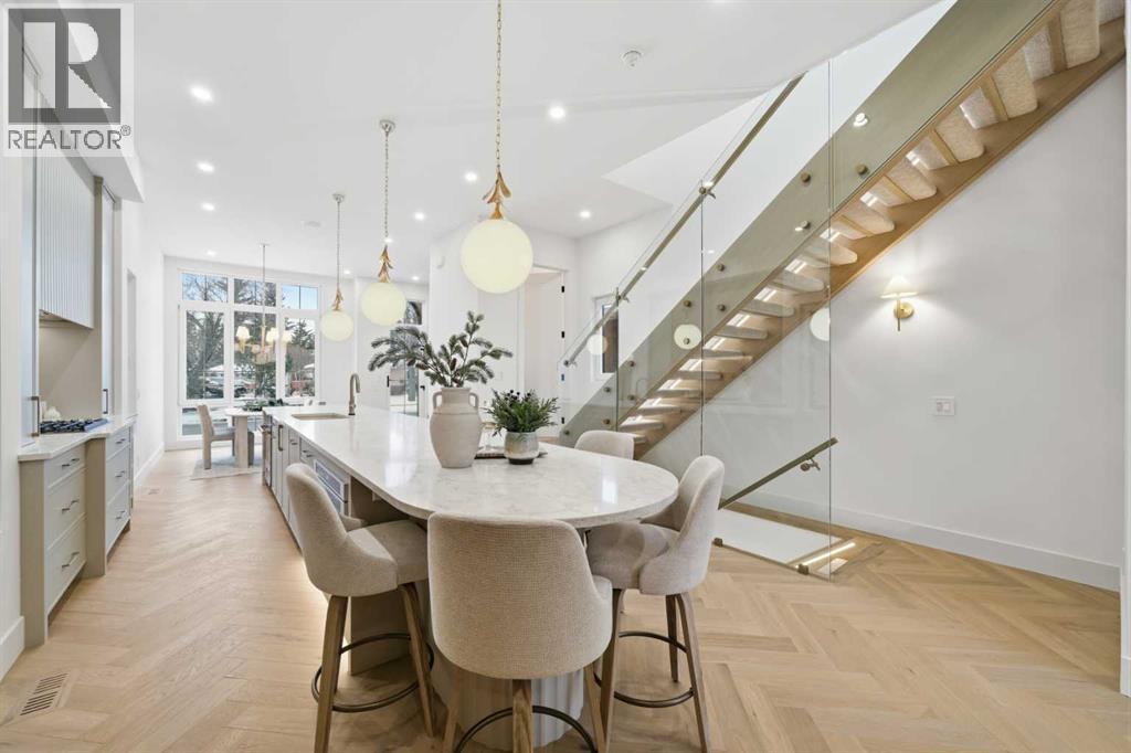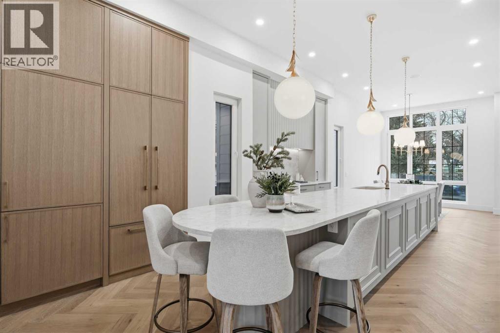 **Get $10,000 Back! Make your move into luxury living effortless with this exclusive buyer bonus.**Located in the heart of North Glenmore Park, this move-in-ready luxury detached infill by Black Label Designer Homes offers refined architecture, elevated finishes, and a thoughtfully designed layout on a quiet, tree-lined street near parks, schools, and the golf course. The main floor is anchored by 11-ft ceilings and wide-plank engineered white oak herringbone hardwood, setting a sophisticated tone from the moment you enter. A full-height glass front door opens to a welcoming foyer with custom millwork and integrated storage. The front dining room offers a more formal gathering space, while the central kitchen is a true showpiece, featuring full-height custom cabinetry and a sculptural, rounded quartz island with a waterfall edge.The upgraded JennAir RISE appliance package includes a 36” gas cooktop, built-in wall oven, under-counter microwave drawer, panel-ready refrigerator, and dishwasher. Additional highlights include a Blanco undermount sink, Delta faucet, pot filler, and integrated LED undermount and skirt lighting found throughout the home. The rear living room is filled with natural light and centred around an elegant gas fireplace with a custom porcelain two-tiered mitre mantle and built-in cabinetry.A functional mudroom connects to the detached double garage, offering quartz bench seating, custom storage, and everyday convenience. The powder room makes a bold design statement with a curved vanity, quartz surfaces, designer lighting, and a VOVO smart bidet toilet.Upstairs, the vaulted primary suite features open wood beams, oversized windows, and a walk-through closet with custom built-in millwork and LED lighting. The spa-inspired ensuite includes a freestanding soaker tub, dual vessel sinks, quartz counters, a built-in steam shower with body jets, and a skylight. All bathrooms throughout the home feature in-floor heating and VOVO smart bidet toil ets, including the upper main bath with a wood slat feature wall. The upper laundry room is finished with quartz counters, designer tile backsplash, custom cabinetry, and a hanging rod. Two spacious secondary bedrooms with walk-in closets complete the upper level.The fully developed basement expands the living space with a large recreation room, fourth bedroom or gym, full bathroom, and a striking wet bar with quartz countertops, island, dishwasher, and bar sink—ideal for entertaining. A tankless hot water heater ensures year-round comfort.North Glenmore Park is one of Calgary’s most desirable inner-city communities, offering a rare blend of tranquility and convenience. Steps from Glenmore Athletic Park, Sandy Beach, and the Elbow River pathway system, and walking distance to North Glenmore Park School and Central Memorial High School, with quick access to Mount Royal University, Lakeview Golf Course, Marda Loop, and major routes including Crowchild, Glenmore, and Sarcee Trail. (id:6769