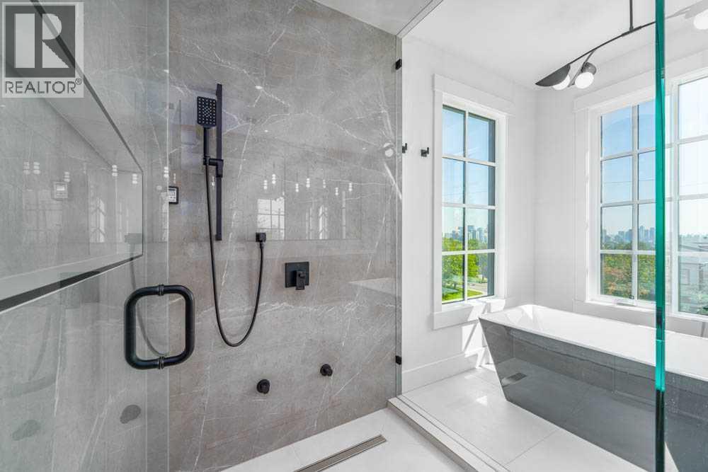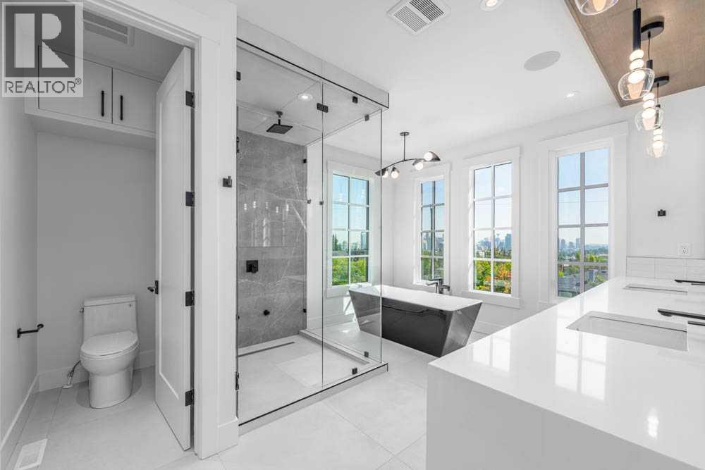 Exquisite Modern Corner Home with Panoramic Downtown Views. This striking luxury contemporary corner home, is perfectly positioned in one of Calgary’s most sought after inner city neighbourhoods. From the moment you arrive, the home’s bold architecture, oversized windows, and meticulously landscaped, low maintenance yard with automatic irrigation, make a lasting impression. Step inside to soaring ceilings and sun drenched spaces that immediately evoke a sense of openness. The formal dining area, surrounded by windows, is ideal for entertaining, while a discreet powder room and custom wine storage add subtle touches of luxury. At the heart of the home, the chef’s kitchen impresses with premium Fisher & Paykel appliances, elegant quartz countertops, statement tile, and a butler’s pantry to keep everything organized. The oversized island is perfect for cooking, gathering, or casual dining, and the cozy breakfast nook opens onto a private terrace, seamlessly connecting indoor and outdoor living. The family room is anchored by a dramatic floor to ceiling stone fireplace and provides direct access to the terrace with sweeping downtown views, perfect for relaxing evenings or weekend entertaining. A striking glass enclosed staircase adds architectural drama while allowing natural light to flow throughout the home. Upstairs, the luxurious primary suite serves as a private retreat. It features dual custom closets, a built-in vanity, and a spa inspired ensuite with heated floors, a deep soaker tub with downtown views, double sinks, a rainfall steam shower, and high-end finishes. Two additional bedrooms offer flexible space for children, guests, or home offices, with a full bathroom that also includes in-floor heating and ample storage. The upstairs laundry room, equipped with high-end washer and dryer and abundant cabinetry, makes daily tasks effortless. The fully developed lower level expands your living space with a spacious recreation room, custom wet bar with wine fridge and integrated dishwasher, perfect for entertaining. Radiant in-floor heat ensures comfort year round. A fourth bedroom and full bathroom provide additional space for guests or teens, while an oversized mudroom with smart storage connects directly to the heated double garage. Additional features include central AC, integrated lighting, and high-end Hunter Douglas remote operated blinds throughout, fully programmable via app for complete convenience and privacy control. This home blends luxury, style, and practical functionality, with a location that puts the best of Calgary’s inner city right at your doorstep. Don’t miss this rare opportunity to own a home that elevates both everyday living and entertaining. Please see 3D tour and video. (id:6769