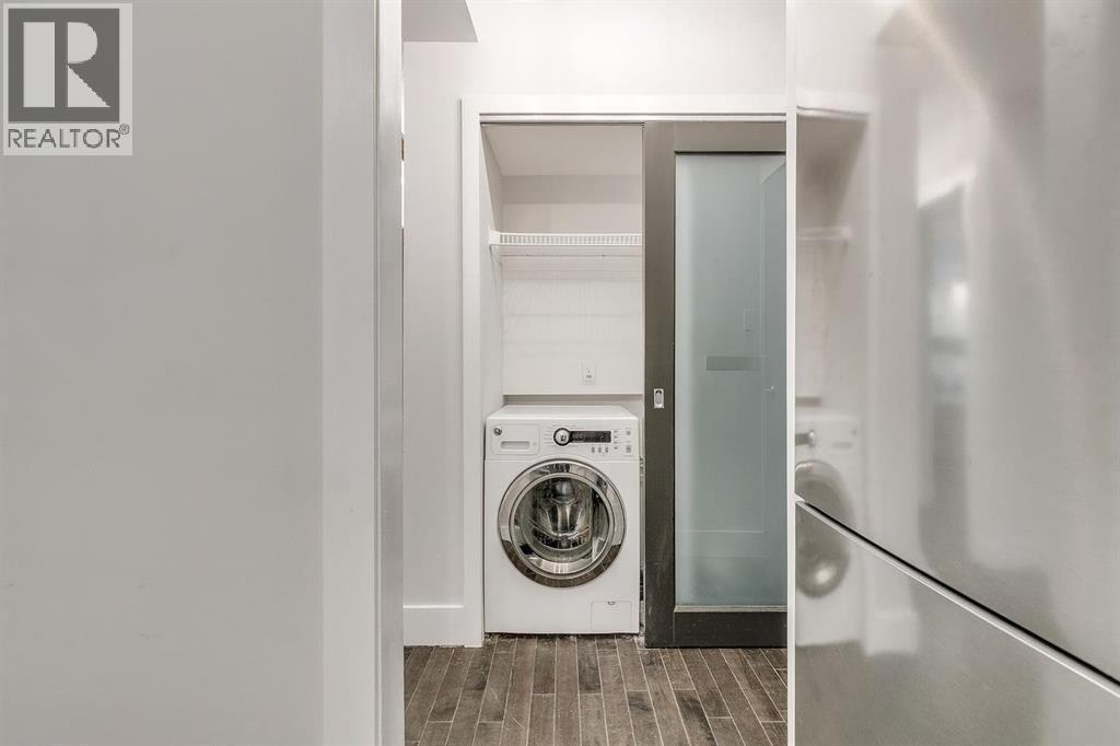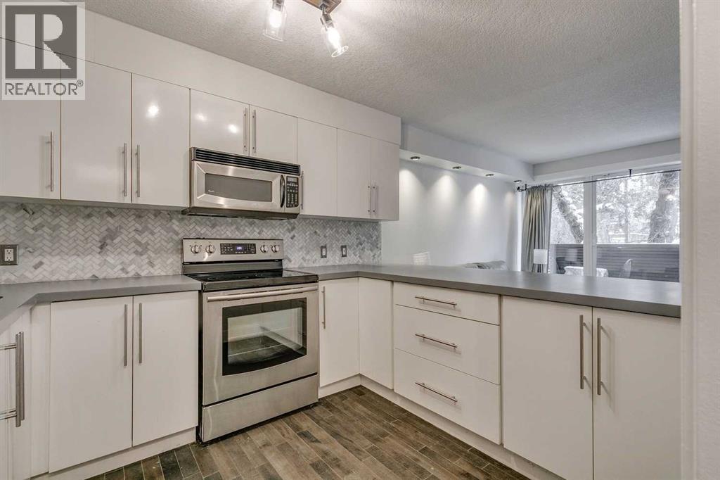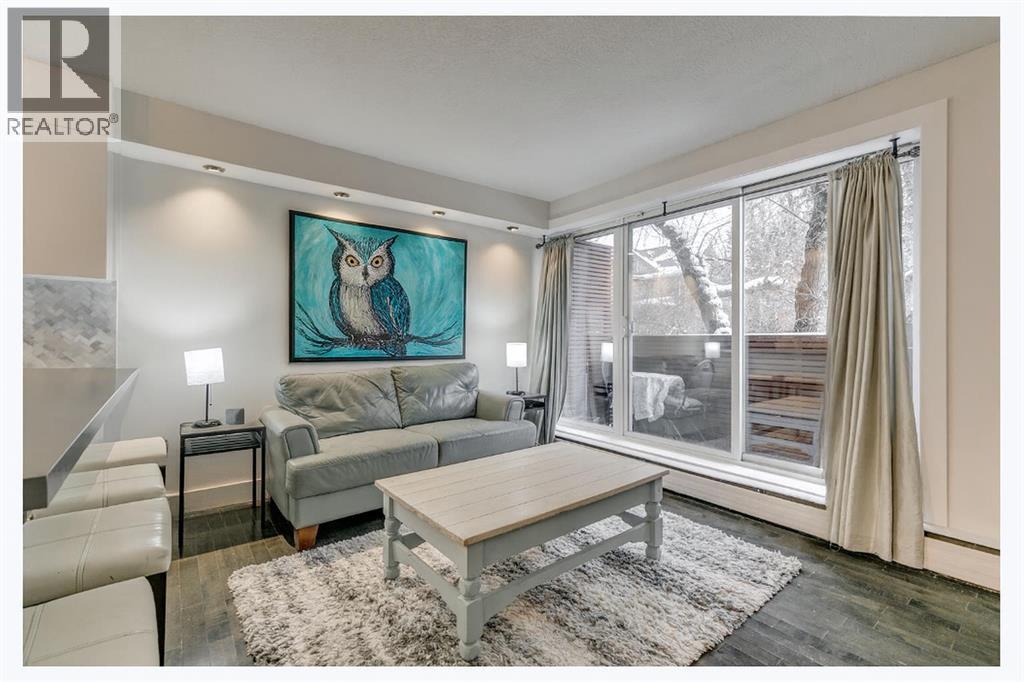 This one bedroom, one bathroom condo is in CONCRETE building with a healthy reserve fund. Located on a charming, tree-lined street in the heart of Lower Mount Royal, this well-designed condo delivers the walkable lifestyle everyone wants. Just two blocks from vibrant 17th Ave SW and steps to the #2 bus route, you can leave the car parked and save the commute stress for someone else. The living room features expansive WEST- facing windows that open to a well sized balcony—perfect for a BBQ and lounge seating. Mature trees create natural privacy and shade, making it a true outdoor extension of your living space. The kitchen is smartly configured with ample cabinetry, full-height uppers, a breakfast bar and stainless-steel appliances, (NEW FRIDGE in 2025) and recently REFINISHED COUNTERTOPS and NEW BACKSPLASH. The bedroom includes a large walk-in closet and a sliding privacy-glass door.Hardwood floors and recessed lighting run throughout, with NEW TRACK LIGHTING recently installed. You’ll also appreciate the in-suite European washer plus extra storage. The building is concrete, equipped with an elevator, secure bike storage and shared laundry, and does not permit short-term rentals, keeping things peaceful for residents. An assigned parking stall is included, and the area qualifies for residential street parking permits for just $45/year. Quick access to Downtown, the Beltline, U of C, Mount Royal University, Stampede Park and the new BMO Event Centre. With condo fees less than $360 this unit is sure to impress. (id:6769