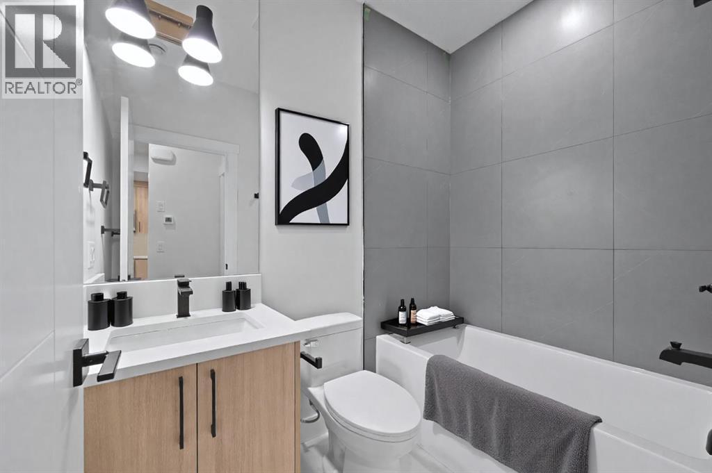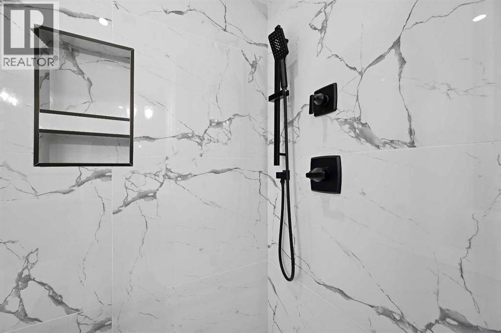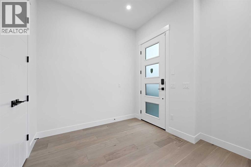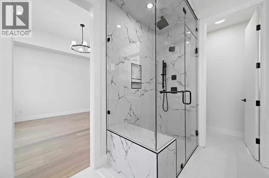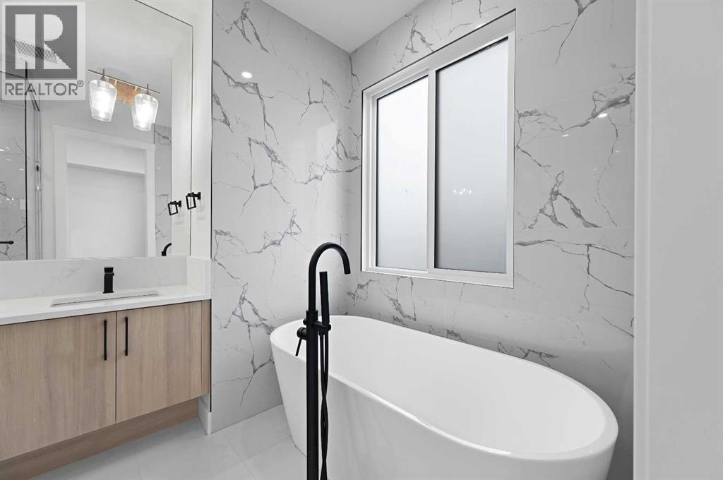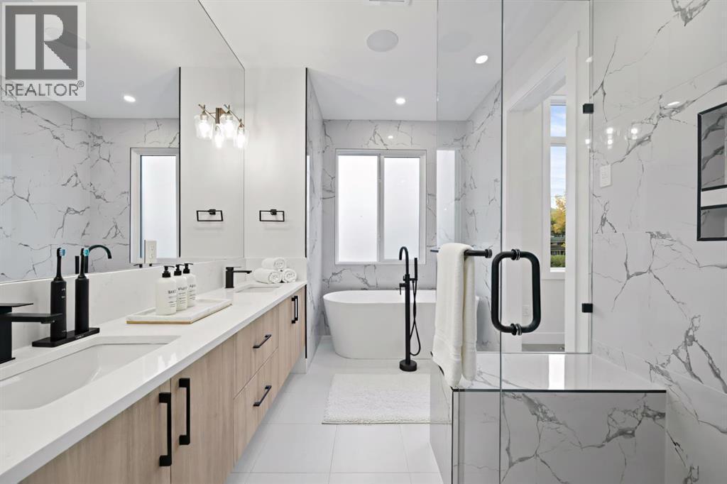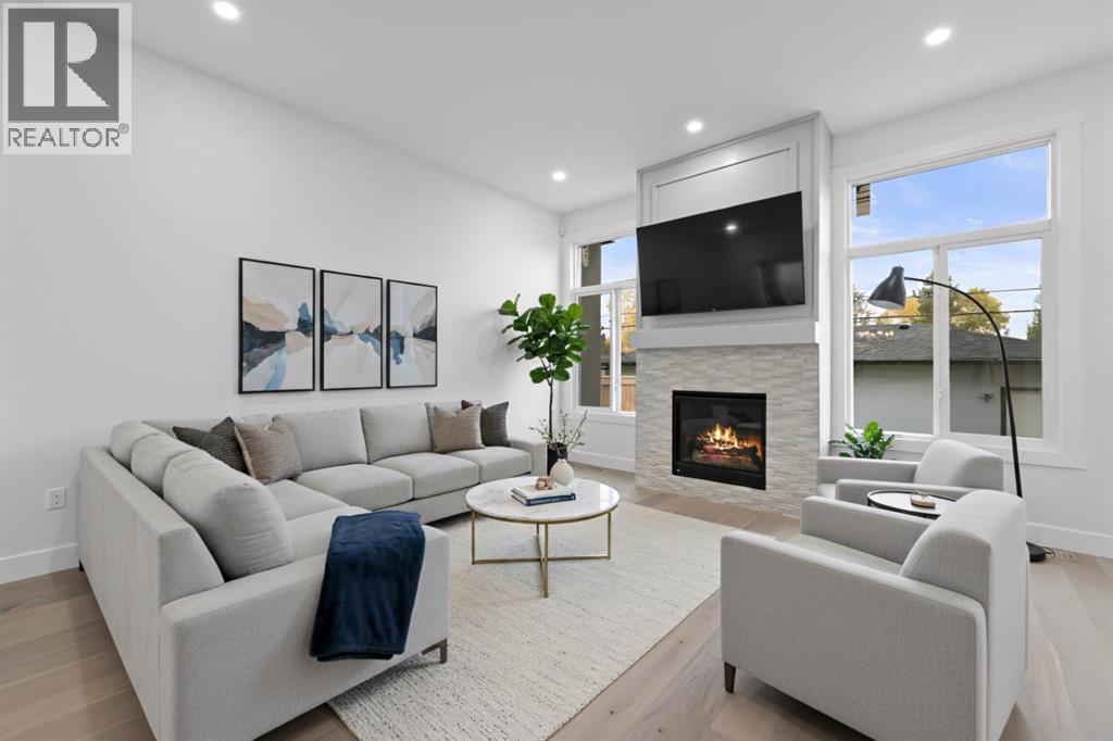 I'm excited to present this brand-new, move-in ready luxury infill with double garage and situated on an oversized 27' wide lot located on a convenient street in Bowness. This property boasts elevated design and incredible functionality, featuring a legal 2-bedroom basement suite and a sunny south exposed front with expansive valley views from the upper floor. Every detail was thoughtfully selected, from the wide-plank modern floors to the curated lighting and premium finishes throughout. Step inside to a bright, open-concept main floor with 10' ceilings, oversized windows and neutral tones that create an airy, inviting vibe. The large, well-lit dining room is perfect for bigger families and/or hosting guests and shows off a vibrant and colourful feature wall, which flows seamlessly into a designer kitchen featuring modern warm toned cabinetry, paired with beautifully coloured glass backsplash, quartz countertops, matte black hardware, a huge walk-in pantry with built-in shelving, and a perfect-sized center island with bar seating with more natural wood tones, bringing everything together beautifully. The upgraded stainless steel appliance package includes an oversized sub zero fridge with french doors, a gas cooktop with stylish hood fan, and a thoughtfully placed wall oven and microwave. The rear living room is wide and spacious featuring additional large windows plus a cozy gas fireplace with stone surround and custom mantle, and which leads you out to the large backyard, which features an oversized concrete pad, perfect for end of the day BBQ's and lounging. An enclosed mudroom with a large closet area and a sleek powder room that comes with a raised matte black sink complete the mainfloor. Upstairs contains the three large bedrooms, all with trayed ceilings, including the primary bedroom which is a true retreat that features a large walk-in closet with several custom built-ins plus a hotel like ensuite. Enjoy heated tile flooring, dual sinks, quartz countertops , matching tile surrounds, plus a free standing soaker tub and an oversized glass shower with rain shower head and roughed-in for steam. The upper laundry room comes with a sink, quartz countertops, additional wood toned cabinetry, and is situated beside the stylish full bathroom which features a tiled tub/shower combo. Downstairs features the thoughtfully designed legal 2 bedroom suite and features 9' ceilings, luxury vinyl plank flooring, wonderfully warm toned cabinetry, stainless steel appliances and lots of pot lighting. A full bathroom with elegant tile is also featured plus a dedicated laundry room, separate side entrance and storage, making this perfect for rental income or multigenerational families. Additional features include roughed in A/C, built-in speakers and each room wired for Cat5 data. This is truly exceptional value! Call your favorite agent today to view the excellent inner city new build. (id:6769
