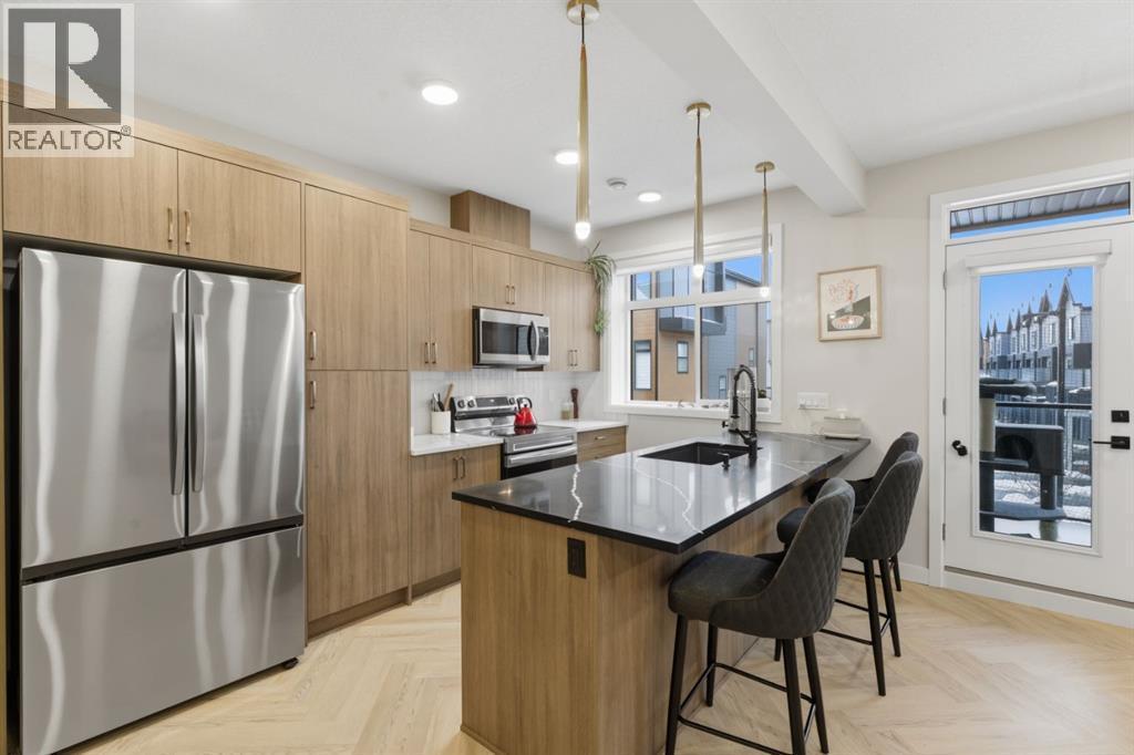 Welcome to this stunning 1,520 sq. ft. townhome located in one of Calgary’s most sought-after neighborhoods! Seton is a vibrant, master-planned community designed for exceptional living. Perfectly situated minutes from the world’s largest YMCA, the South Health Campus Hospital, and an impressive variety of shops, restaurants, and schools, this home combines comfort, luxury and unmatched convenience. Quick access to Deerfoot and Stoney Trail makes commuting simple, while Seton’s parks, green spaces, and recreation options create a lifestyle that truly stands out. As soon as you set foot inside this home you’ll appreciate the quality. The main floor greets you with gorgeous luxury vinyl plank set in a classy herringbone pattern. You’ll love the well-appointed kitchen which features recessed lighting and upgraded fixtures, natural-toned cabinetry with ample storage, quartz counters and an eating-bar island that’s perfect for casual meals or entertaining. The spacious and welcoming living area and dining room are illuminated with plenty of natural sunlight from the large windows. Off the living room, you’ll find a private balcony (the first of two in this home) that’s ideal for enjoying your morning coffee or unwinding in the evening. A convenient two-piece bathroom completes the main level. Upstairs, the primary bedroom features a walk-in closet, private access to a bright office or flex space, a second private balcony and a luxurious five-piece ensuite equipped with dual sinks. The tasteful wall décor throughout adds personality and warmth, giving the home a cozy and well put together feel. This level also includes upper laundry, along with a second bedroom featuring its own walk-in closet and access to a four-piece bathroom. Additional highlights include an attached garage with upgraded epoxy floors, providing secure parking and extra storage, an upgraded Navien on-demand hot water system, descaler, new home warranty and much more! Seton isn’t just a neighborhood; it’s a lifestyle. Don’t miss this rare opportunity to own a beautifully designed townhome in an unbeatable location. (id:6769
