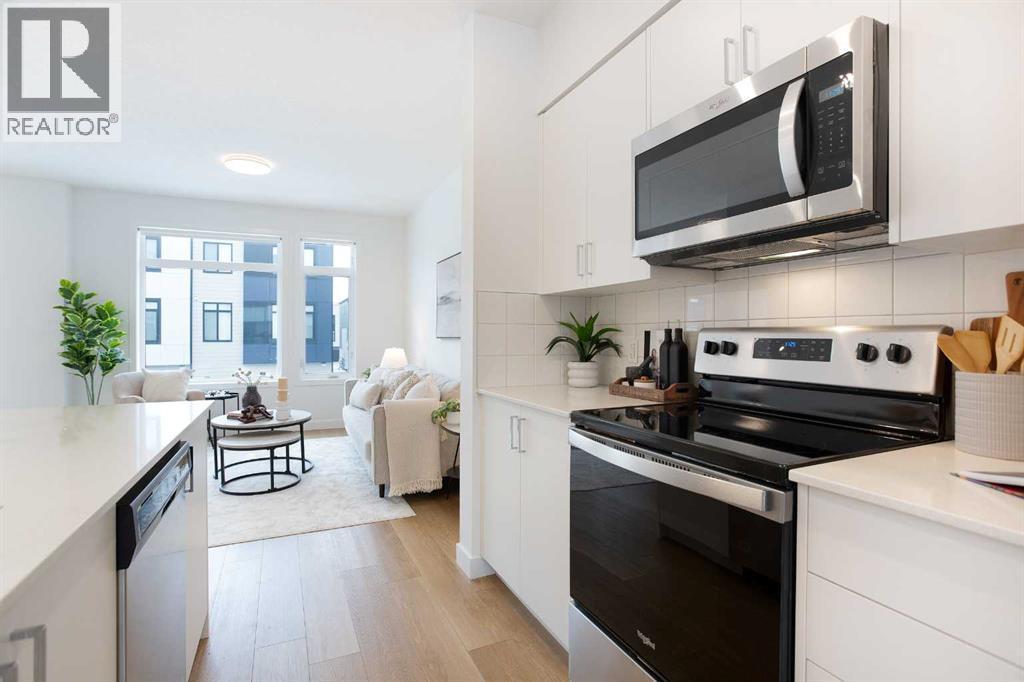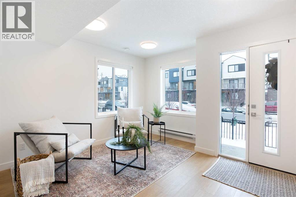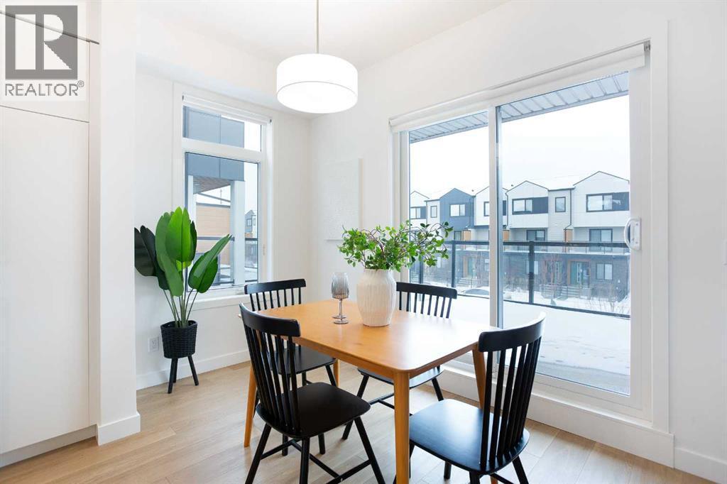 Step into a world where sophistication seamlessly meets everyday comfort in this remarkable contemporary townhome. Boasting over 1,634 sqft spread across three impeccably designed levels, this residence features three spacious bedrooms and two and a half bathrooms, offering an environment of refined, turn-key living. The moment you enter the welcoming foyer, you are greeted by a beautiful main floor living room, bathed in an abundance of natural light. This ground floor ensures ultimate functionality, featuring a generously sized coat closet, utility room, and a practical mudroom that provides direct, access to your convenient double attached garage. Upstairs, discover the heart of the home - a bright and open haven for both daily life and entertaining. The family room provides an idyllic setting and offers a bright and inviting ambience. The stunning, modern kitchen showcases sleek countertops, ample cabinetry, and is anchored by a large center island that provides comfortable seating for four. This culinary space flows effortlessly into the generously sized dining room. Extending your living space outdoors is a sunny balcony located just off the dining area—the perfect spot for enjoying your morning coffee or hosting summer evening gatherings. For the convenience of your guests, a stylish two-piece powder room completes this impressive main entertaining level. The private upper level is dedicated to peaceful relaxation. The flooring transitions to plush carpeting, creating a tranquil environment for the three spacious bedrooms. The primary suite is a true retreat, featuring a private three-piece ensuite and a dedicated walk-in closet. The two additional great-sized bedrooms, each with ample closet space, share a well-appointed four-piece main bathroom, plus an essential addition to this floor is the conveniently located upper-level laundry room. Beyond the elegant interior, this home offers superb comfort and convenience, including central air conditioning, parkin g for 4, plus a storage room within the garage. Designed for those who value style, comfort, and unparalleled convenience, this home checks all the boxes. Set in Belvedere—one of Calgary’s most exciting and fast-growing neighborhoods, you are placed moments from everything you need. Whether you’re a first-time buyer, growing family, or investor, this property is a must-see so book your showing today! (id:6769