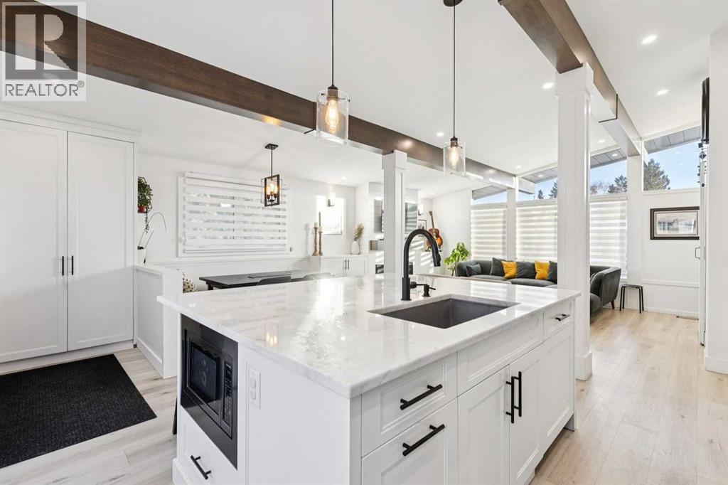 Beautifully renovated and set on a private corner lot in the heart of Acadia, this stunning 4-bedroom home offers over 2,200 sq ft of modern, redesigned living space. Every level has been thoughtfully updated with quality finishes, creating a warm, inviting home that blends style, comfort, and exceptional functionality.Step inside to a bright main floor featuring vaulted ceilings, striking exposed beams, and floor-to-ceiling windows that flood the space with natural light. A custom fireplace wall with built-in cabinetry anchors the living room, while the open dining area flows seamlessly into the chef’s kitchen, complete with full-height cabinetry, a gas range with designer tile backsplash, black hardware, pendant lighting, and a large island ideal for family gatherings. A brand-new 4-panel sliding door extends your living space outdoors onto a spacious deck—perfect for relaxing or entertaining.The private backyard offers an updated patio, a gas line for your BBQ or heater, and plenty of room to unwind.Upstairs, the primary bedroom provides a peaceful retreat with its own 2-piece ensuite, alongside two additional bedrooms and a refreshed 4-piece main bath.The lower levels add incredible versatility with a bright family room, a private bedroom featuring a beautifully renovated 3-piece ensuite with steam shower—ideal for guests or teens—a large recreation room with a stylish bar area and built-in desk, a dedicated home gym with new flooring and mirrors, and a well-designed laundry room with ample custom storage.Additional upgrades include a full electrical update, new front entrance doors with keyless entry, a professionally painted exterior, newer garage doors, and a double detached garage with additional driveway and side parking.Located in a mature, walkable community known for its tree-lined streets, parks, schools, recreation facilities, shopping, and transit access, this impeccably updated home delivers modern style and everyday convenience in one of Calgary’s most desirable neighbourhoods. (id:6769