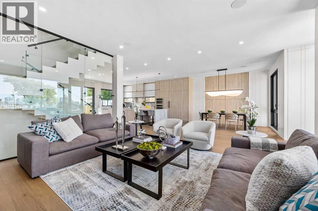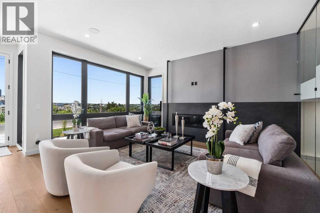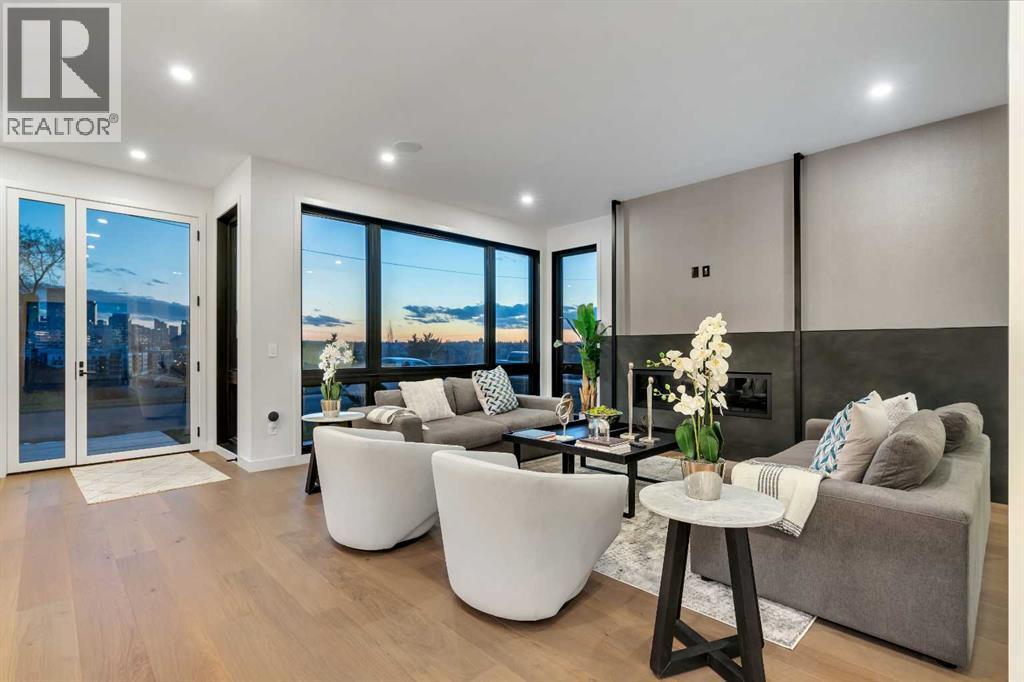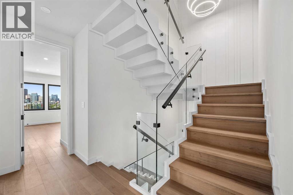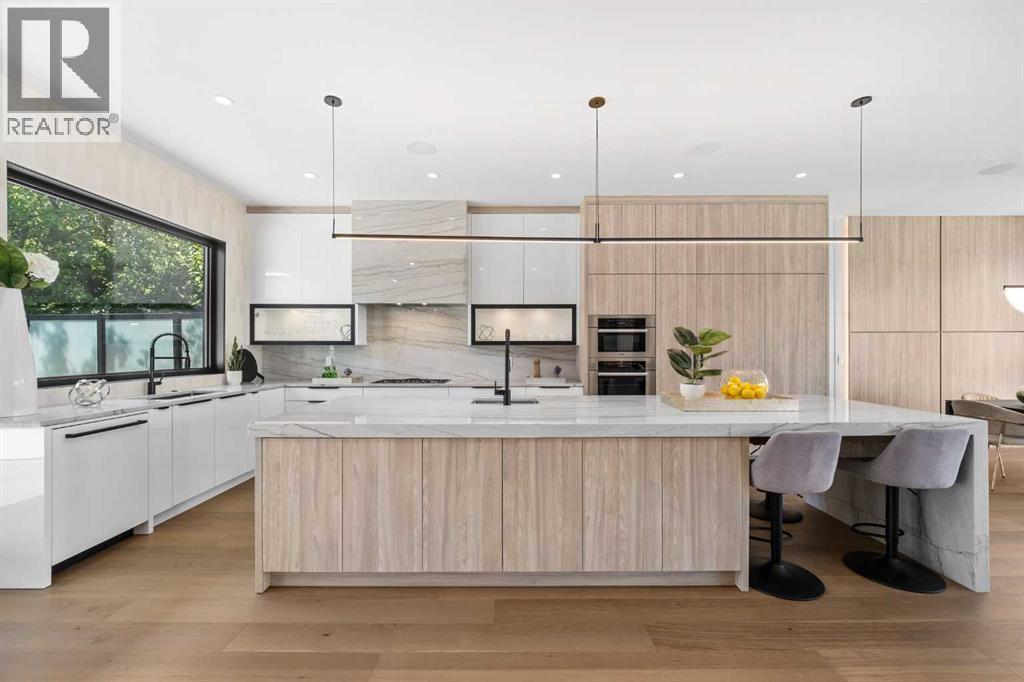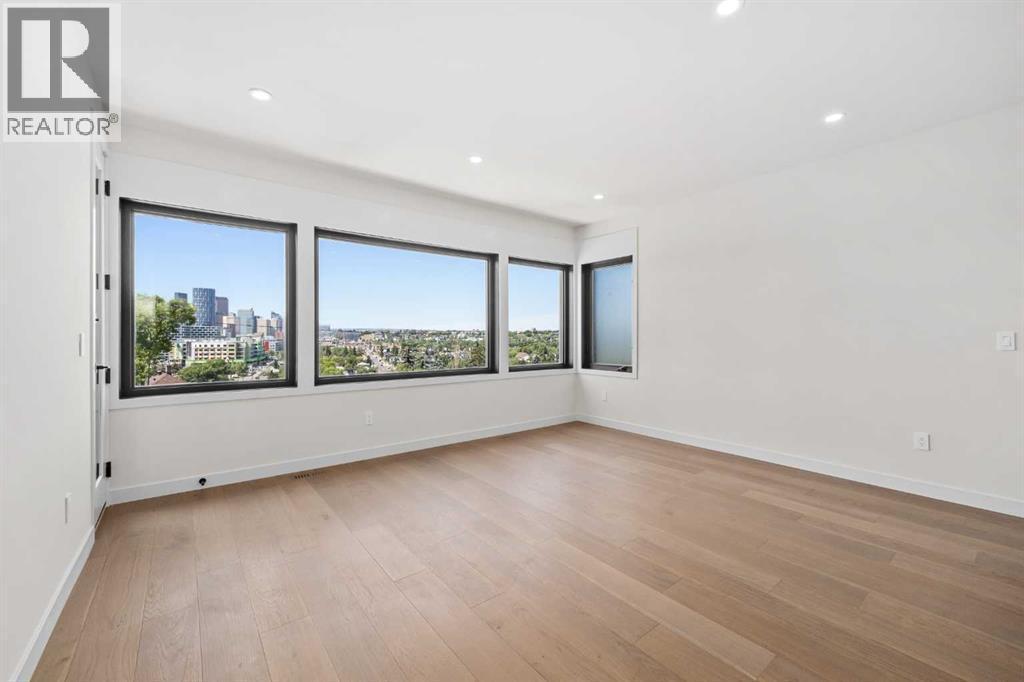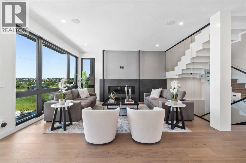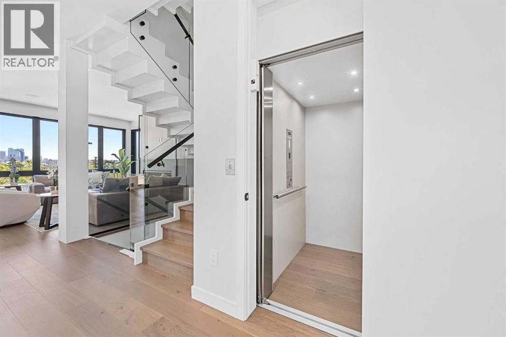 An architectural masterpiece by Silverpoint Custom Homes and Paul Lavoie Interior Design. Perched on a spectacular lot overlooking Bridgeland, and offering breathtaking views of the City and Rocky Mountains. A 5,200-square-foot gem, which seamlessly blends Hollywood Hills vibes, in a meticulous and one of a kind design. A fantastic open floor plan with a separate formal living and dining rooms overlooking the city. Boasting a truly magnificent kitchen, featuring a 13ft waterfall island and all MIELE appliances. Hardwood floors weave throughout the four levels including the basement, creating a harmonious atmosphere of seamless design. The main level surprises you with a hidden coat closet, a spacious mudroom, and a private den overlooking a backyard oasis with a large deck, (hot-tub ready) Move effortlessly between levels via the elevator or a captivating floor to ceiling glass-walled staircase leading to three generous bedrooms and a master top suite, simply like no other. The second floor offers 3 spacious bedrooms with panoramic city views from 2 bedrooms, private balconies, and a separate family lounge with access to a full guest bath. A fabulous laundry room and linen closet complete this level, not to mention large picture windows offering fulll sunrise worthy east views. The third-floor PRINCIPAL BEDROOM is a showstopper with a HUGE BALCONY showcasing the best panoramic city and mountain vews. A separate lounge area with coffee bar, fridge and a built in TV LIFT separate the bedroom area. As you enter the ensuite, flooded with natural light, a magical SMARTGLASS window gives you the option of privacy, or to enjoy the fabulous city views while soaking in the tub. A luxurious dual vanity, dual spa shower area surrounded by glass, featuring heated floors and shower bench. The walk-in wardrobe suite is a one of a kind dream space, with built in's that will rival a designer shop. Large skylights, a huge window and your own washer/dryer, make this the p erfect dressing area. The lower level caters to the extended family and features a media area with full bar, gym, and a large bedroom. A full bath including a steam shower completes this level with all heated hardwood flooring. The outdoor spaces surrounding the house lets you indulge in extended year round outdoor living. A large front patio with a fire pit option, and seating lets you indulge in the west city and mountain views. The rear yard offers you a great dining space, and private relaxation areas with an optional hot tub, and a multi purpose sports area or green space. This home as expected includes all Smart home features, an elevator, extensive internal glass walls, AC, infloor heat, and an oversized garage with a full third car garage option which can be built prior to possession for the buyer at cost. An amazingly unique home with modern, yet classic design elements, encompassing every luxury option a discerning home owner would desire in their dream home. (id:6769