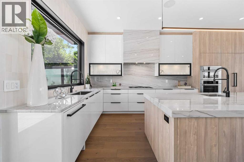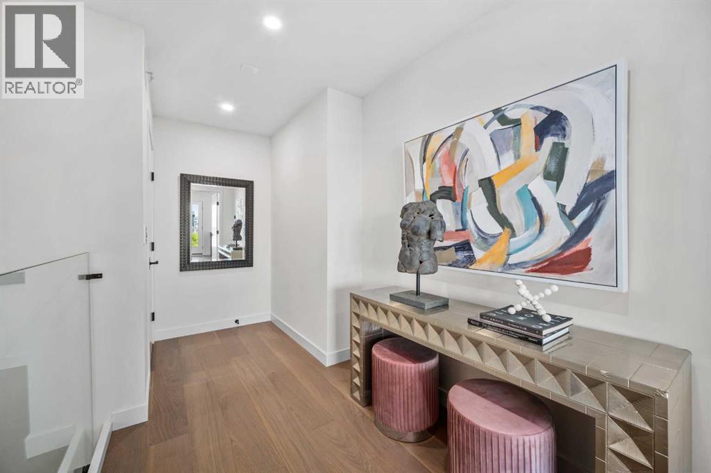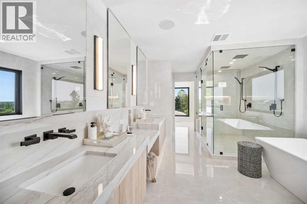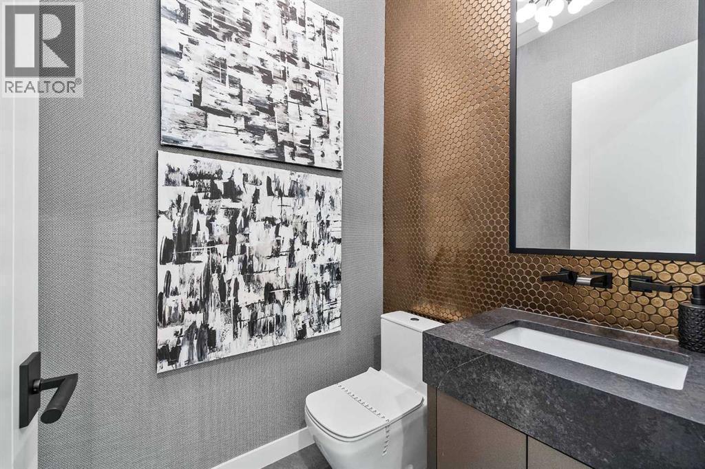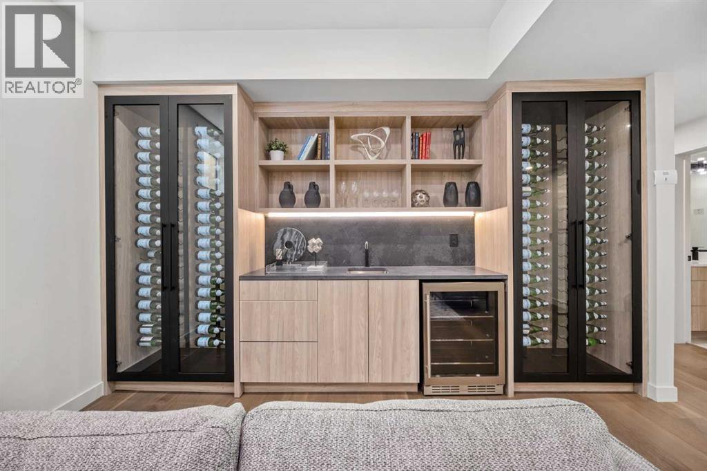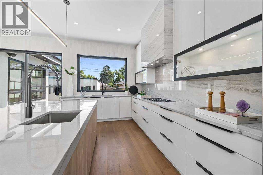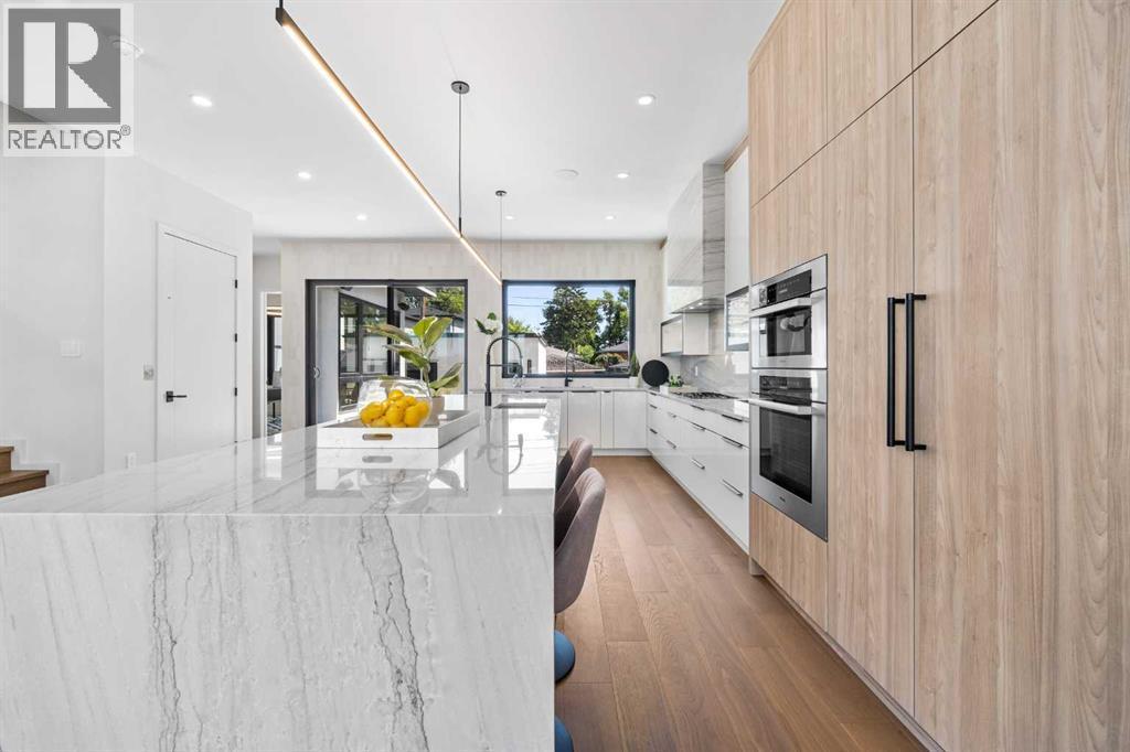 An architectural masterpiece by Silverpoint Custom Homes and Paul Lavoie Interior Design. Perched on a spectacular lot overlooking Bridgeland, and offering breathtaking views of the City and Rocky Mountains. A 5,200-square-foot gem, which seamlessly blends Hollywood Hills vibes, in a meticulous and one of a kind design. A fantastic open floor plan with a separate formal living and dining rooms overlooking the city. Boasting a truly magnificent kitchen, featuring a 13ft waterfall island and all MIELE appliances. Hardwood floors weave throughout the four levels including the basement, creating a harmonious atmosphere of seamless design. The main level surprises you with a hidden coat closet, a spacious mudroom, and a private den overlooking a backyard oasis with a large deck, (hot-tub ready) Move effortlessly between levels via the elevator or a captivating floor to ceiling glass-walled staircase leading to three generous bedrooms and a master top suite, simply like no other. The second floor offers 3 spacious bedrooms with panoramic city views from 2 bedrooms, private balconies, and a separate family lounge with access to a full guest bath. A fabulous laundry room and linen closet complete this level, not to mention large picture windows offering fulll sunrise worthy east views. The third-floor PRINCIPAL BEDROOM is a showstopper with a HUGE BALCONY showcasing the best panoramic city and mountain vews. A separate lounge area with coffee bar, fridge and a built in TV LIFT separate the bedroom area. As you enter the ensuite, flooded with natural light, a magical SMARTGLASS window gives you the option of privacy, or to enjoy the fabulous city views while soaking in the tub. A luxurious dual vanity, dual spa shower area surrounded by glass, featuring heated floors and shower bench. The walk-in wardrobe suite is a one of a kind dream space, with built in's that will rival a designer shop. Large skylights, a huge window and your own washer/dryer, make this the p erfect dressing area. The lower level caters to the extended family and features a media area with full bar, gym, and a large bedroom. A full bath including a steam shower completes this level with all heated hardwood flooring. The outdoor spaces surrounding the house lets you indulge in extended year round outdoor living. A large front patio with a fire pit option, and seating lets you indulge in the west city and mountain views. The rear yard offers you a great dining space, and private relaxation areas with an optional hot tub, and a multi purpose sports area or green space. This home as expected includes all Smart home features, an elevator, extensive internal glass walls, AC, infloor heat, and an oversized garage with a full third car garage option which can be built prior to possession for the buyer at cost. An amazingly unique home with modern, yet classic design elements, encompassing every luxury option a discerning home owner would desire in their dream home. (id:6769
