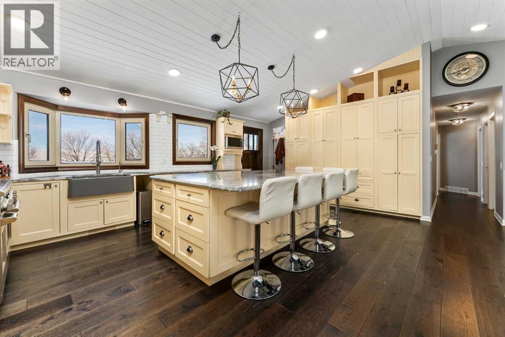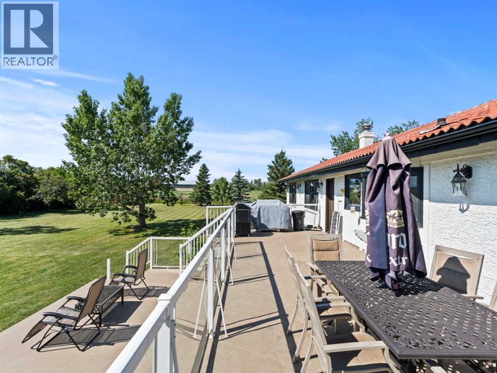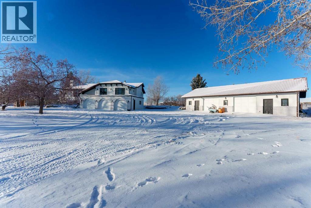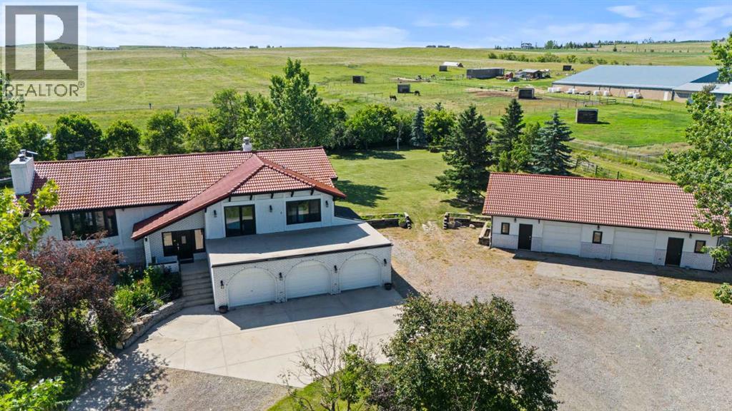 This exceptional 5-bedroom, 3-bath residence offers over 4,000 sq ft of beautifully appointed living space. It sits on 5 acres with sweeping mountain views and is set up for horses. Highlights include: extensive 2018 renovations, air conditioning, soaring ceilings, two fire places and a triple oversized garage. A striking entry with a curved staircase leads to a sun-filled living room featuring vaulted open-beam ceilings and a dramatic floor-to-ceiling stone wood-burning fireplace. The dining area opens to a west-facing deck, ideal for entertaining.The bright chef’s country kitchen is designed for gatherings, showcasing an oversized island, quartzite countertops, farmhouse sink, bar fridge, 6-burner gas range, and custom floor-to-ceiling cabinetry concealing the fridge/freezer. The spacious primary suite offers a walk-through closet and a spa-inspired 5-piece ensuite with a clawfoot tub.The walk-out lower level provides an inviting family retreat with fireplace, wet bar, generous entertaining space, two additional bedrooms, and a laundry/mudroom with garage access. The property features mature trees, garden or orchard areas, chain-link and pipe fencing, cross-fencing, a small barn, two stock waters, and a workshop.Perfect for a large family and entertaining, this exceptional home offers country living at its finest—just minutes from all amenities as it is conveniently situated between Okotoks and High River. (id:6769