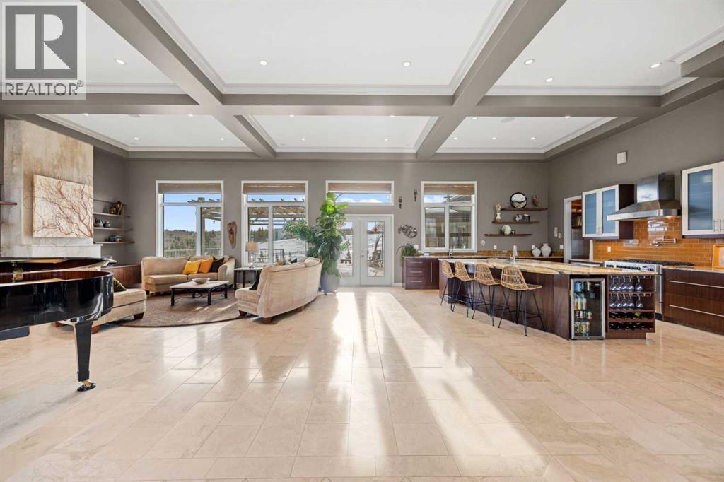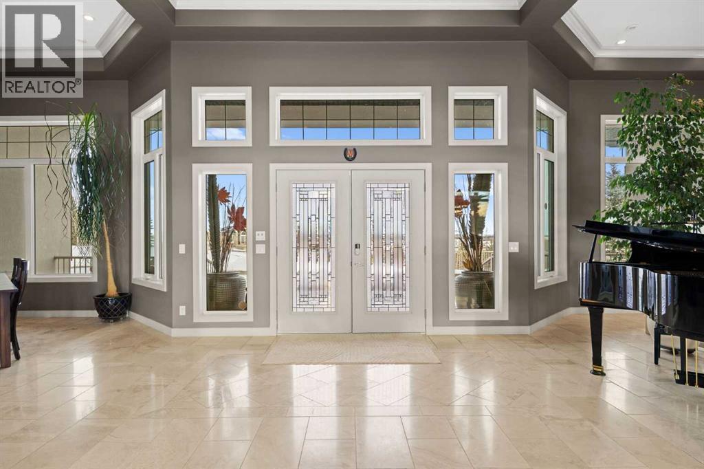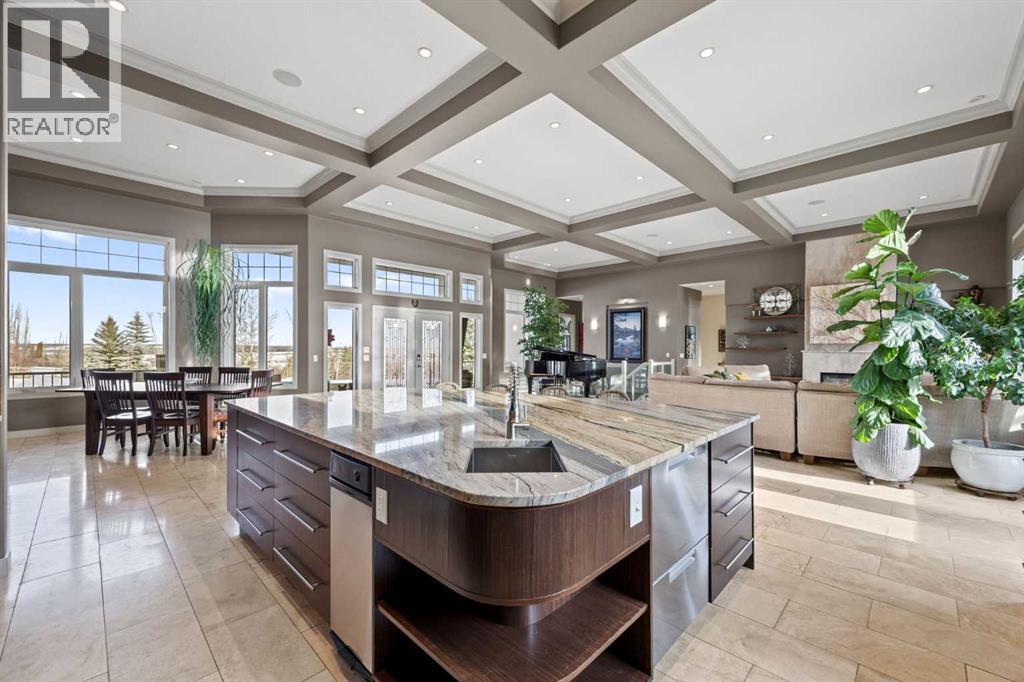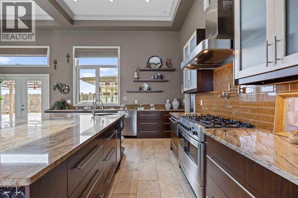 Set behind a gated entry and surrounded by mature landscaping, this extraordinary custom-built estate blends refined architecture with everyday comfort. Designed for both family living and entertaining, the home offers exceptional craftsmanship and thoughtful details throughout.The main gathering space is defined by soaring 13-foot coffered ceilings, oversized triple-pane windows, integrated speakers, and a striking floor-to-ceiling dual-sided marble gas fireplace. Natural stone Crema Viejo travertine tile flows throughout the main level, complemented by solid-core 10-foot doors and custom window coverings.At the heart of the home, the chef’s kitchen is built to perform, featuring a massive granite slab island, 6-burner gas range with dual electric ovens, pot filler, warming drawer, beverage fridge, and trash compactor. A dual sink and separate single sink—both with garburators—add functionality, alongside high-end appliances including a full-size Miele dishwasher and Fisher & Paykel dual drawer dishwasher. The butler’s pantry offers additional prep space with its own sink, oversized fridge, and oversized freezer.The main-floor primary suite is a private retreat, accessed through a dramatic 10-foot double-door entry. A dual-sided marble gas fireplace adds warmth and ambiance, while the spa-inspired ensuite features a Maxx Air hydrotherapy tub, glass shower with body jets, heated towel rack, electric fireplace, and Geberit in-wall toilet. A custom walk-in closet with built-in shelving, drawers, and pull-down rod completes the suite.Also on the main level are two additional bedrooms, each with its own private ensuite, including one with a Geberit toilet. Two powder rooms serve guests and daily living, one featuring a Geberit toilet. A den with curved bay windows offers a flexible office or sitting space. French doors at the front and back entries, slate-covered front deck, camera doorbell, mudroom with built-in shelving, and Miele washer and dryer complete the mai n floor.The walkout lower level features polished heated concrete floors (two zones), 9-foot ceilings, two additional bedrooms with private ensuites, oversized closets, a full wet bar with sink, dishwasher, fridge, and ice maker, pool table area, dedicated theatre room with projector and surround sound wiring, two flex rooms, and built-in bookshelf units. Outdoor living includes expansive deck spaces with a large rear deck and pergola, plus a front deck ideal for quiet enjoyment. The landscaped yard features mature trees, fire pit, children’s playset, and partial fencing. Additional highlights include a heated sunroom wired for a future sauna or hot tub, state-of-the-art water filtration with reverse osmosis, alarm system, two high-efficiency furnaces, and an oversized 1,062 sq ft heated garage with built-in shelving, RV hookups, under-eave outlets, paved driveway, and remote-controlled gate and garage. Close to the Ann & Sandy Cross Conservation Area. (id:6769