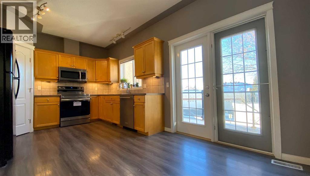 Welcome to this exceptional three-story semi-detached townhouse in Calgary’s Signal Hill community, offering a harmonious blend of comfort, style, and functionality.The main floor features an open-concept design with beautiful laminate flooring. The bright living room is centered around a stone gas fireplace and flows into the dining room to create the perfect setting for family gatherings or cozy evenings. The kitchen boasts a new electric stove, stunning mountain views, and a sunny breakfast nook where you can enjoy a morning coffee. Sliding doors lead to a southwest-facing deck, ideal for outdoor dining or relaxing at sunset.Upstairs, the primary bedroom impresses with mountain views, a spacious walk-in closet, and a four-piece en suite. Two additional bedrooms provide flexibility for family, guests, or a home office. The finished walk-out basement offers a comfortable family room for movie and game nights, laundry facilities, and direct access to a sheltered patio and a quiet inner courtyard with manicured lawns, providing your private retreat for peace and calm.Parking is never a concern with an attached double garage and extended driveway accommodating up to four vehicles. Exterior maintenance is professionally managed, so you can enjoy a low-maintenance lifestyle with peace of mind, especially with the new roof installed in June 2025. This home combines convenience and elegance in a prime location, just minutes from Signal Hill and Westhills shopping centers, top-rated schools, Signal Hill Library, Westside Recreation Centre, Griffith Woods, and a variety of restaurants. With easy access to Stoney Trail, Glenmore Trail, and Sarcee Trail, you’re perfectly positioned for quick trips to downtown or weekend escapes to the mountains. (id:6769