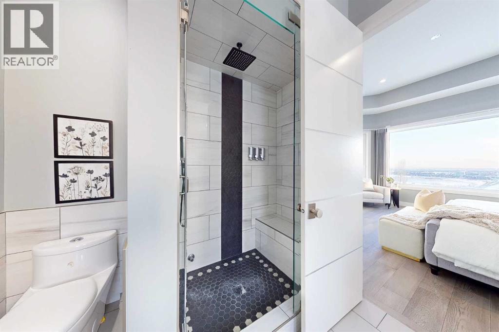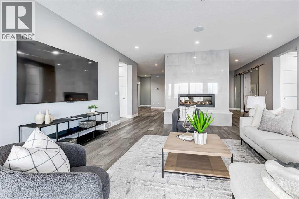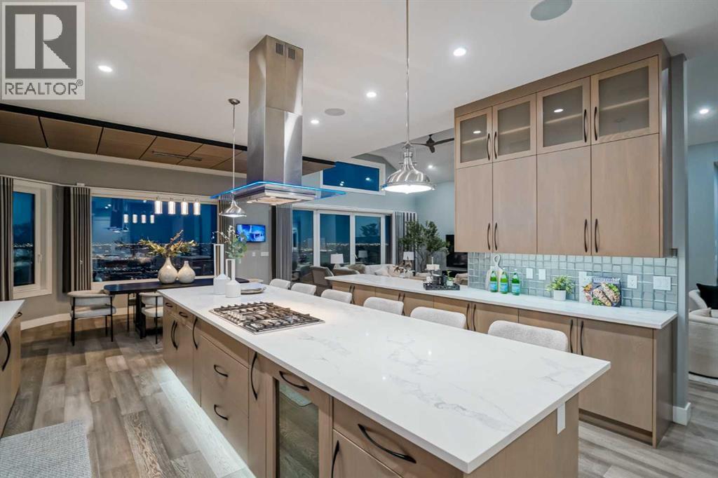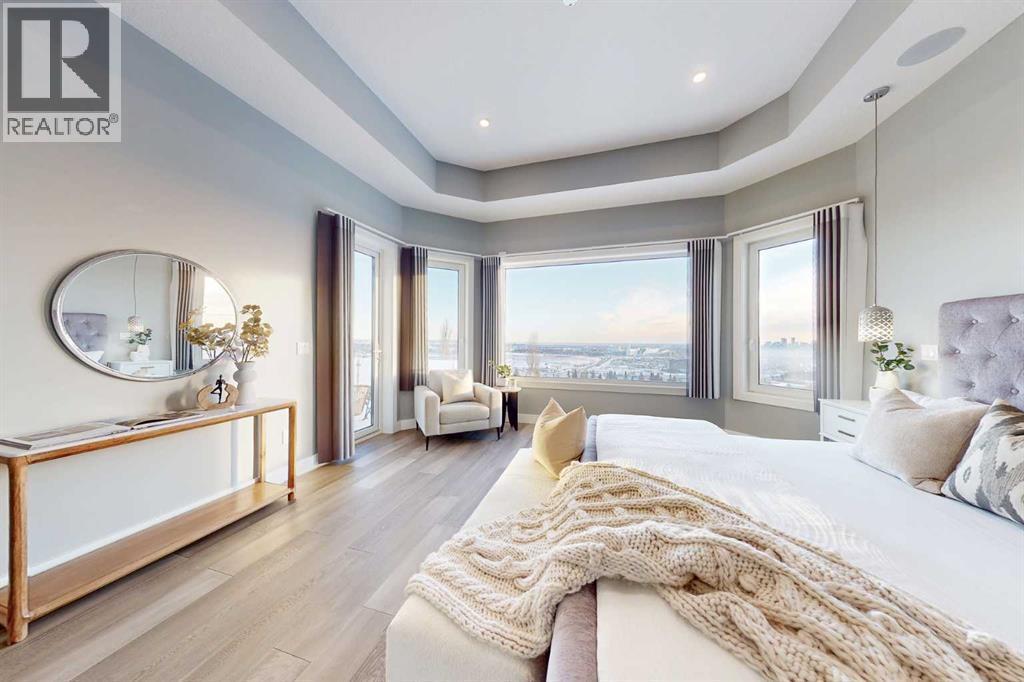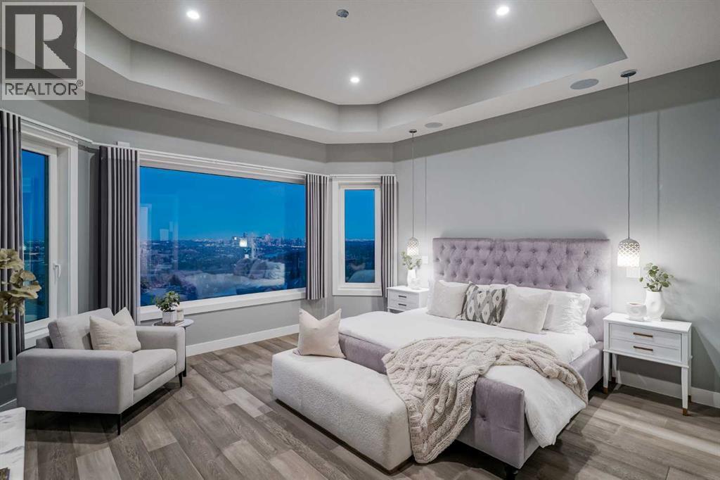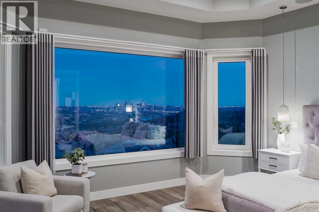 Perched high above the city in the prestigious community of Patterson, this custom luxury bungalow offers unobstructed, panoramic views of downtown Calgary and the skyline from all three fully developed walkout levels. Architecturally designed and built to a high standard, the home blends refined design, functionality, and long-term livability in a private, elevated setting just minutes from the city core.The main level is designed for sophisticated single-level living, with expansive windows that flood the home with natural light and frame breathtaking city views. The open-concept living and dining areas are anchored by a striking see-through gas fireplace, creating warmth and architectural interest while maintaining uninterrupted sightlines. Vaulted and tray ceilings enhance the sense of scale, complemented by wide-plank engineered hardwood flooring and timeless finishes. The chef-inspired kitchen features premium cabinetry, a large central island, high-end appliances, and seamless flow into the dining area, ideal for entertaining. A fully equipped spice kitchen provides additional prep space and storage. The primary suite is a private retreat with panoramic views and a spa-inspired ensuite featuring heated floors, a deep soaker tub, steam shower, and walk-in closet. A private office or den, powder room, breakfast nook, and functional mudroom with direct garage access complete this level.The first lower level is fully developed and walkout, offering excellent flexibility while maintaining the same level of finish. This level includes a spacious recreation room, family lounge with city views, a dedicated home gym with custom flooring and sliding glass barn doors, two generously sized bedrooms, beautifully finished bathrooms, a full laundry room, and direct outdoor access.The lowest level is designed for entertainment and guests, featuring a large media and theatre room with golf simulator capability, a kitchenette or wet bar, additional bedrooms, a full bathr oom, second laundry area, and integrated storage and mechanical spaces.Additional highlights include a heated triple attached garage with exceptional ceiling height allowing for a vehicle lift, epoxy flooring, side wall-mounted openers, and space for up to four vehicles. The home is roughed-in for a future elevator and offers multiple walkout patios and decks with glass railings and gas connections. Integrated audio, smart lighting, premium mechanical systems, and an optional landscaping package further enhance the property.Located in one of Calgary’s most desirable westside communities, Patterson is known for its elevated setting, mature surroundings, city views, and proximity to downtown, parks, and amenities. (id:6769