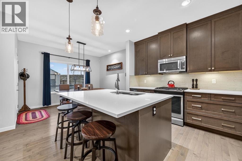Welcome to this beautifully curated and move-in-ready 3 bedroom, 2.5 bathroom semi-detached (half duplex) in the highly desirable community of Fireside in Cochrane. Thoughtfully designed and meticulously maintained, this two-storey home with a fully developed basement offers elevated finishes, functional living spaces, and an exceptional outdoor setting backing onto municipal reserve green space and a regional pathway, providing privacy, open views, and no neighbours directly behind.The main floor features a bright, open-concept layout with hardwood flooring throughout, seamlessly connecting the living room, dining area, and kitchen. The living room is anchored by a cozy fireplace with a tiled surround and elegant mantel, creating a welcoming space for family gatherings or quiet evenings. The kitchen blends style and function with quartz countertops, ceiling-height cabinetry, soft-close doors and drawers, stainless steel appliances including a gas stove, upgraded lighting, and additional pot lights. Large south-facing windows flood the home with natural light and frame peaceful green space views, while central air conditioning and professionally installed UV sun film enhance year-round comfort and energy efficiency.Upstairs, you’ll find three spacious bedrooms, including a serene primary retreat overlooking the reserve with picturesque west-facing mountain views, a generous 5-piece ensuite, and ample closet space. The additional bedrooms are ideal for children, guests, or a home office, with one offering a walk-in closet. A full 4-piece bathroom and convenient upper-level laundry with NEW washer and dryer (2025) complete this level.The fully developed basement adds valuable living space with a versatile recreation area perfect for movie nights, a playroom, home gym, or office, along with ample storage to keep everything organized.Outside, enjoy a sunny south-facing backyard designed for both relaxation and functionality. The space includes raised garden boxes, a storage shed, and direct access to the reserve and regional pathway system, ideal for family walks, runners, and cycling enthusiasts.Additional highlights include a double insulated garage with storage, upgraded tile at the garage entry and bathrooms, quartz counters throughout, keyless entry, and full professional landscaping, making this home truly turn-key.This home is MOVE-IN READY, just a short walk to Fireside School (K–8) and Holy Spirit Catholic School (K–8), along with scenic walking paths, playgrounds, restaurants, an NHL-sized outdoor hockey rink, baseball diamond, and three soccer fields located in the heart of the community. A gas bar, pharmacy, and everyday conveniences are close by. Fireside is a complete, thoughtfully planned community offering schools, parks, open spaces, and commercial amenities. Its strong walkability encourages an active, family-oriented lifestyle, all just 15 minutes to Calgary and 45 minutes to the heart of the Rocky Mountains. (id:6769