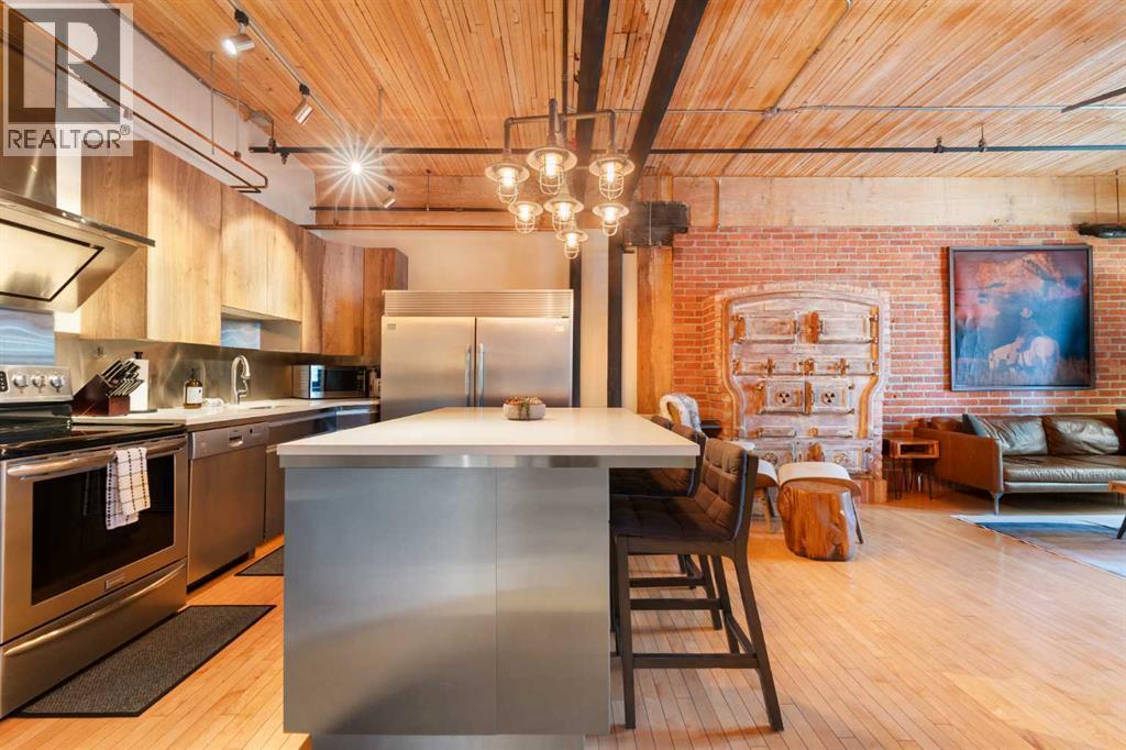 Downtown living at its finest, right on vibrant 10th Avenue SW, just steps from some of Calgary’s coolest restaurants, cafés, and nightlife. This exceptional loft is located in Calgary’s oldest warehouse, originally built in 1909 by the Hudson’s Bay Company, and thoughtfully converted into distinctive residential and commercial live-in lofts. The open-concept layout proudly showcases the building’s heritage, featuring original fir wood ceilings, exposed brick, drop-down beams, and exposed piping, all seamlessly complemented by sleek contemporary finishes. The gourmet kitchen is thoughtfully designed for both form and function, offering stainless steel appliances, a Miele dishwasher, quartz countertops, a Frigidaire refrigerator, and custom cabinetry. A striking central island provides the perfect setting for casual dining or entertaining. Steeped in history yet effortlessly modern, this space showcases true industrial elegance with soaring 13-foot ceilings and original architectural character that speaks to its storied past and inspires creativity and innovation in every corner. Large windows flood the loft with natural light, enhancing the open-concept layout and emphasizing the rich textures and craftsmanship found throughout. One of the few buildings that allows both residential and commercial use, this versatile loft offers flexibility as a stylish home with generous living and dining spaces or as an inspiring professional workspace, complete with a convenient two-piece bathroom. The expansive bedroom—easily adaptable as a premium office—features a luxurious ensuite with a tub and separate shower, along with a spacious closet. French doors open to a Juliet balcony, filling the space with natural light and fresh air. This is loft living redefined—a rare fusion of heritage and contemporary style. The raw, artistic aesthetic creates a canvas for personal expression, while the expansive layout offers flexibility for both everyday living and entertaining. Whether yo u’re drawn to its vintage charm, creative energy, or unbeatable downtown location, this loft offers a unique urban sanctuary in the heart of Calgary. The building features private underground parking, a generous separate storage space, and a fitness facility. A true blend of heritage meets modernity, this one-of-a-kind residence is perfect for those who appreciate history, character, and the energy of inner-city living. (id:6769