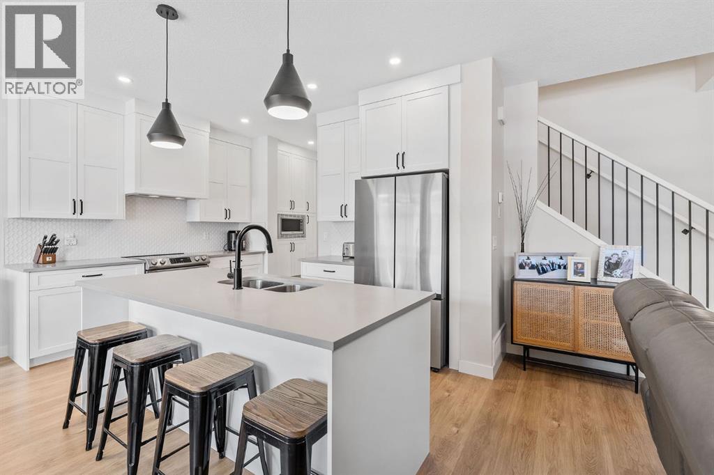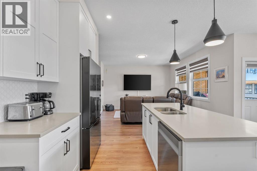 This is the one. A fully finished two-storey home, steps from major shopping and set in one of Airdrie’s most desirable communities. Designed with real family living in mind, this residence offers over 2,300 sq ft of developed space, a bright south-facing backyard, double detached garage, and a fully finished basement—plenty of room to live, host, and grow.From the welcoming foyer, the open-concept main floor flows effortlessly between the living room, dining area, and kitchen. Large windows flood the space with natural light, while the south-facing deck creates the perfect setup for summer BBQs and outdoor hangouts.The kitchen is the heart of the home—functional, stylish, and built to gather. Highlights include a quartz island overlooking the living space, ceiling-height shaker cabinetry, stainless steel appliances, a built-in pantry with microwave, and upgraded lighting throughout.Upstairs, the primary suite is a true retreat with a walk-in closet and a spa-inspired 5-piece ensuite featuring dual vanities, a soaker tub, and a standalone shower. A spacious bonus room offers flexible space for movie nights, a home office, or kids’ zone. Two additional full-sized bedrooms, a 4-piece bathroom, and an upper-level laundry room complete this level.The fully finished basement adds serious value with a fourth bedroom, large recreation area, and a full 3-piece bathroom—ideal for guests, teens, or multi-generational living.Enjoy evenings on the covered, south-facing balcony with a gas line for grilling, overlooking shared green space for a calm, family-friendly vibe.Additional upgrades include 9-foot ceilings on the main floor and basement, Central air conditioning, and upgraded lighting throughout, gas line on the rear balcony.Condo fees include common area maintenance, exterior insurance, and reserve fund contributions—making life simpler and more predictable.This home delivers where it counts: space, comfort, style, and location. Solid value. Smart move. Welcome h ome. (id:6769