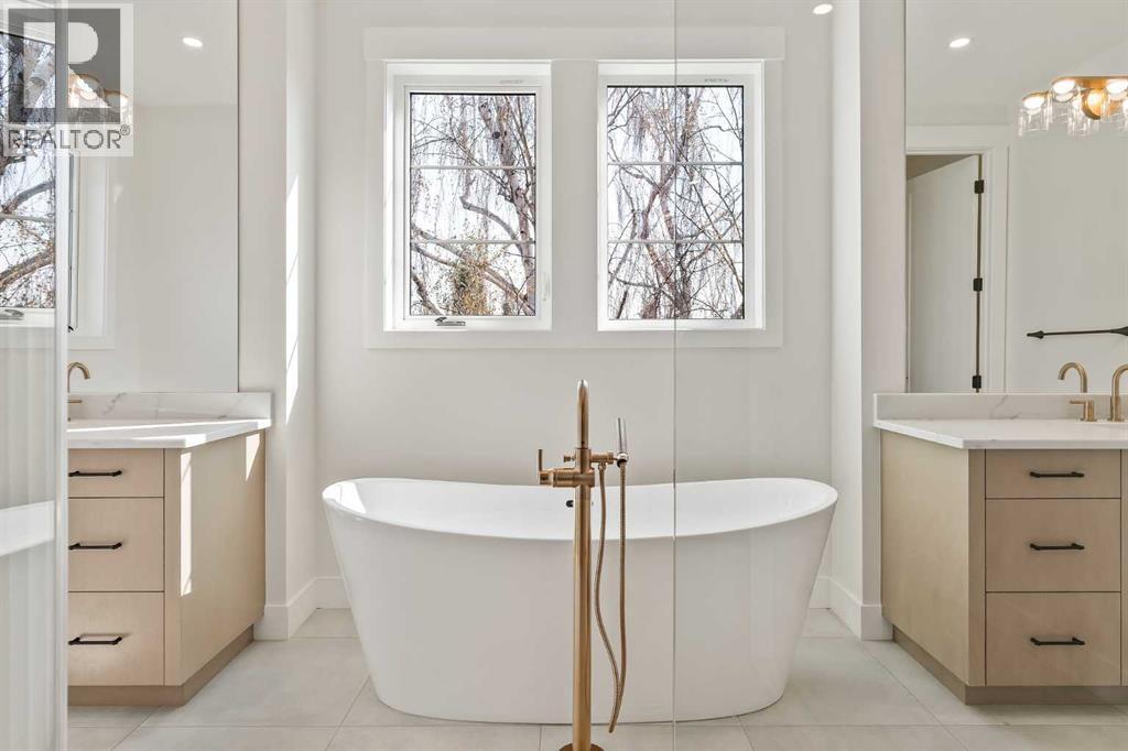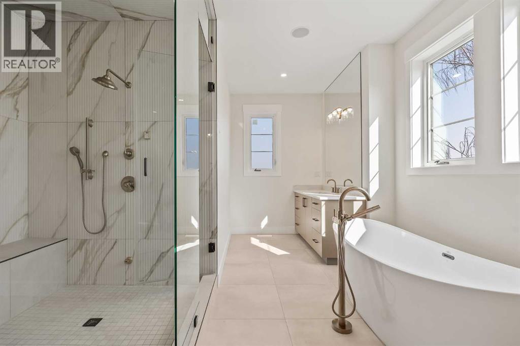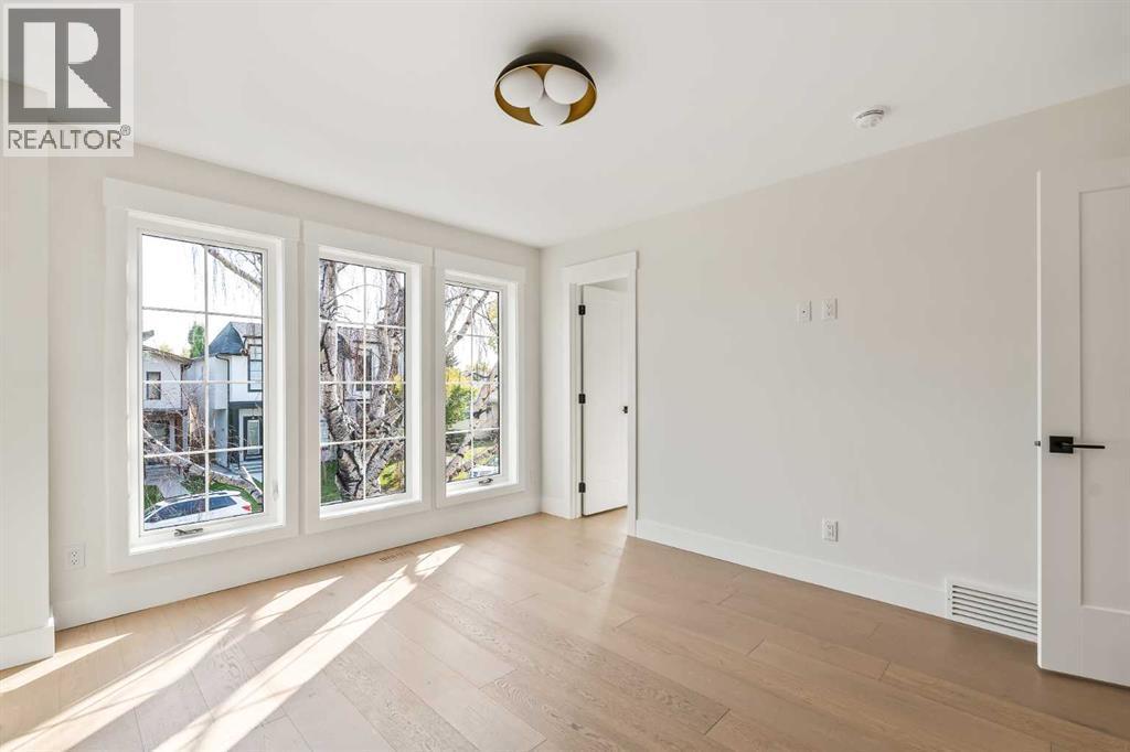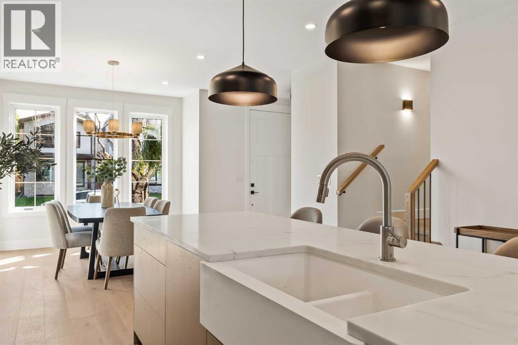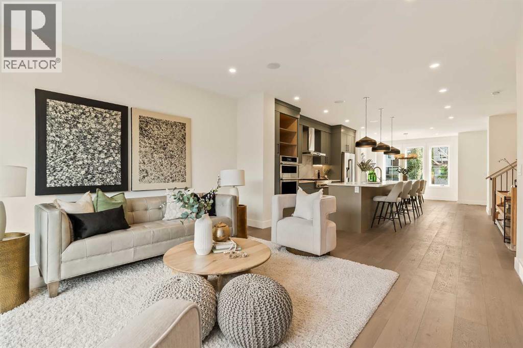 Presenting a stunning urban-inspired masterpiece in the coveted community of Killarney. Thoughtfully designed & impeccably crafted, this three-story residence offers over 3650 SF of refined living space. The open-concept main floor showcases striking architectural details, including white oak hardwood floors, custom-milled cabinetry, oak & metal railings, & expansive windows that bathe the interior in natural light. The kitchen stands as a true showpiece featuring bespoke cabinetry with undermount lighting, exquisite quartz slab countertops & backsplash, premium JennAir appliances, Silgranit sink, & a impressive 12-foot island with seating for five. In the living area, a handsome floor-to-ceiling fireplace surround, & 8-foot garden doors make a bold yet sophisticated statement while white oak hardwood, mullioned windows, & an inviting dining area further elevate the curated, light-filled main floor. Completing the level is a convenient mudroom with built-ins & a pretty powder room. The gorgeous oak hardwood continues to the second level where the centrally situated bonus room is flanked by two distinguished bedrooms, each boasting its own ensuite with custom vanities, quartz counters, & beautifully tiled showers with glass doors while spacious walk-in closets with built-ins & large windows enhance the comfort & appeal of these inviting retreats. The third level is a sanctuary of elegance and comfort. The airy primary suite is flooded with natural light & features expansive sliding doors to a private balcony perfect for enjoying quiet morning coffee from the convenient beverage centre. The stunning ensuite exudes spa-like luxury with double custom oak vanities & refined quartz countertops, a dramatic steam shower, in-floor heating, & an opulent stand-alone waterfall tub. Completing this exceptional level is a considerable walk-in closet with extensive custom millwork. The professionally developed lower level delivers 900 SF of living space built with the same attent ion to detail. Providing a spacious family room, wet bar, fitness area, 4th bedroom with walk-in closet, & 5th bathroom this additional level makes an ideal area for entertaining or accommodating family members & guests. Equally impressive is the extraordinary curb appeal displaying genuine brick accents, James Hardie board cladding, acrylic stucco, mullioned windows, & an aggregate patio. The quiet West-facing backyard offers a tranquil setting perfect for children at play, summer barbecues, or simply unwinding at the end of the day. Other notable highlights of this remarkable residence include a double insulated & drywalled garage, Ply Gem windows with 2-year warranty, Delta fixtures, & 200-amp panel. Situated close to parks, shopping, schools, transit, & 17th Ave, this extraordinary property delivers a beautiful lifestyle in an excellent Killarney location. Welcome home to 2015 – 34 St SW where exceptional design meets timeless luxury. PHOTOS ARE FROM UNIT 2013. Unit 2015 has a different colour palette (id:6769